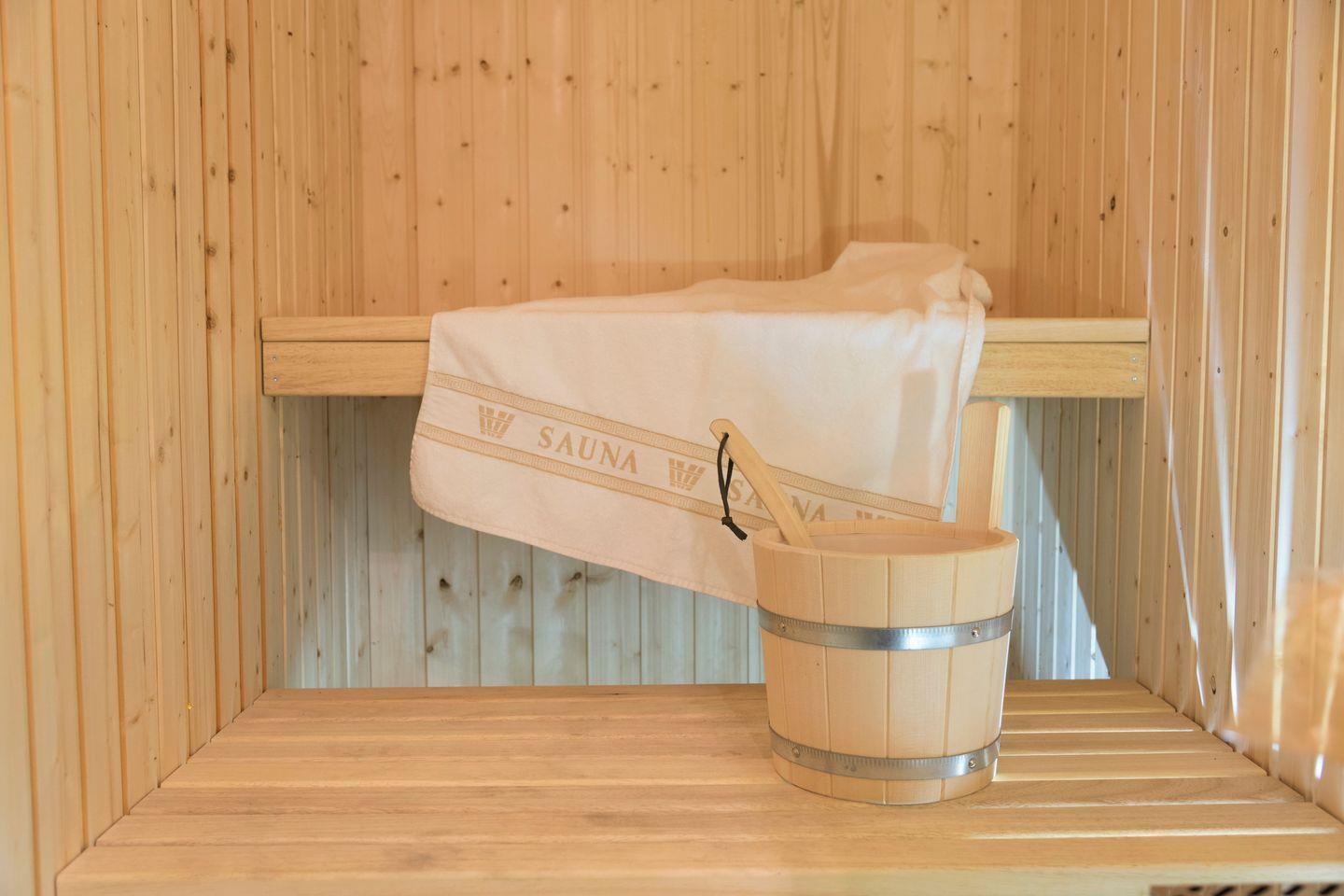 Ein stilvolles Badezimmer mit Badewanne, Tageslicht, Dusche, WC, Doppelwaschtisch, Kosmetikspiegel und Föhn sowie ein separates Gäste-WC stehen euch zur Verfügung. Ein weiteres Highlight ist die private Sauna im Badezimmer des Hauses. Genießt hier eure kleine Wohlfühloase und entspannt nach Lust und Laune.