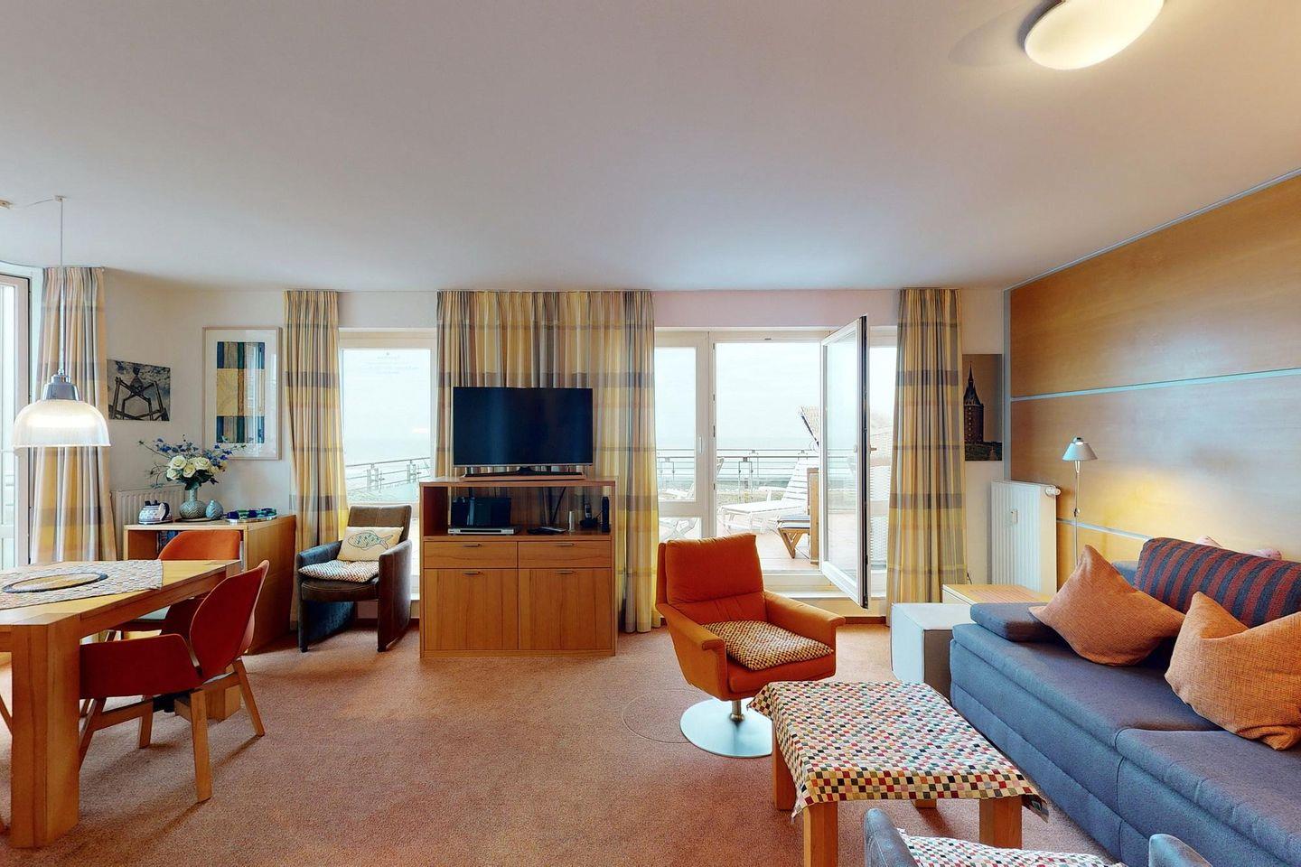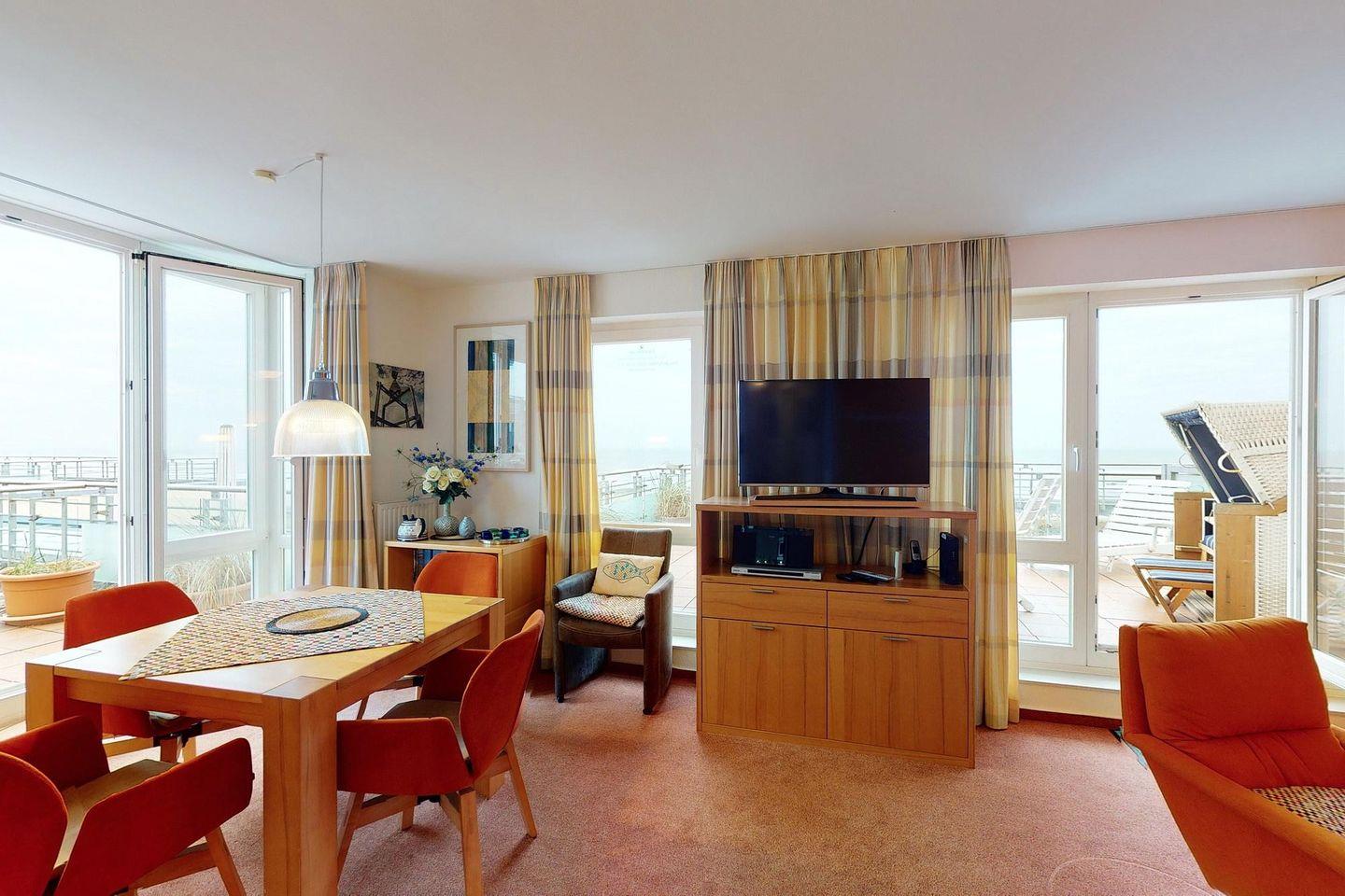 Die 69 m² große 2-Zimmer Ferienwohnung ist für bis zu 3 Personen geeignet. Besonders hervorzuheben ist die große Dachterrasse mit Strandkorb und großartigem Meerblick. Hier werdet ihr allabendlich vom Rauschen der Nordsee in den Schlaf gewiegt.