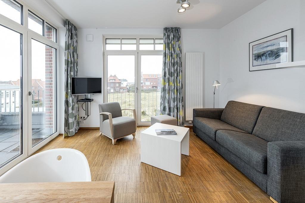 Das barrierearme und helle Apartment verfügt über kostenfreies WLAN und eine voll ausgestattete offene Küche mit Geschirrspüler, Gefrierfach, Kaffeemaschine, Toaster, Wasserkocher, Backofen und Waschmaschine. Es stehen euch zwei Schlafzimmer mit jeweils einem Doppelbett zur Verfügung. Im Wohnbereich befindet sich eine Doppelschlafcouch sowie ein Flatscreen-TV. Ein Kinderbett kann gegen Entgelt aufgestellt werden. Im modernen und hellen Badezimmer befindet sich eine begehbare Dusche sowie ein Waschtisch mit Föhn und Kosmetikspiegel. Auf dem großen und sonnigen Südbalkon, der sowohl vom Wohn- als auch vom Schlafzimmer begehbar ist, könnt ihr den ganzen Tag die Sonne bei wohltuendem Meeresklima genießen.