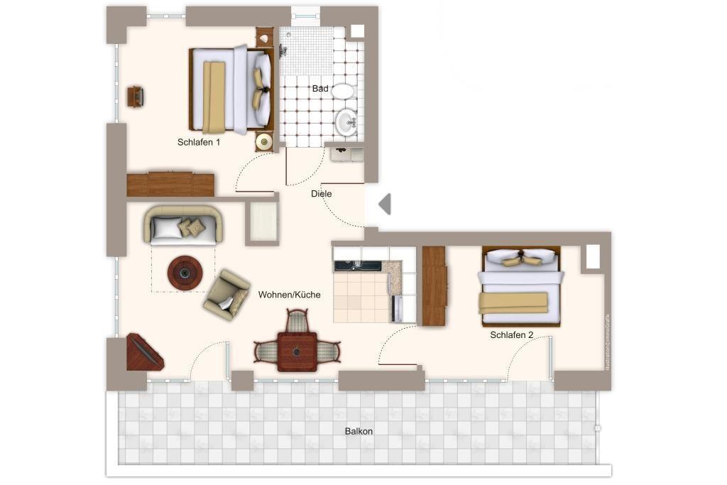 Die 64 m² große 3-Zimmer Ferienwohnung ist für bis zu 6 Personen geeignet. Besonders hervorzuheben ist der sonnige und großzügige Balkon in Südlage.