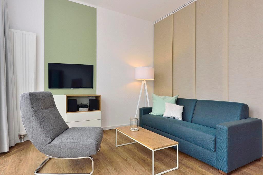 Das Apartment ist mit einer kleinen, aber feinen Pantryküche ausgestattet. Diese verfügt u. a. über ein Gefrierfach, eine Kaffeemaschine, einen Toaster und einen Wasserkocher. Im stilvollen Badezimmer befinden sich eine begehbare Dusche sowie ein Waschtisch mit Föhn und Kosmetikspiegel. Das moderne Wohn- und Schlafzimmer bietet euch einen großen Flatscreen-TV, eine HiFi-Anlage und eine Einzelschlafcouch. Ein Kinderbett kann gegen Entgelt im Wohnbereich aufgestellt werden. Nach einem erholsamen Urlaubstag könnt ihr auf der westseitigen Terrasse mit eigenem Strandkorb entspannen.