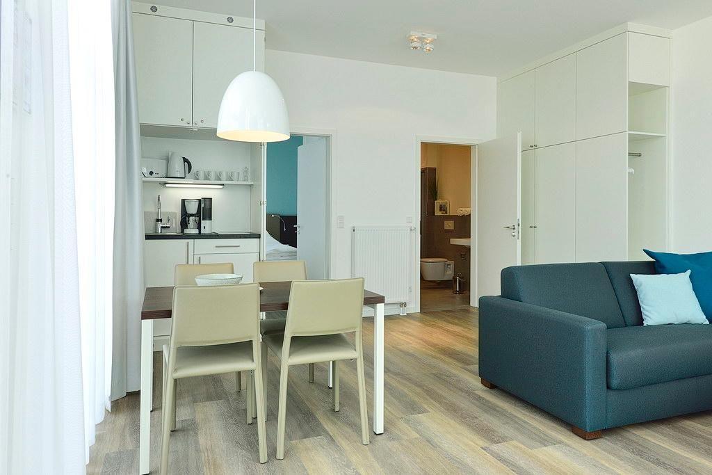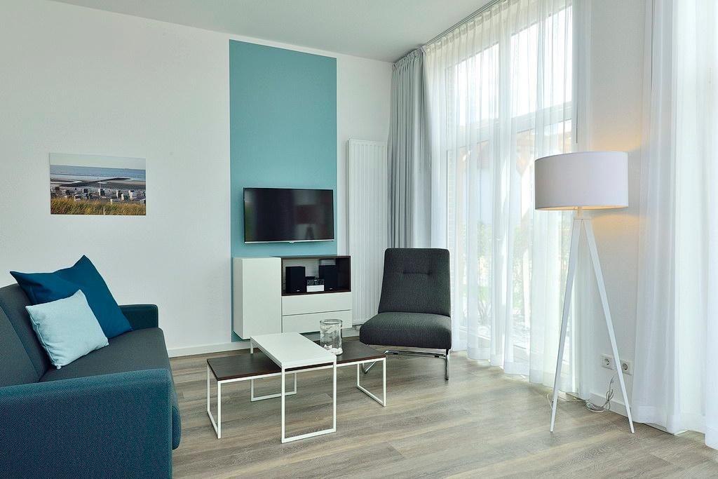 Das Apartment ist mit einer kleinen, aber feinen Pantryküche ausgestattet. Diese verfügt u. a. über ein Gefrierfach, eine Kaffeemaschine, einen Toaster und einen Wasserkocher. Im stilvollen Badezimmer befinden sich eine begehbare Dusche sowie ein Waschtisch mit Föhn und Kosmetikspiegel. Das moderne Schlafzimmer verfügt über ein Doppelbett und einen LED Fernseher, im Wohnzimmer stehen euch ein großer Flatscreen-TV, eine HiFi-Anlage und eine Einzelschlafcouch zur Verfügung. Ein Kinderbett kann gegen Entgelt im Wohnbereich aufgestellt werden. Nach einem erholsamen Urlaubstag könnt ihr wahlweise auf den beiden Terrassen entspannen. Das Apartment verfügt neben den Gartenmöbeln für 4 Personen über einen eigenen Strandkorb.