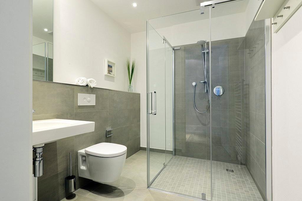 Das Apartment ist mit einer kleinen, aber feinen Pantryküche ausgestattet. Diese verfügt u. a. über ein Gefrierfach, eine Kaffeemaschine, einen Toaster und einen Wasserkocher. Im stilvollen Badezimmer befinden sich eine große, begehbare Dusche sowie ein Waschtisch mit Föhn und Kosmetikspiegel.