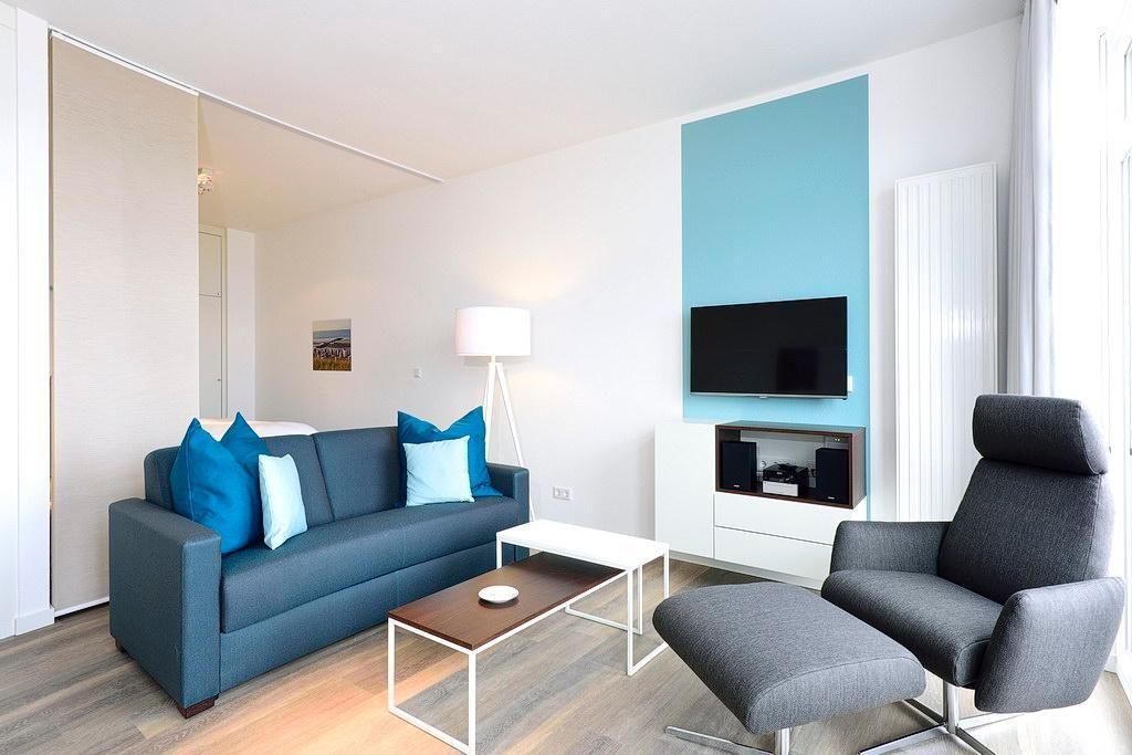 Das Apartment verfügt über ein Wohn-Schlafzimmer mit Doppelbett und Einzelschlafcouch, einen großen Flatscreen-TV und eine HiFi-Anlage. Der Schlafbereich mit dem Doppelbett lässt sich durch ein Schiebeelement vom Wohnbereich separieren. Ein Kinderbett kann gegen Entgelt im Wohnbereich aufgestellt werden.