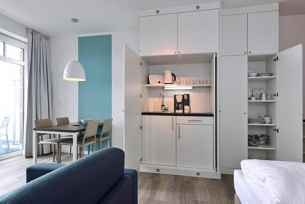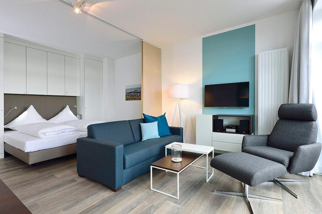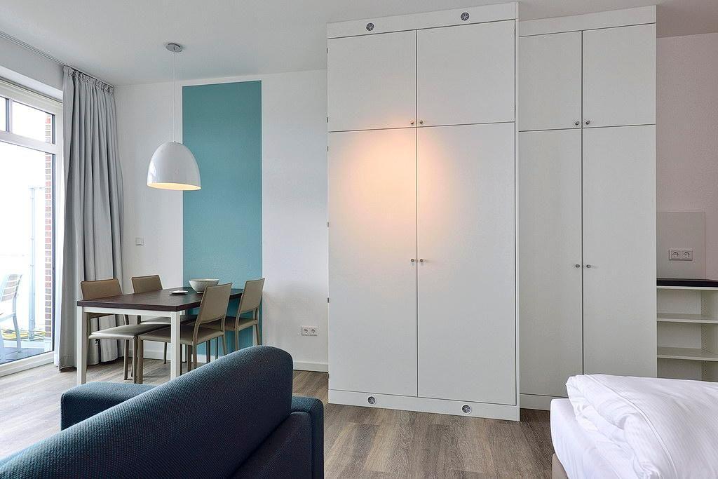 Das moderne Apartment verfügt über ein Wohn-/Schlafzimmer mit Doppelbett und Einzelschlafcouch, einen großen Flatscreen-TV und eine HiFi-Anlage. Der Schlafbereich mit dem Doppelbett lässt sich durch ein Schiebeelement vom Wohnbereich separieren. Ein Kinderbett kann gegen Entgelt im Wohnbereich aufgestellt werden.
