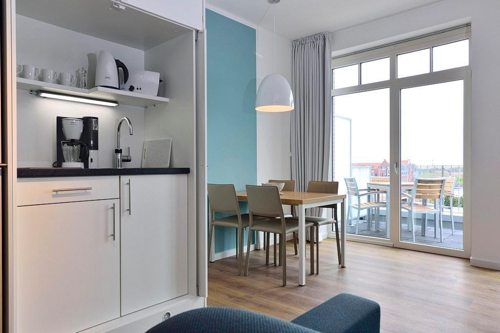 Das barrierearme Apartment ist mit einer kleinen, aber feinen Pantryküche ausgestattet. Diese verfügt u. a. über ein Gefrierfach, eine Kaffeemaschine, einen Toaster und einen Wasserkocher. Im stilvollen und großzügigen Badezimmer befinden sich eine große, begehbare Dusche sowie ein Waschtisch mit Föhn und Kosmetikspiegel.