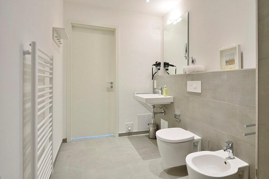Das barrierearme Apartment ist mit einer kleinen, aber feinen Pantryküche ausgestattet. Diese verfügt u. a. über ein Gefrierfach, eine Kaffeemaschine, einen Toaster und einen Wasserkocher. Im stilvollen Badezimmer befinden sich eine große, begehbare Dusche sowie ein Waschtisch mit Föhn und Kosmetikspiegel sowie ein Bidet.
