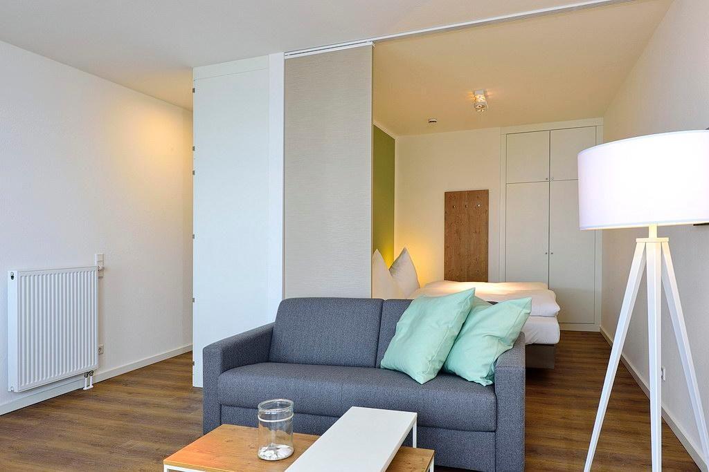 Das Apartment verfügt über ein Wohn-Schlafzimmer mit Doppelbett und Einzelschlafcouch, einen großen Flatscreen-TV und eine HiFi-Anlage. Der Schlafbereich mit dem Doppelbett lässt sich durch ein Schiebeelement vom Wohnbereich separieren. Ein Kinderbett kann gegen Entgelt im Wohnbereich aufgestellt werden.
