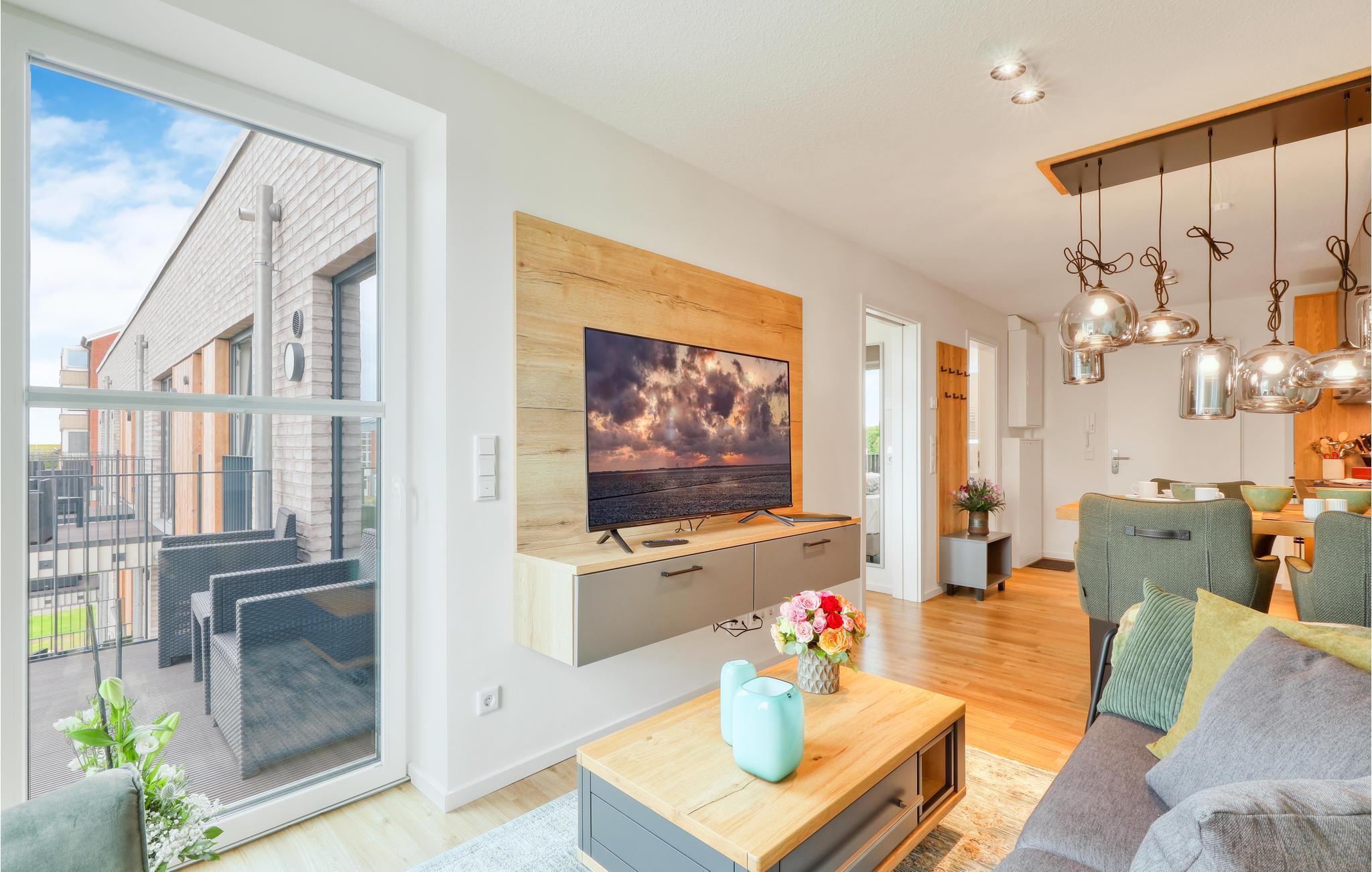 Herzlich willkommen auf Nordstrand, einer traumhaften Halbinsel an der schleswig-holsteinischen Nordseeküste im UNESCO Weltnaturerbe Wattenmeer. Das moderne Haus mit mehreren Ferienwohnungen ist ein wahres Juwel inmitten der Natur, die Lage direkt hinter dem Deich lässt das Herz eines jeden Nordseefans höherschlagen. Der moderne maritime Ausdruck der exklusiven Ferienwohnung versetzt Sie sofort in Urlaubsstimmung. Großzügige Fensterfronten lassen viel Tageslicht herein und bieten einen atemberaubenden Blick auf die umliegende Landschaft, den Sie schon beim Aufwachen genießen können. Mit seinem Fokus auf Nachhaltigkeit ist das Ferienhaus der ideale Ort für Urlauber, die Wert auf Erholung in Einklang mit der Natur legen. Beginnen Sie Ihren Tag mit einem leckeren Frühstück im gemütlichen Wohnzimmer mit offener Küche oder genießen Sie den ersten Kaffee auf dem Balkon.