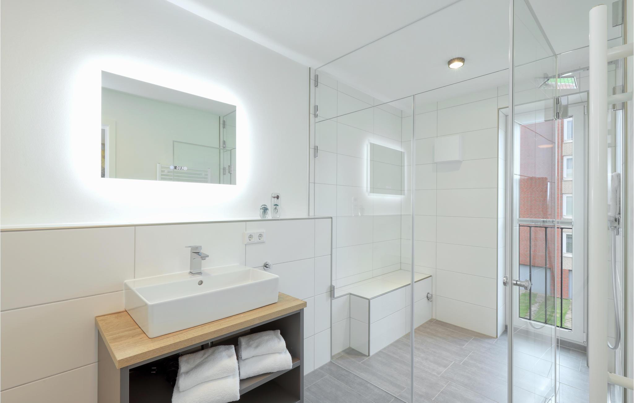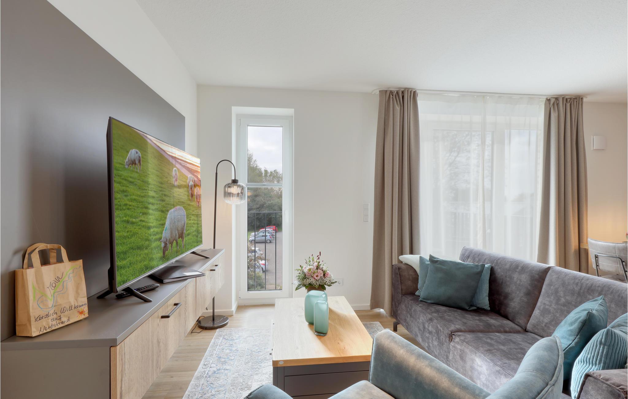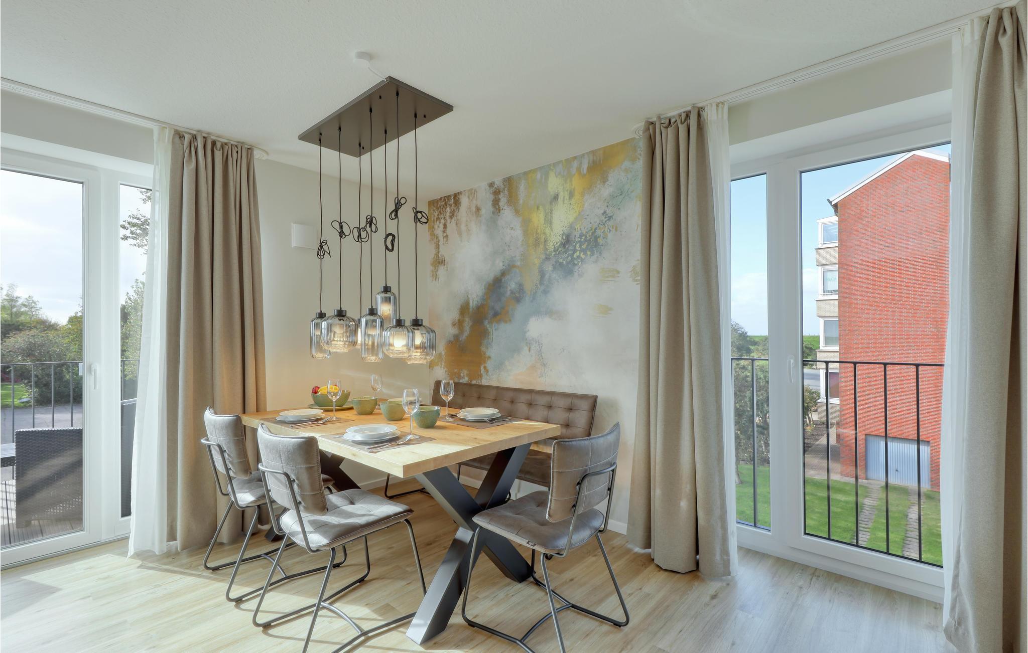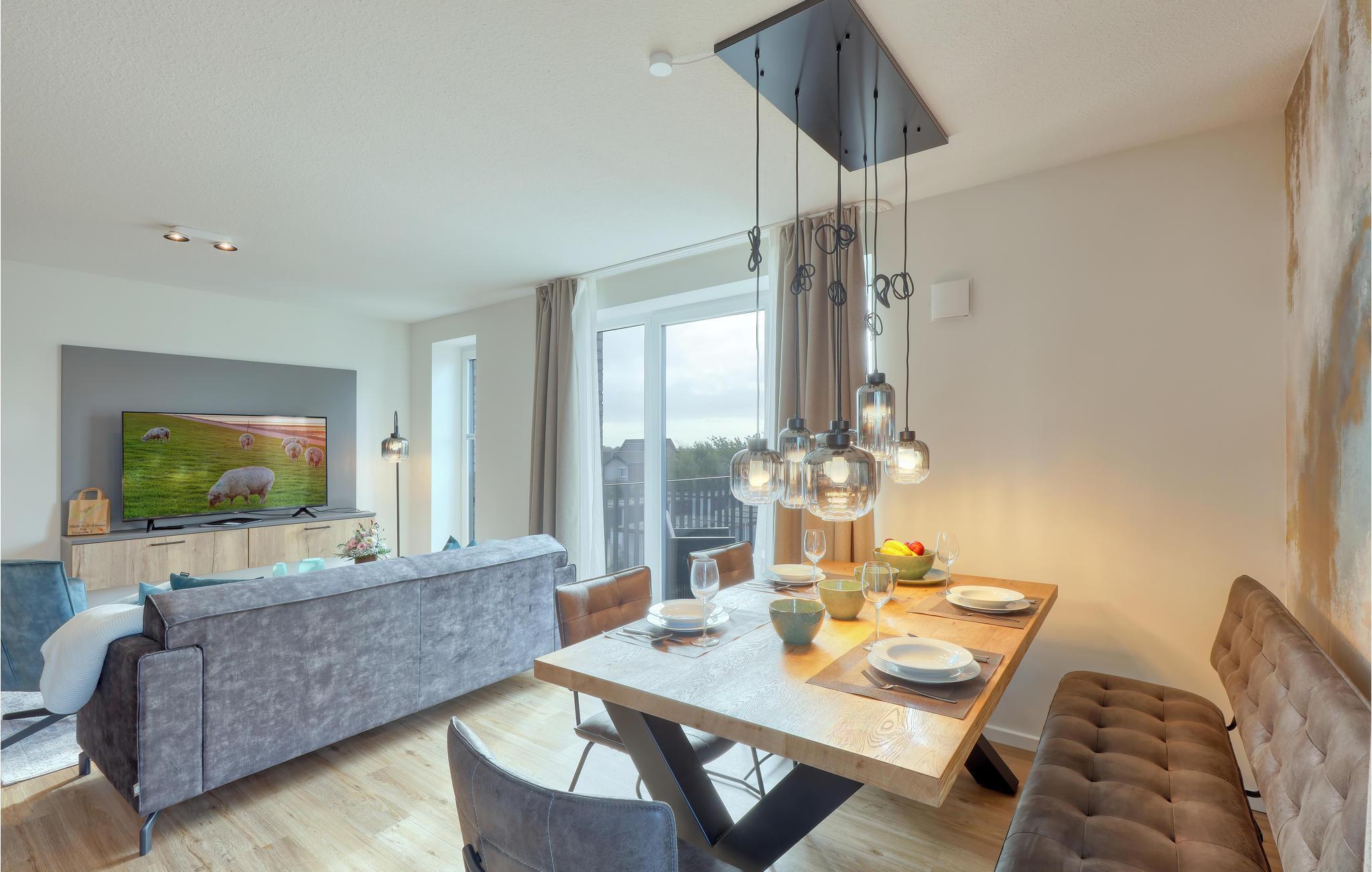 Herzlich willkommen auf Nordstrand, einer traumhaften Halbinsel an der schleswig-holsteinischen Nordseeküste im UNESCO Weltnaturerbe Wattenmeer. Das moderne Haus mit mehreren Ferienwohnungen ist ein wahres Juwel inmitten der Natur, die Lage direkt hinter dem Deich lässt das Herz eines jeden Nordseefans höherschlagen. Der moderne maritime Ausdruck der exklusiven Ferienwohnung versetzt Sie sofort in Urlaubsstimmung. Bodentiefe Fenster lassen viel Tageslicht herein und bieten einen schönen Blick ins Freie. Mit seinem Fokus auf Nachhaltigkeit ist das Ferienhaus der ideale Ort für Urlauber, die Wert auf Erholung in Einklang mit der Natur legen. Beginnen Sie Ihren Tag mit einem leckeren Frühstück im gemütlichen Wohnzimmer mit offener Küche oder genießen Sie den ersten Kaffee auf dem Balkon.