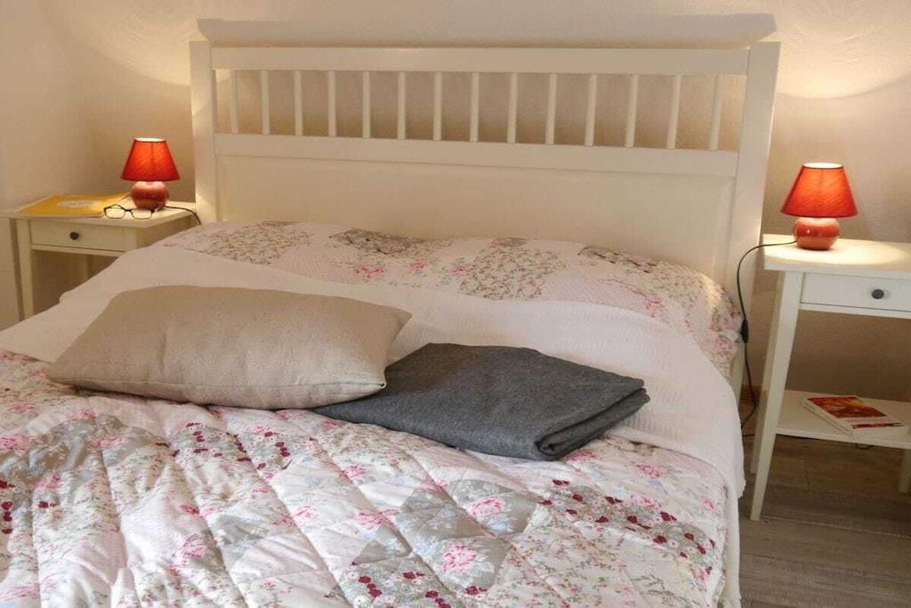 House "Heini" is approximately 120 square meters and is situated in a secluded location on a 1000 square meter, fenced property with mature trees on the inland dike in the England district. It accommodates 1-6 people (+1 infant up to 3 years old) with or without a dog. On the sunny, sheltered terrace, you can enjoy the uniquely magnificent view across the expansive meadows of Nordstrand. A barbecue and garden furniture are provided for evening grilling. For entertainment, there are two new flat-screen TVs, a DVD player, a stereo system, and a Wii game console. "Huus Heini" offers three comfortable bedrooms, a bright living/dining room, a new fitted kitchen, and two shower rooms. The new kitchen is fully equipped with all modern conveniences. "Huus Heini" is being continuously renovated and will receive a brand new shower room in time for the 2022 season.