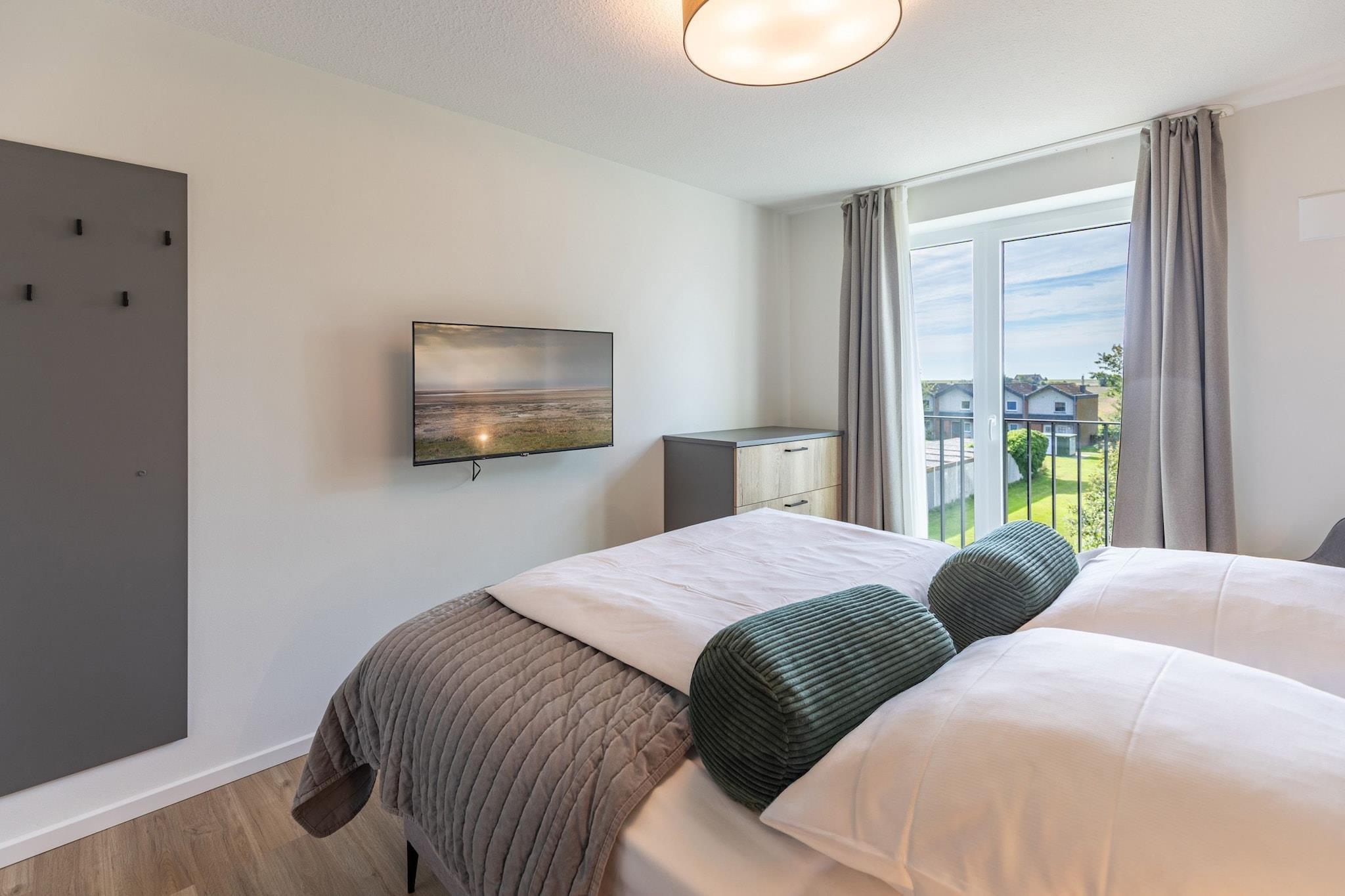 Welcome to your comfortable holiday home on Nordstrand – a stylishly furnished flat on the second floor of a well-maintained building with a lift, located directly behind the dyke. The flat can accommodate up to four adults and two children and has two separate bedrooms and a spacious living/dining room with a comfortable double sofa bed. The furnishings combine Nordic clarity with a cosy ambience, creating a feel-good atmosphere – ideal for families or small groups. A special highlight is the balcony, which invites you to linger and offers a wonderful view of the surrounding nature. The proximity to the dyke makes the apartment the perfect starting point for walks, bike rides and excursions into the unique landscape of the North Sea. Whether for a relaxing holiday or a short break in between – this apartment combines comfort, style and nature in a special way. Highlights included: all consumption-based energy costs, WLAN, final cleaning, laundry package (mandatory bookable), parking space, tourist tax
