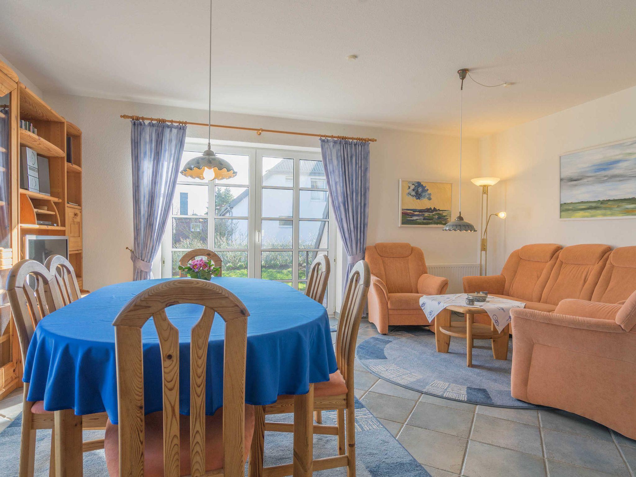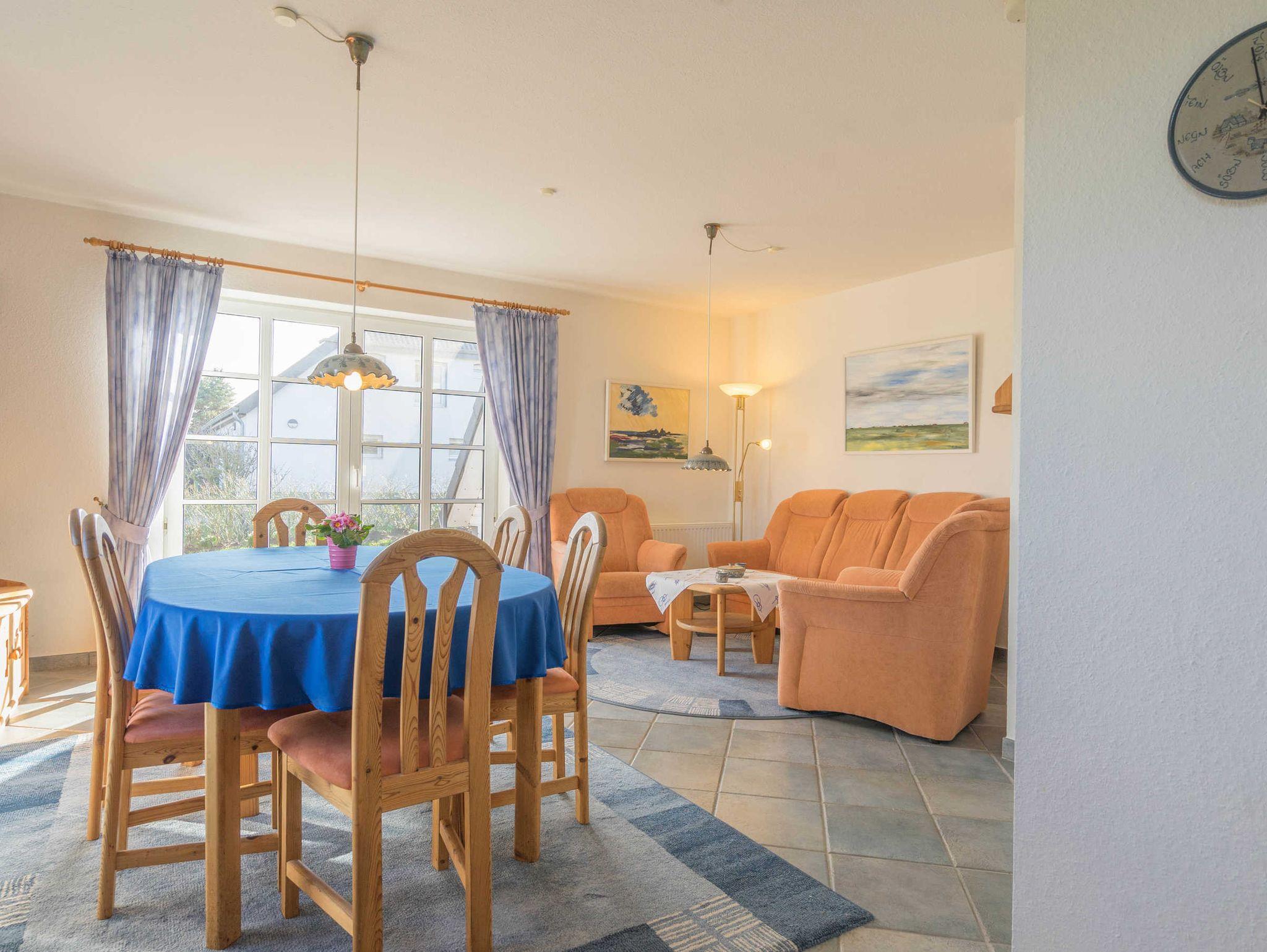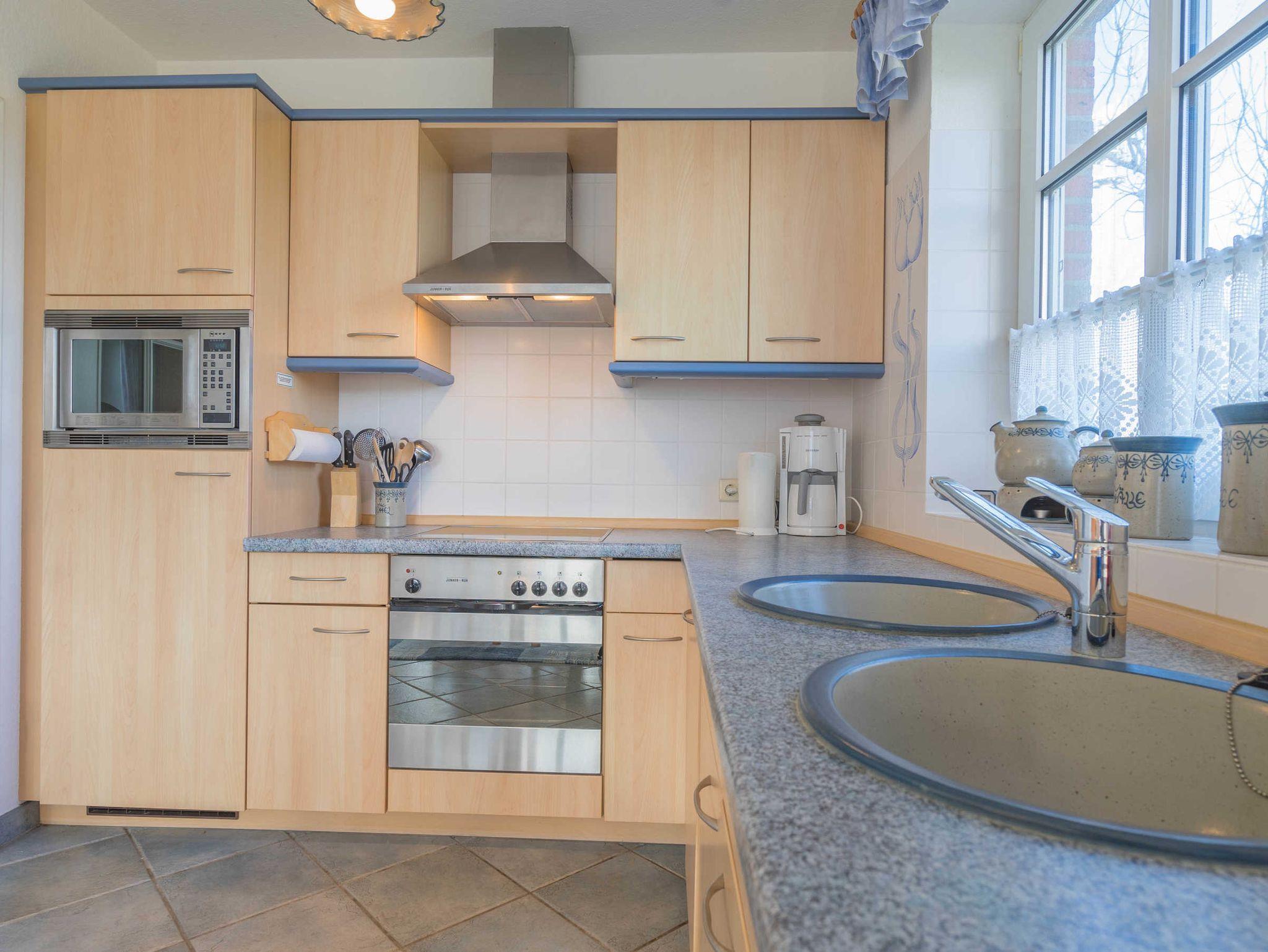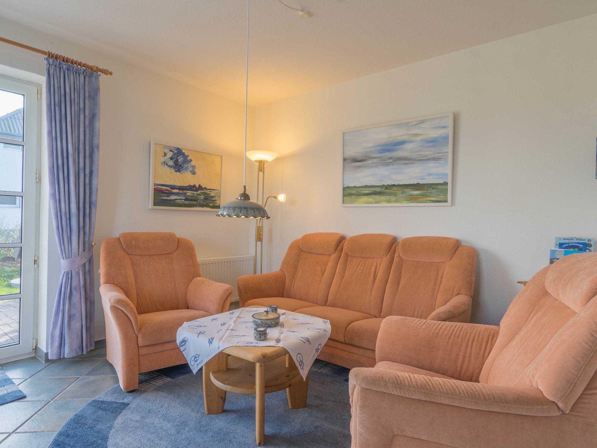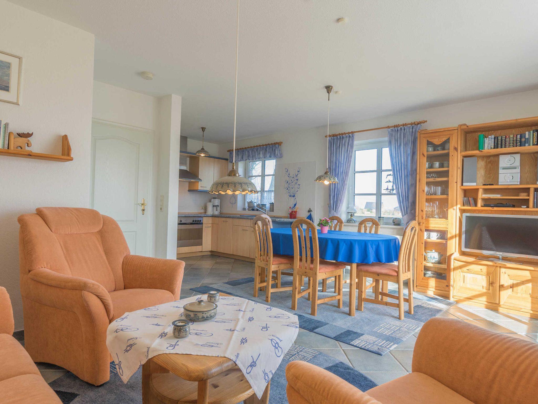 Die Friesenhaushälfte ist hell und freundlich eingerichtet. Seine gehobene Ausstattung lässt es an nichts fehlen. Fliesen und Parkett machen es zusätzlich allergikergerecht. Eine Gaszentral-Heizung sorgt in den kalten Tagen für die nötige Wärme. Im EG befindet sich ein großer Wohnraum mit Sitzgruppe, Satelliten-TV, Bluray-Player und Stereoanlage, außerdem eine Essecke mit offener Einbauküche, Geschirrspüler und Mikrowelle. Eine Komplettausstattung mit Geschirr aus der Nordstrander Töpferei gehört zur Besonderheit der Kücheneinrichtung. Desweiteren finden Sie im EG eine Dusche mit WC sowie eine Terrasse mit Gartenmöbeln. Das OG bietet zwei Schlafzimmer, eine Dusche mit WC, eine Waschmaschine und einen Trockner. Ein weiterer Schlafraum befindet sich im Dachgeschoß.