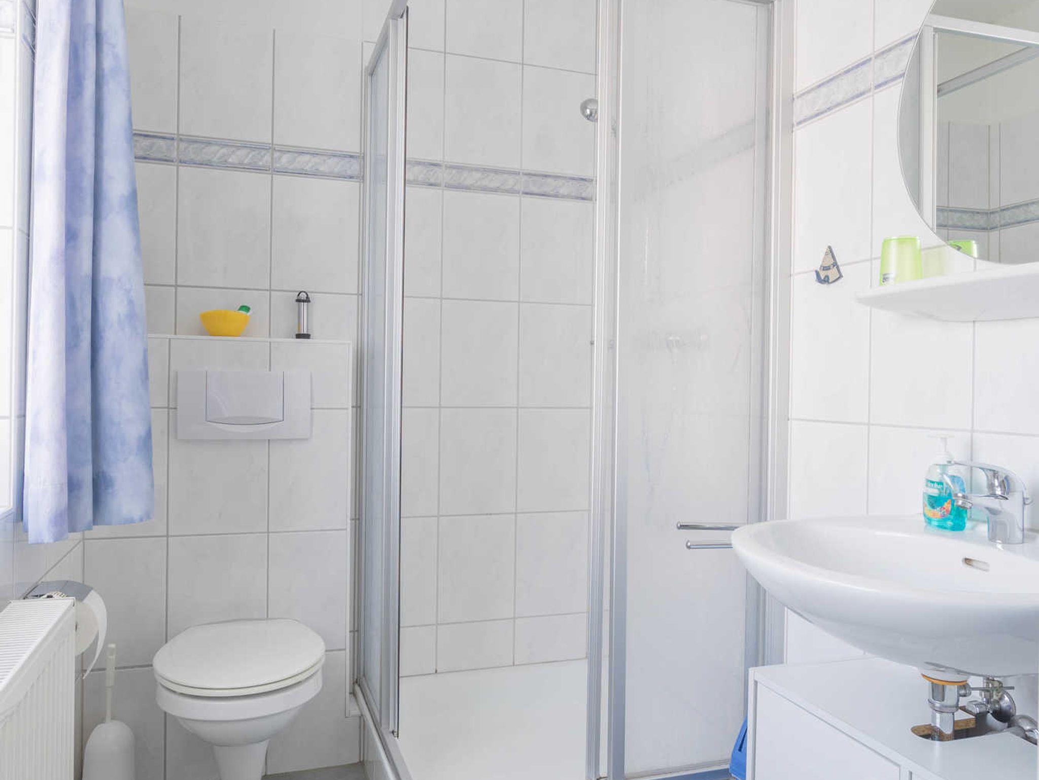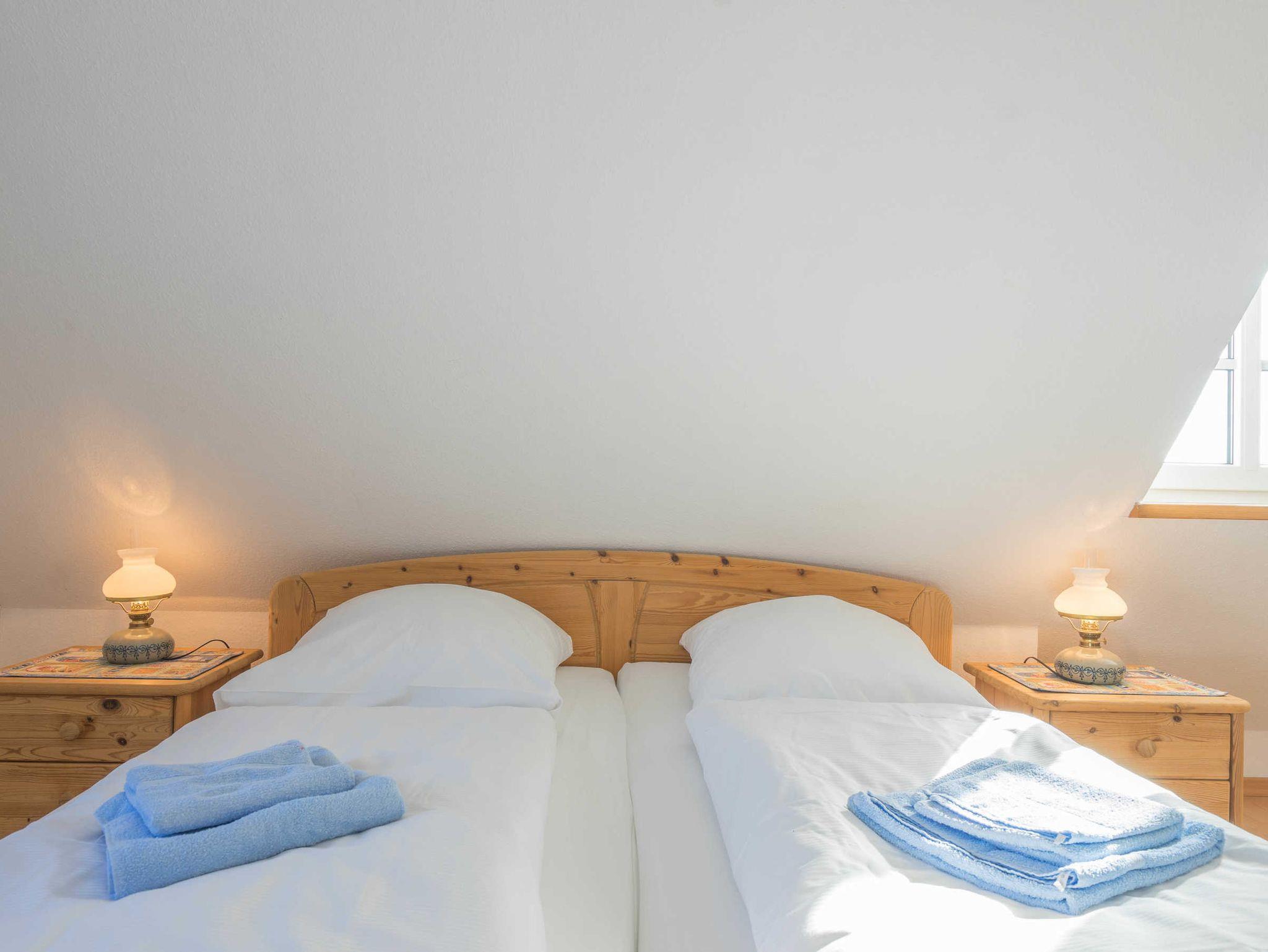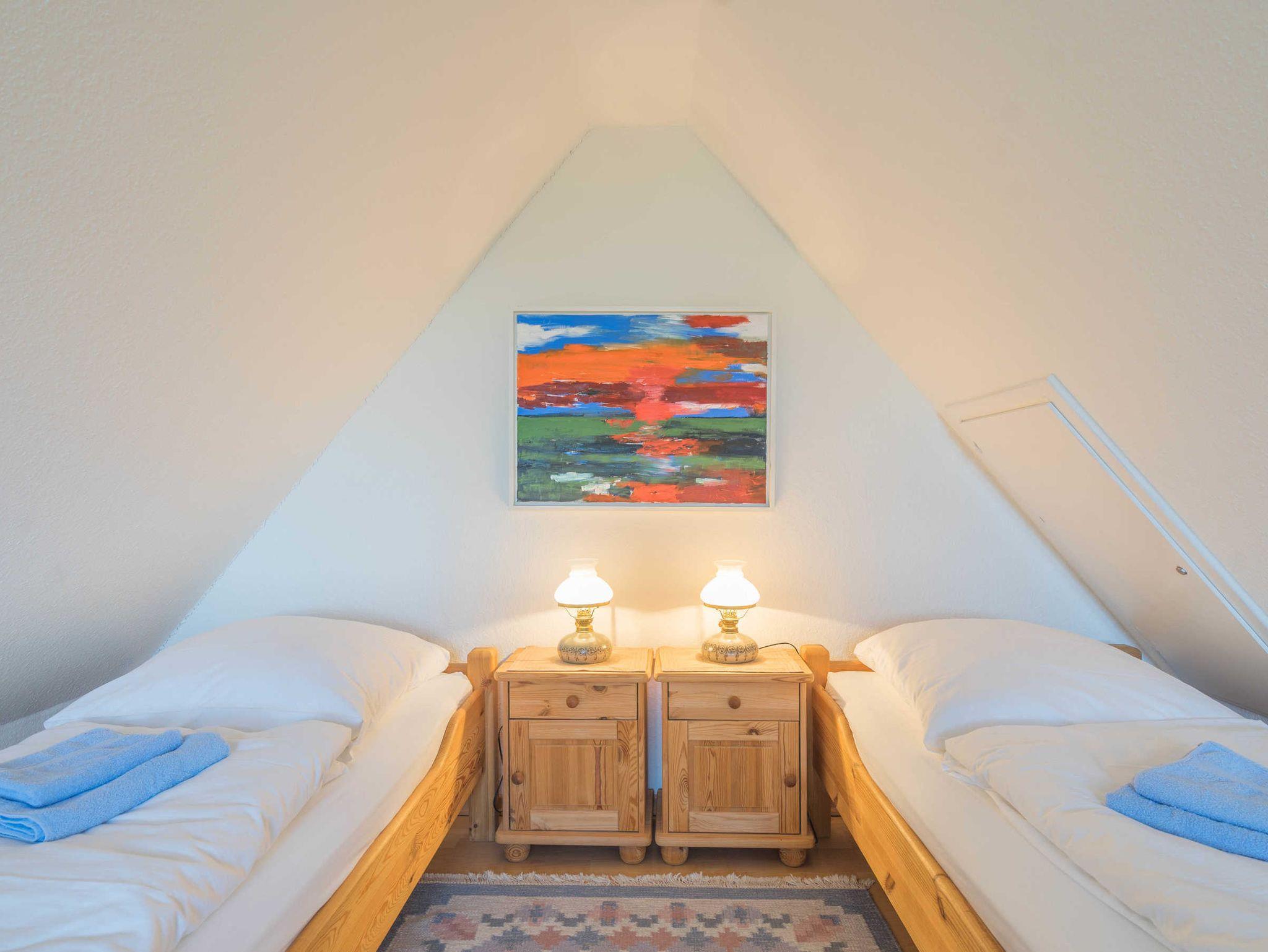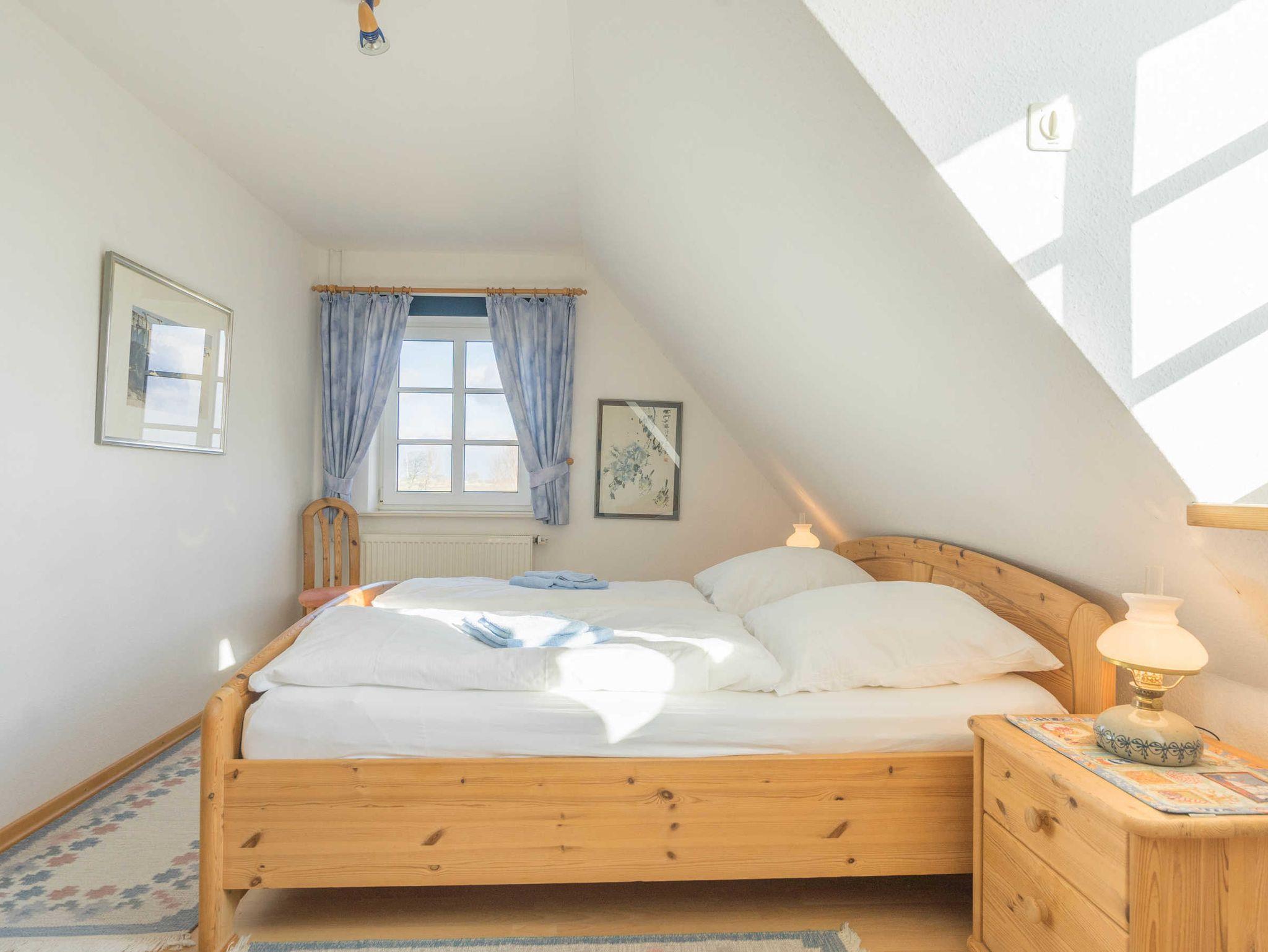 Das OG bietet zwei Schlafzimmer, eine Dusche mit WC, eine Waschmaschine und einen Trockner. Ein weiterer Schlafraum befindet sich im Dachgeschoß und ist über eine Raumspartreppe zu erreichen. Ganz in der Nähe finden Sie einen Bäcker, verschiedene Speiselokale und Fischrestaurants. Das Kurmittelhaus für Anwendungen, Packungen, Bäder und Massagen ist ca. 1300 m entfernt. Ein Hallenbad mit Sauna befindet sich neben dem Kurmittelhaus im Norderhafen.