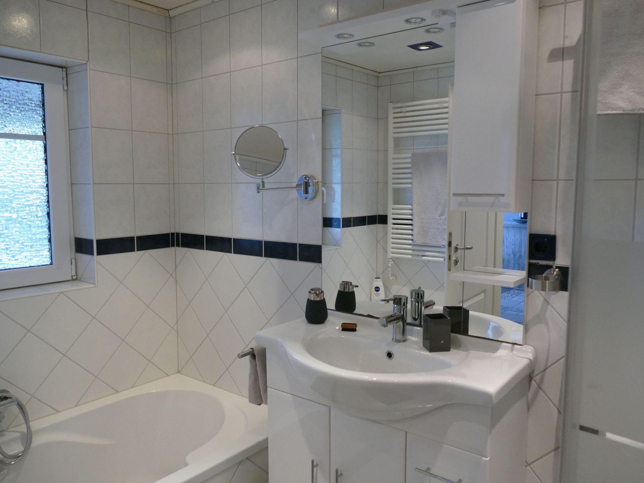 Das große Badezimmer rundet Ihr Wohlfühlerlebnis mit einer Badewanne und einer Dusche ab perfekt, um nach einem erlebnisreichen Tag zu entspannen.