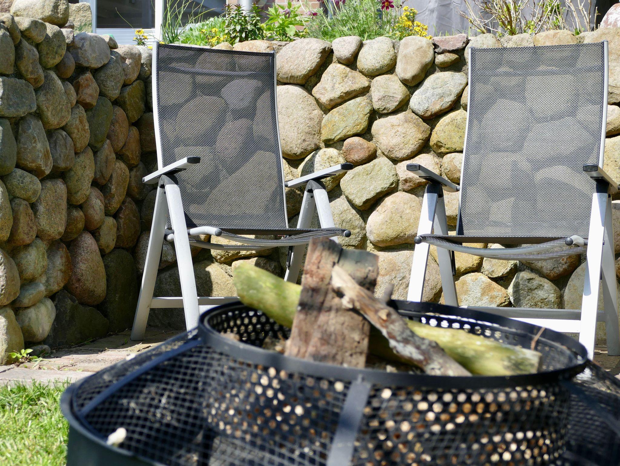 Im großzügigen Garten laden ein Strandkorb, eine gemütliche Sitzecke und eine Feuerschale zu geselligen Tagen und entspannten Stunden im Freien ein. Außerdem bietet eine überdachte Terrasse, direkt vom Wohnzimmer aus erreichbar, einen traumhaften Ausblick ideal, um den Tag bei einem Glas Wein ausklingen zu lassen.