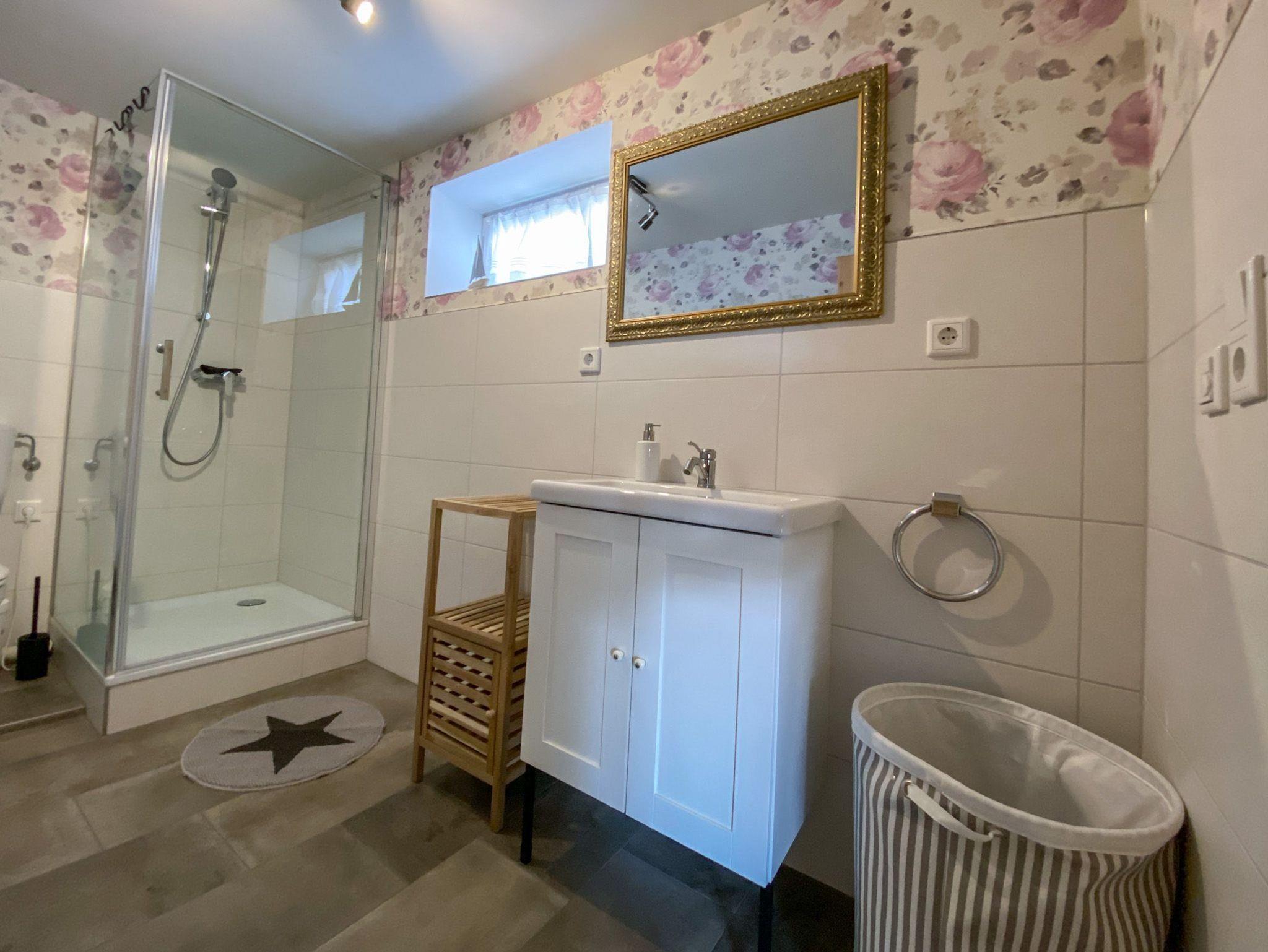 Das ebenfalls neue Badezimmer besticht mit moderner, gepflegter Ausstattung und bietet genügend Platz für alle Habseligkeiten, sowie ein Fenster in Richtung der Terrasse auf der Rückseite des Haupthauses.