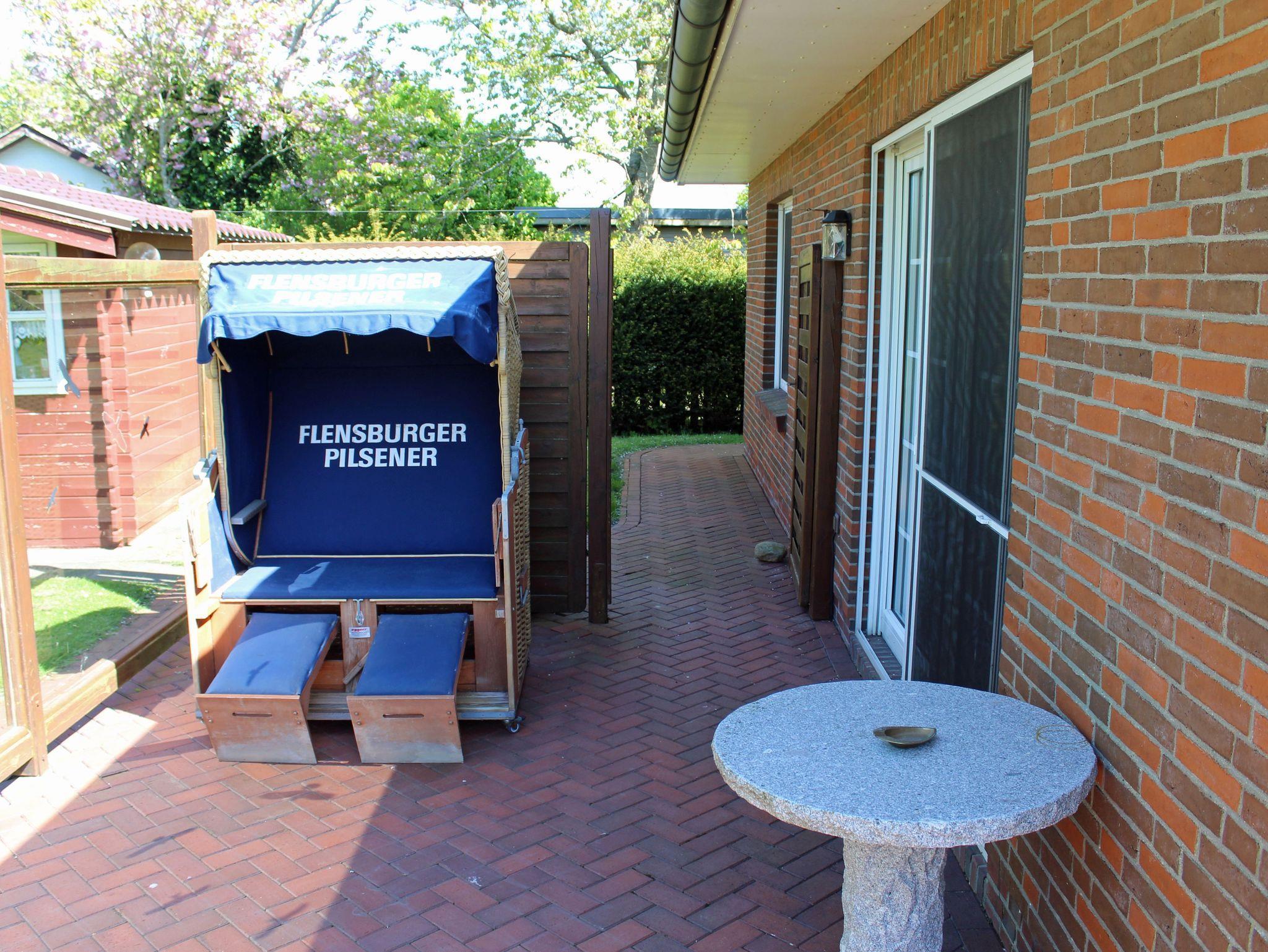 Im Erdgeschoß des Hauses befindet sich ein Schlafzimmer mit Doppelbett (180x200cm) mit großem Kleiderschrank, das schöne Wohnzimmer mit genug Platz für alle Bewohner des Hauses und Zugang zum Garten mit Sonnenterrasse, inkl. Strandkorb.