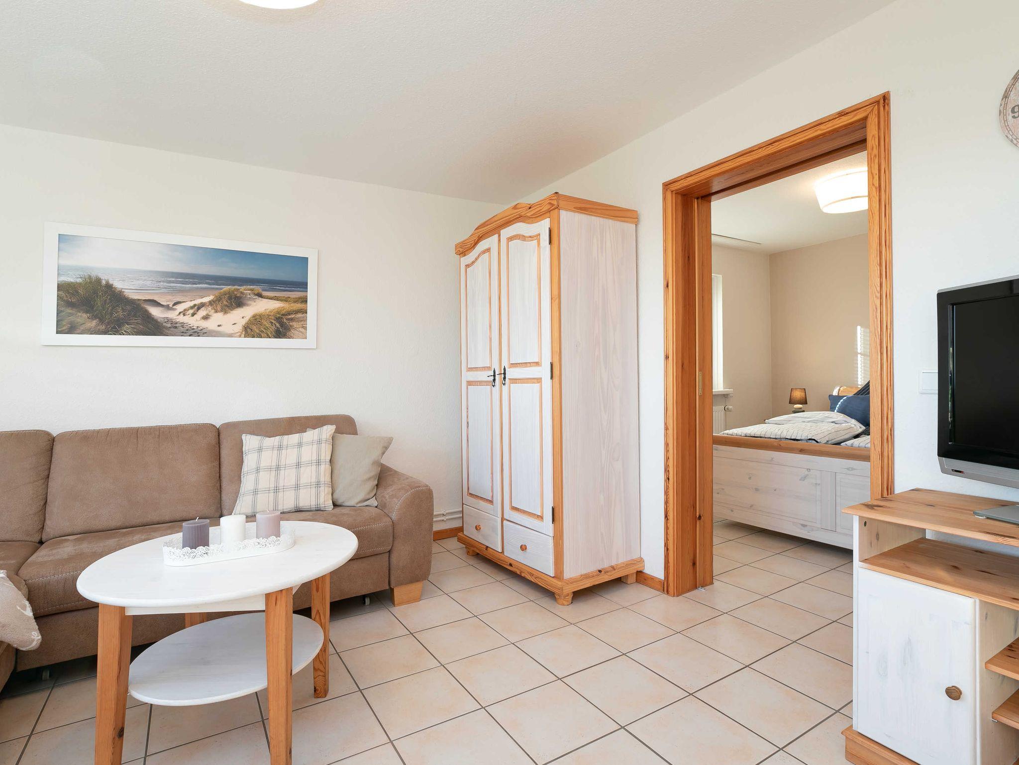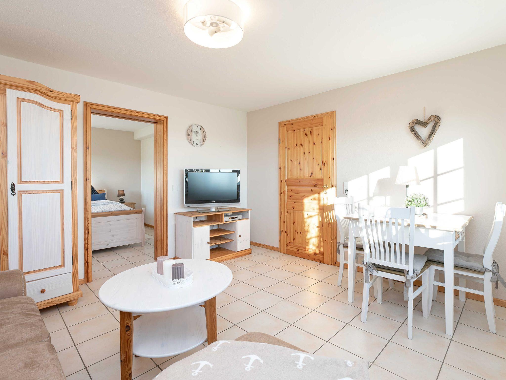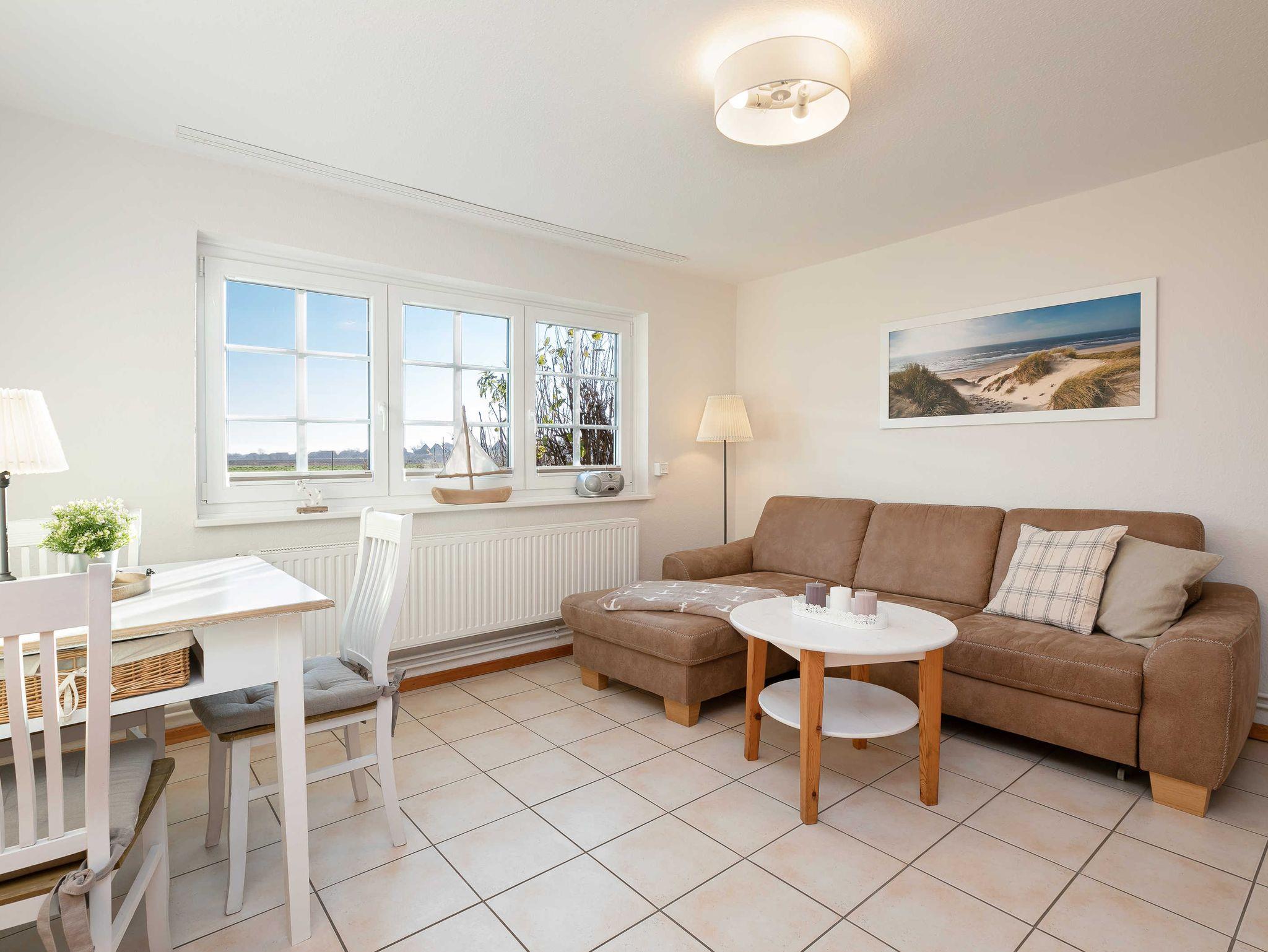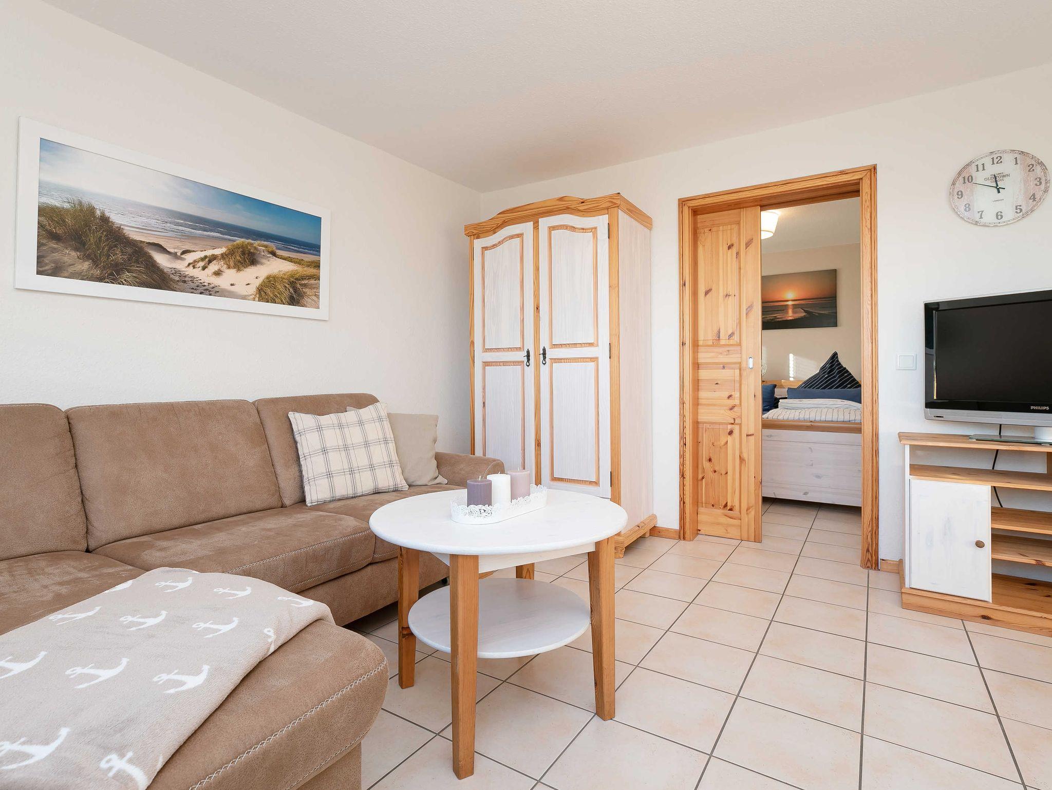 Die Wohnung betrittst Du von Osten her über einen abgetrennten Eingangsbereich in die komplett ausgestattete Küche. Deine Terrasse mit eigenen Sitzmöbeln und Strandkorb befindet sich direkt vor dem Eingang. Der Küche angeschlossen ist das großzügige moderne Duschbad mit ebenerdiger Dusche und der kombinierte Wohn- und Essbereich. Hier findest Du ein Schlafsofa, TV-Board mit Flachbild TV und einen gemütlichen Essbereich. Das Schlafzimmer schließt sich dann dem Wohn- und Essbereich an. Alles ist im modernen Landhausstil in den Farbtönen weiß/sandfarben eingerichtet und mit maritimen Details gestaltet.