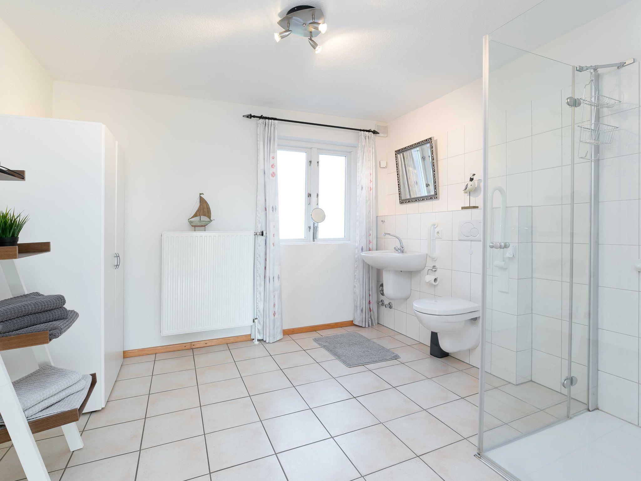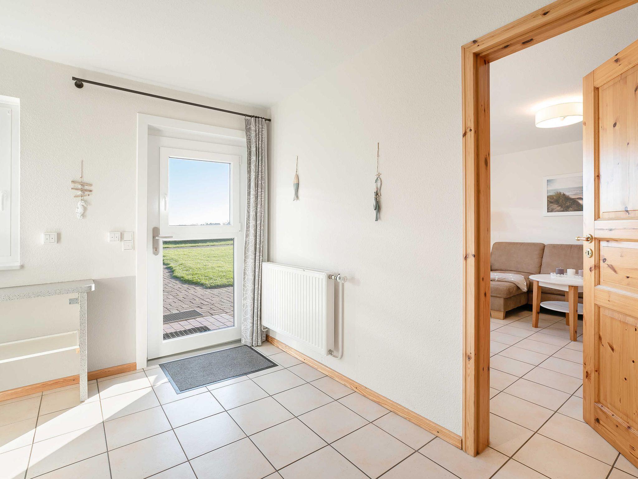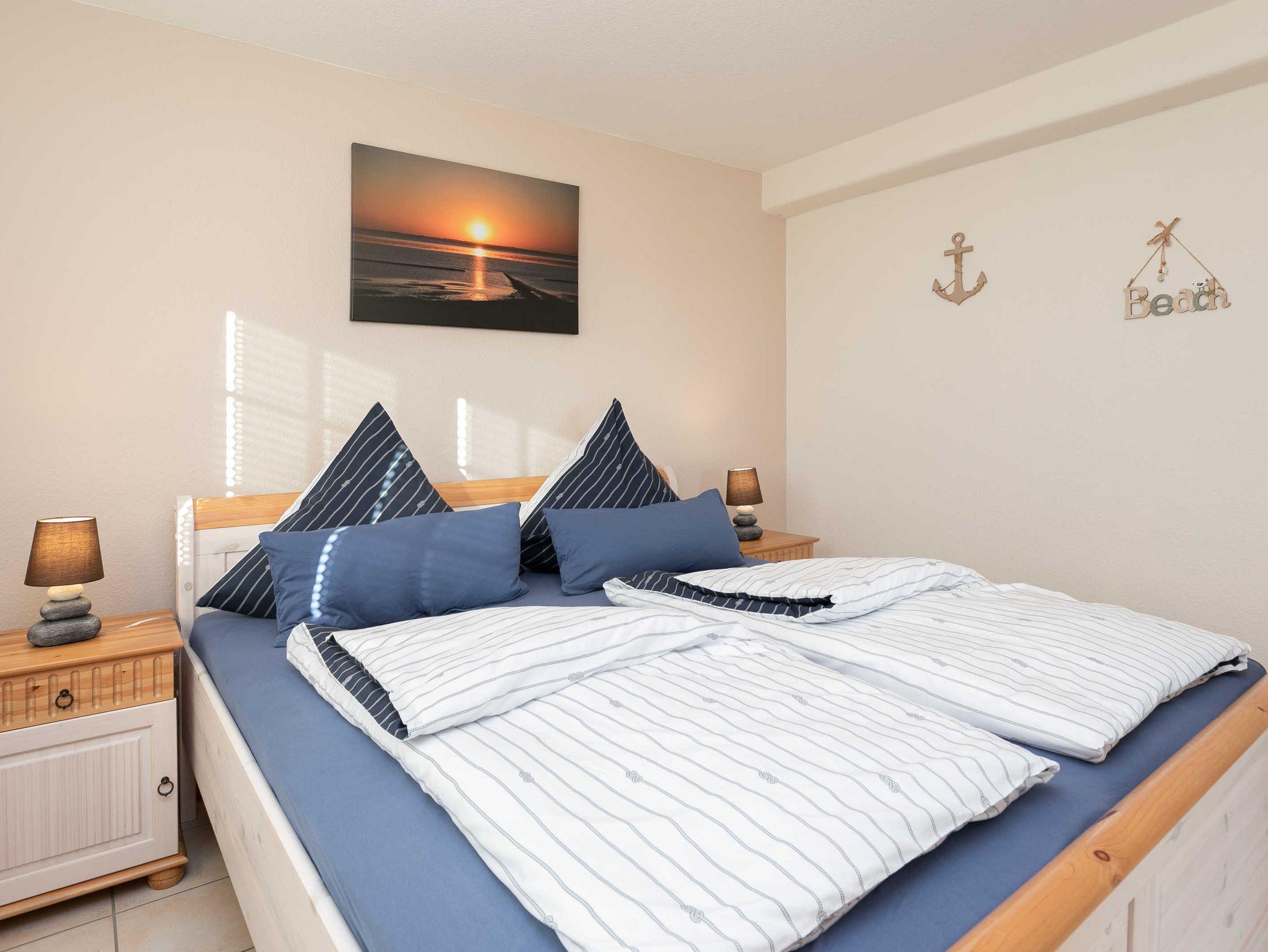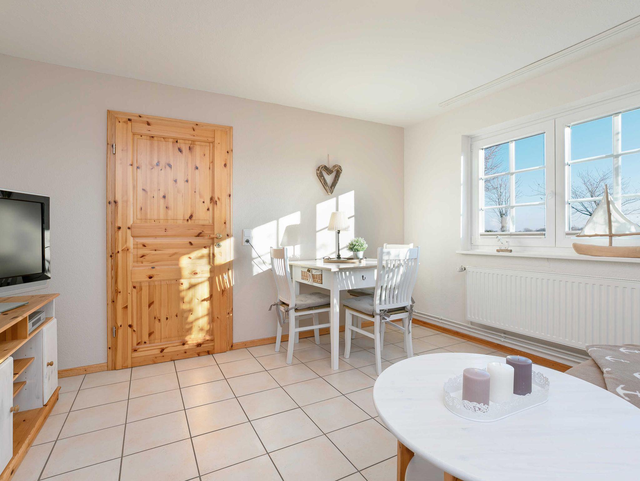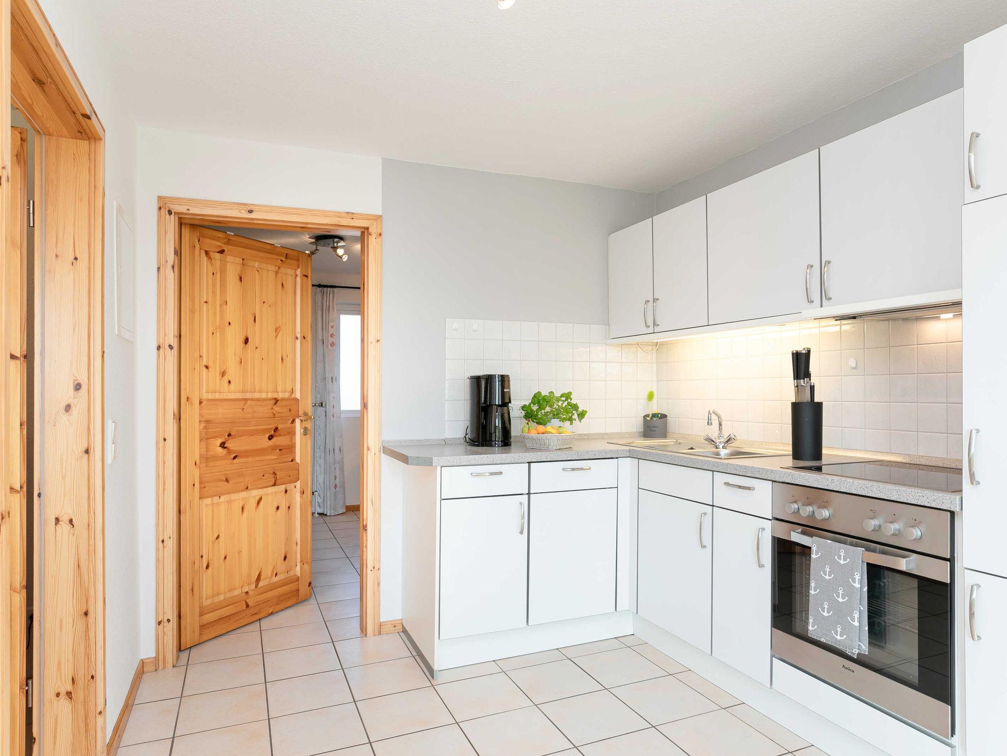 Die Wohnung betrittst Du von Osten her über einen abgetrennten Eingangsbereich in die komplett ausgestattete Küche. Deine Terrasse mit eigenen Sitzmöbeln und Strandkorb befindet sich direkt vor dem Eingang. Der Küche angeschlossen ist das großzügige moderne Duschbad mit ebenerdiger Dusche und der kombinierte Wohn- und Essbereich. Hier findest Du ein Schlafsofa, TV-Board mit Flachbild TV und einen gemütlichen Essbereich. Das Schlafzimmer schließt sich dann dem Wohn- und Essbereich an. Alles ist im modernen Landhausstil in den Farbtönen weiß/sandfarben eingerichtet und mit maritimen Details gestaltet.