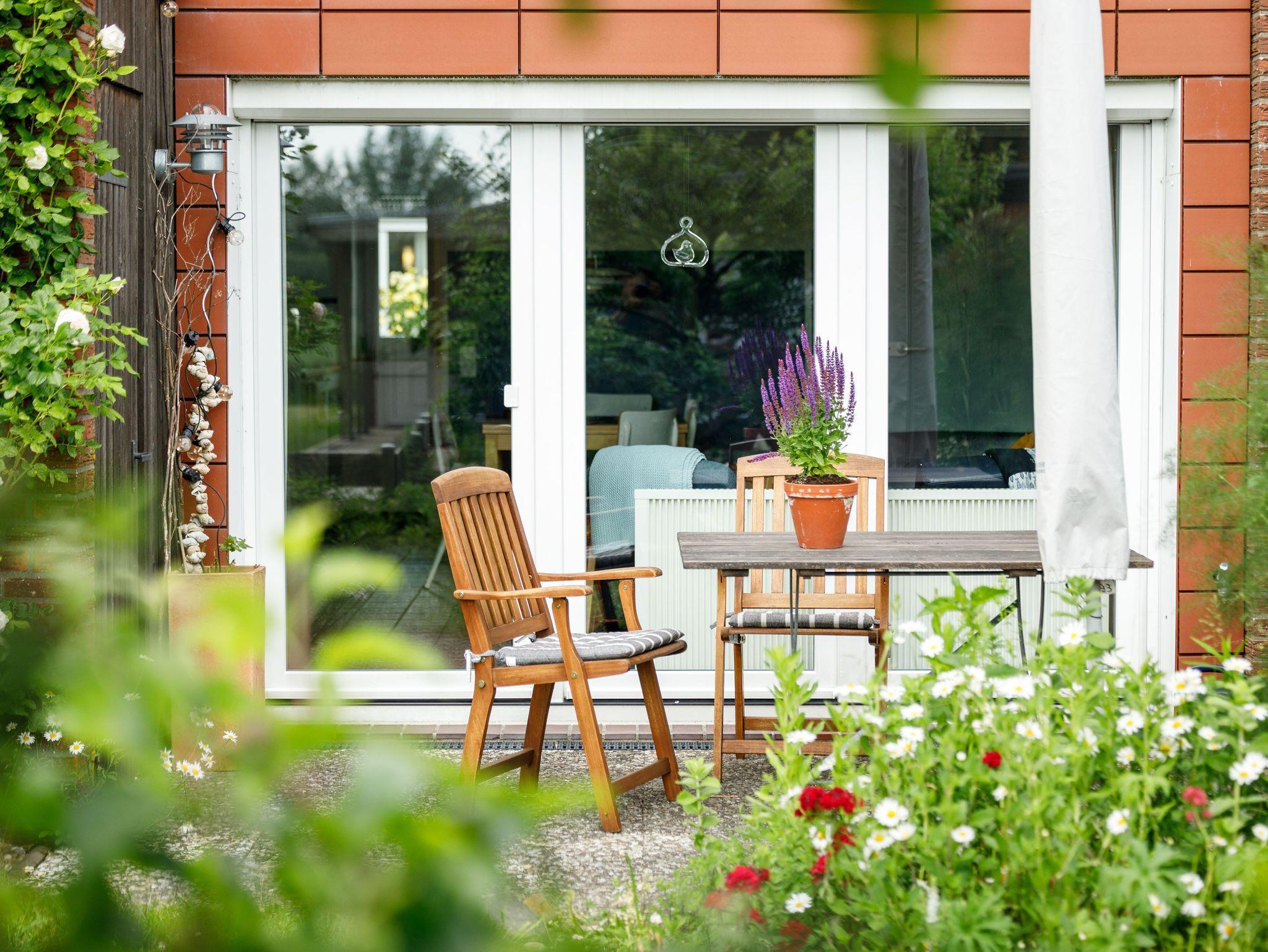 Im Naturgarten ist neben dem Gartenhaus eine überdachte Unterstellmöglichkeit für Fahrräder. Das Nordstrander