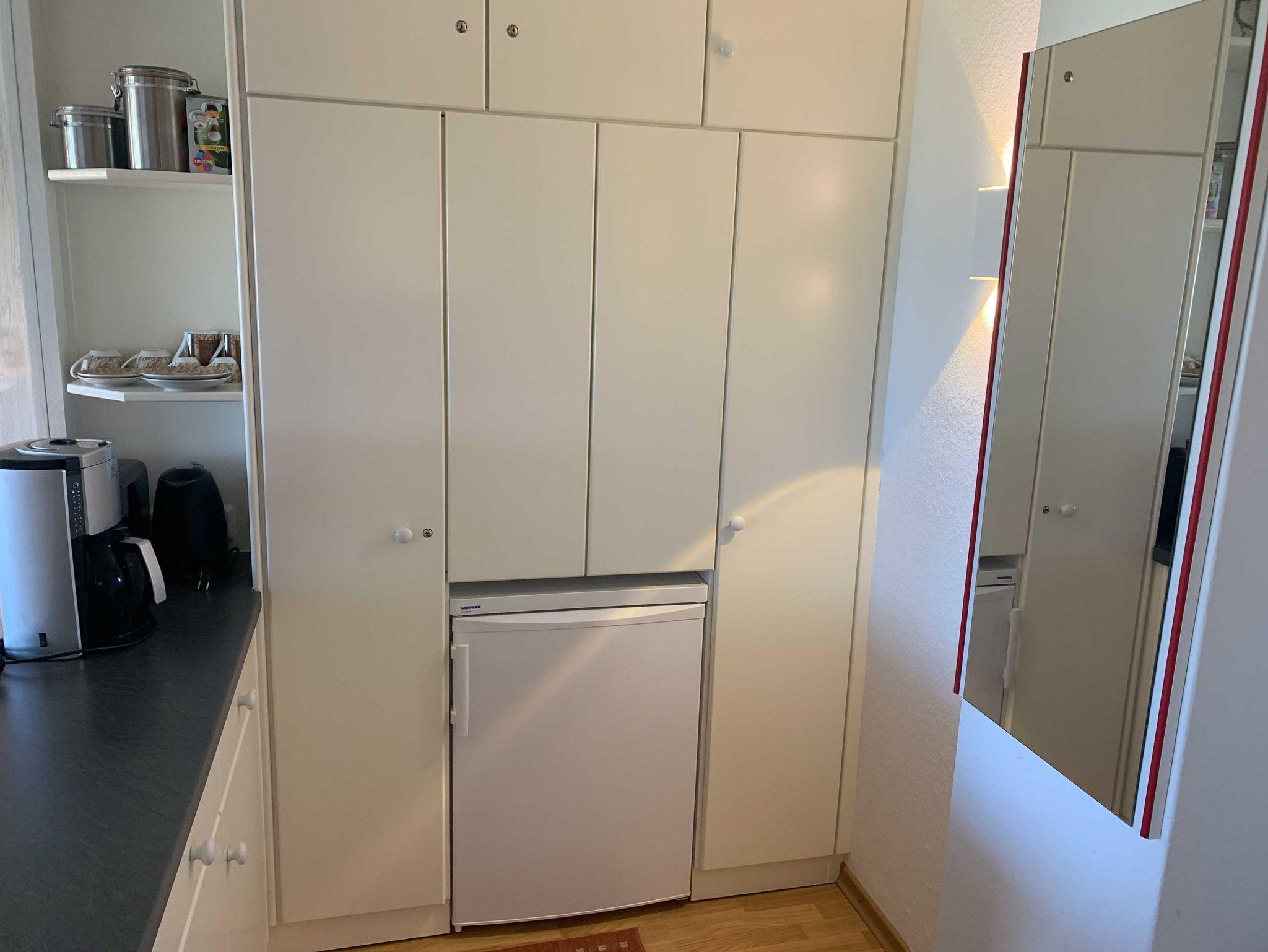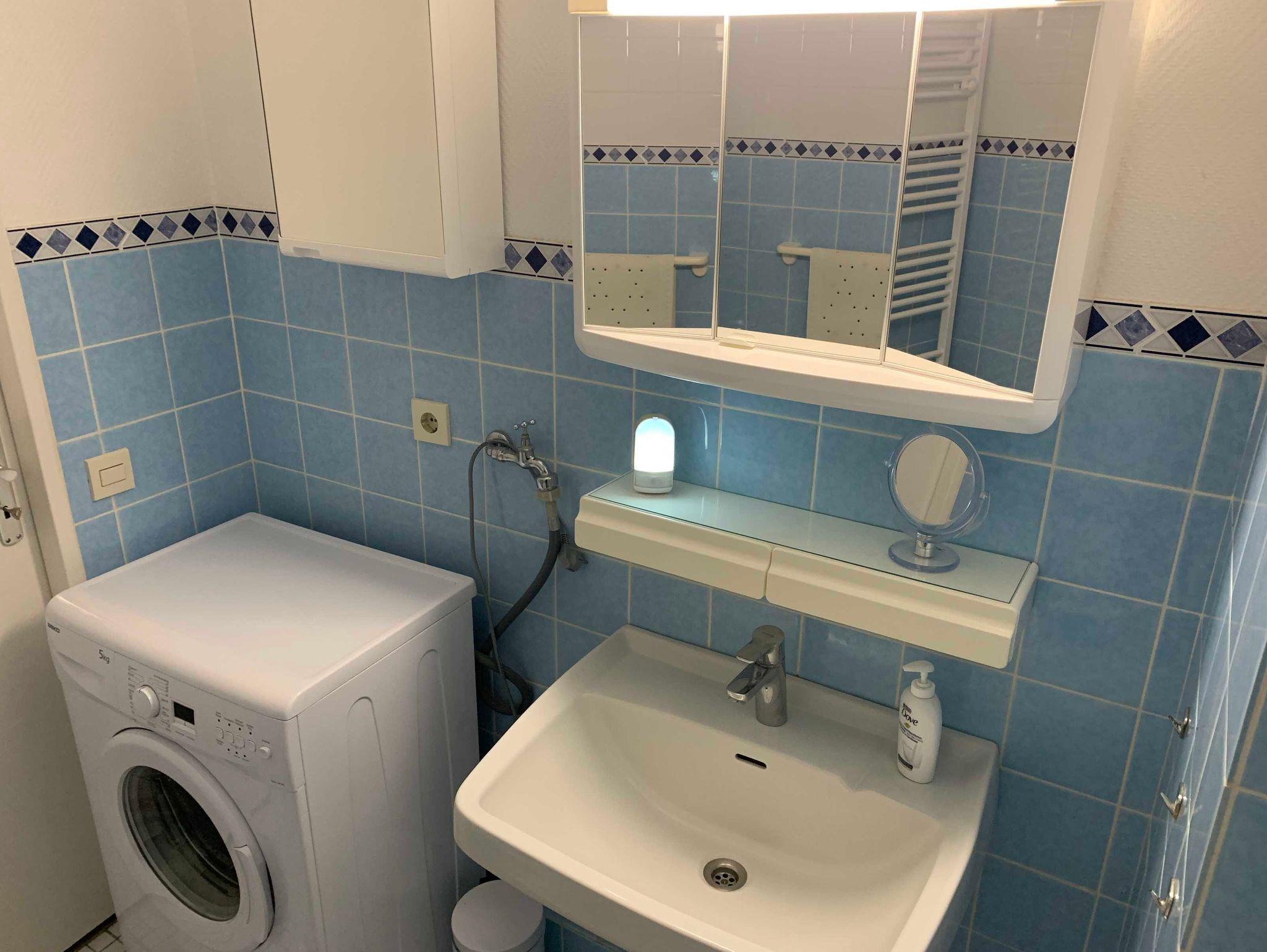 Das Schlafzimmer ist durch eine große Schiebetür mit dem Wohnzimmer verbunden, sodass man einen großen, lichtdurchfluteten Raum schaffen kann. Die Küche ist ausgestattet mit Induktionsherd und Geschirrspüler.