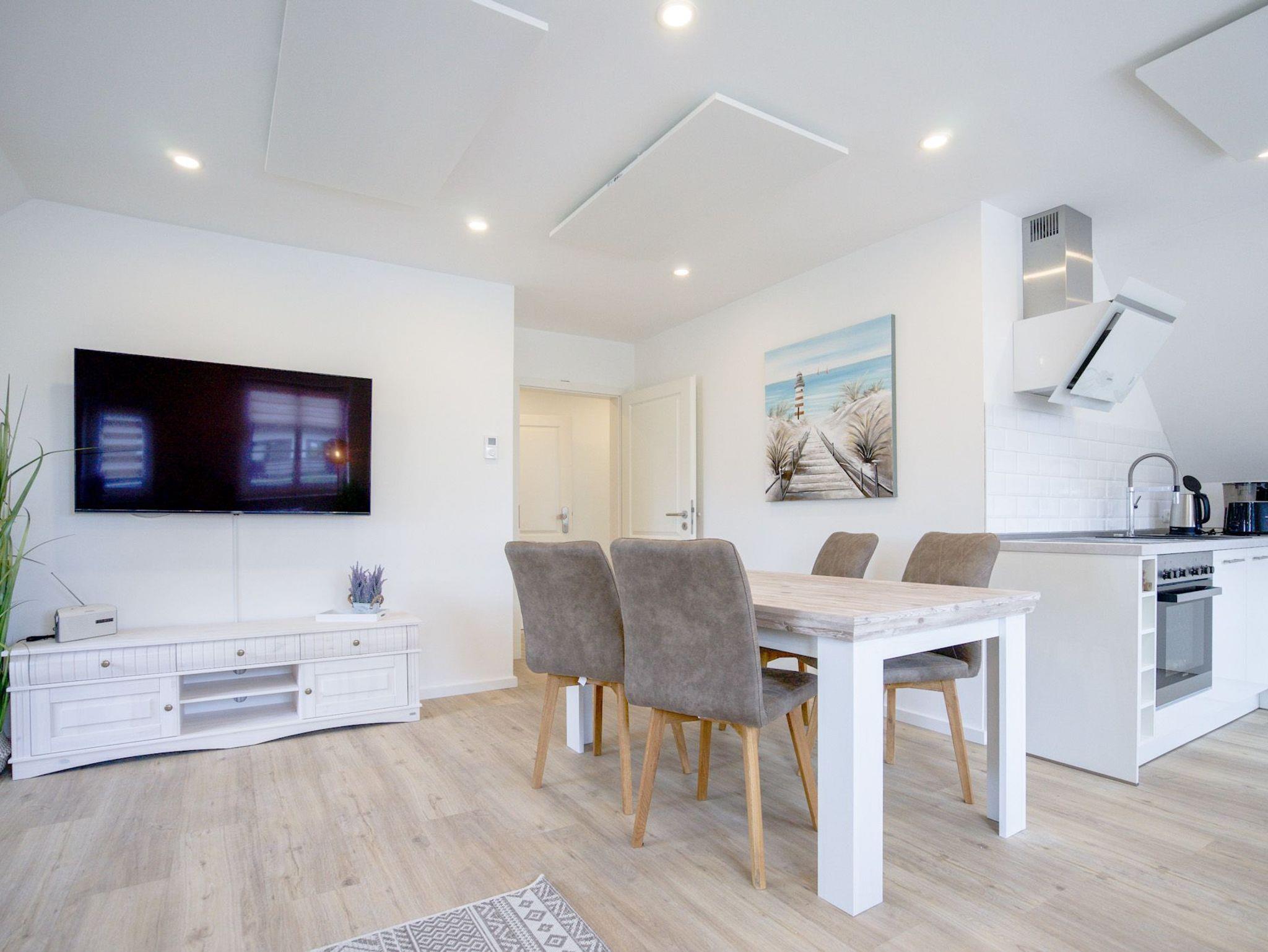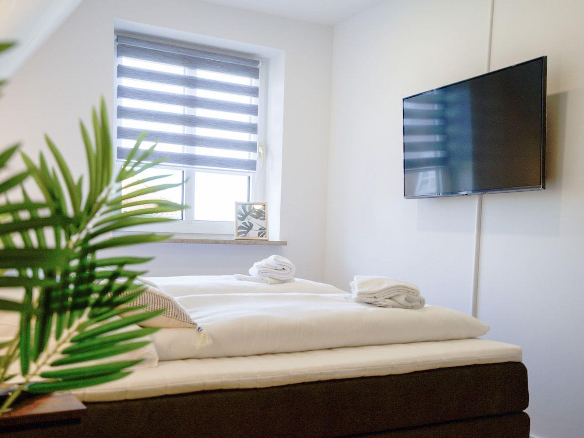 Das helle und geschmackvoll eingerichtete Appartement bietet Platz für bis zu vier Personen. Das Schlafzimmer (1 Doppelbett 180 x 200) ist mit einem Boxspringbett ausgestattet und verfügt über einen Smart-TV. Das Wohnzimmer verfügt über zwei weitere Schlafmöglichkeiten (1 Schlafsofa, 180 x 200).