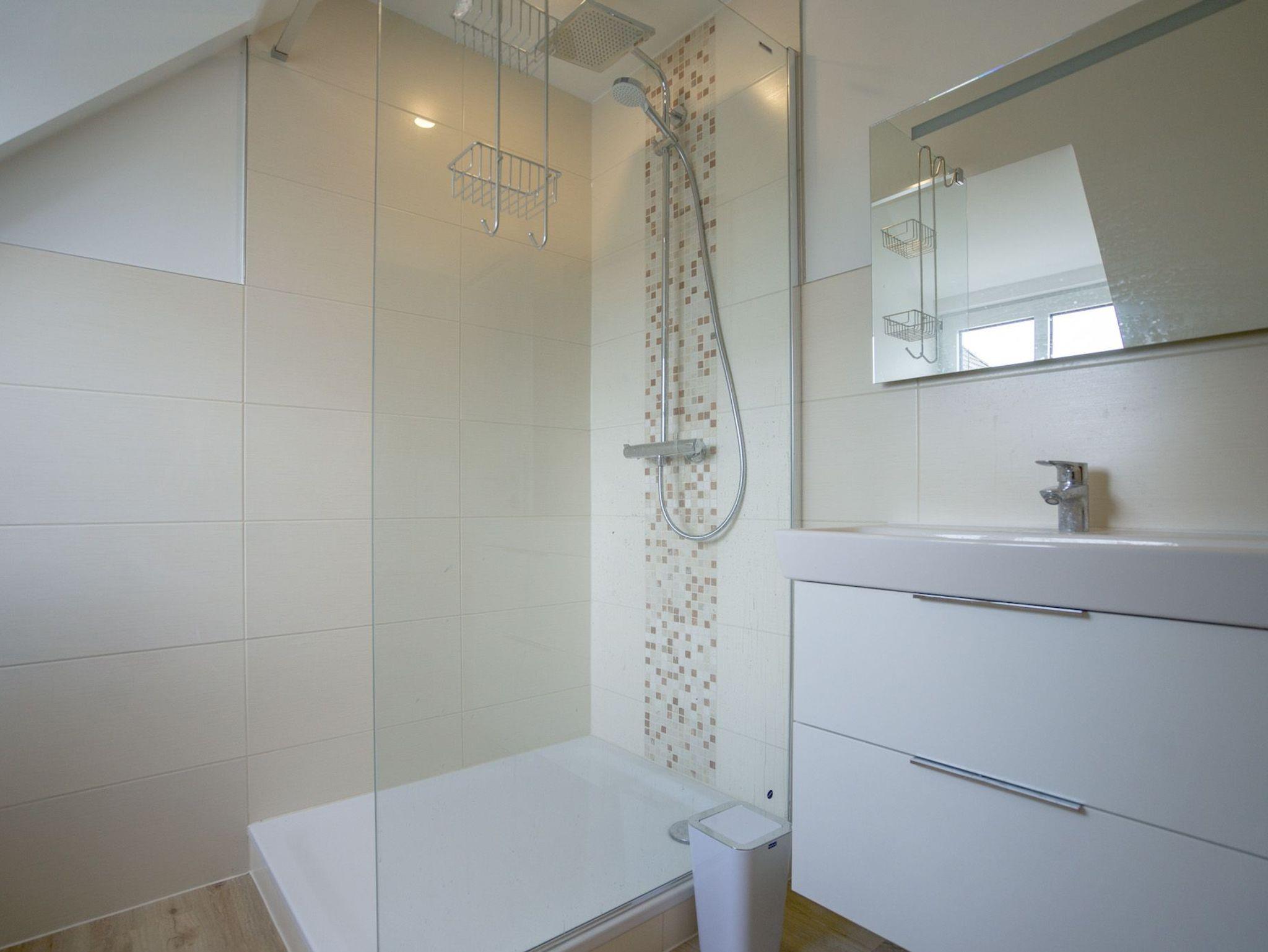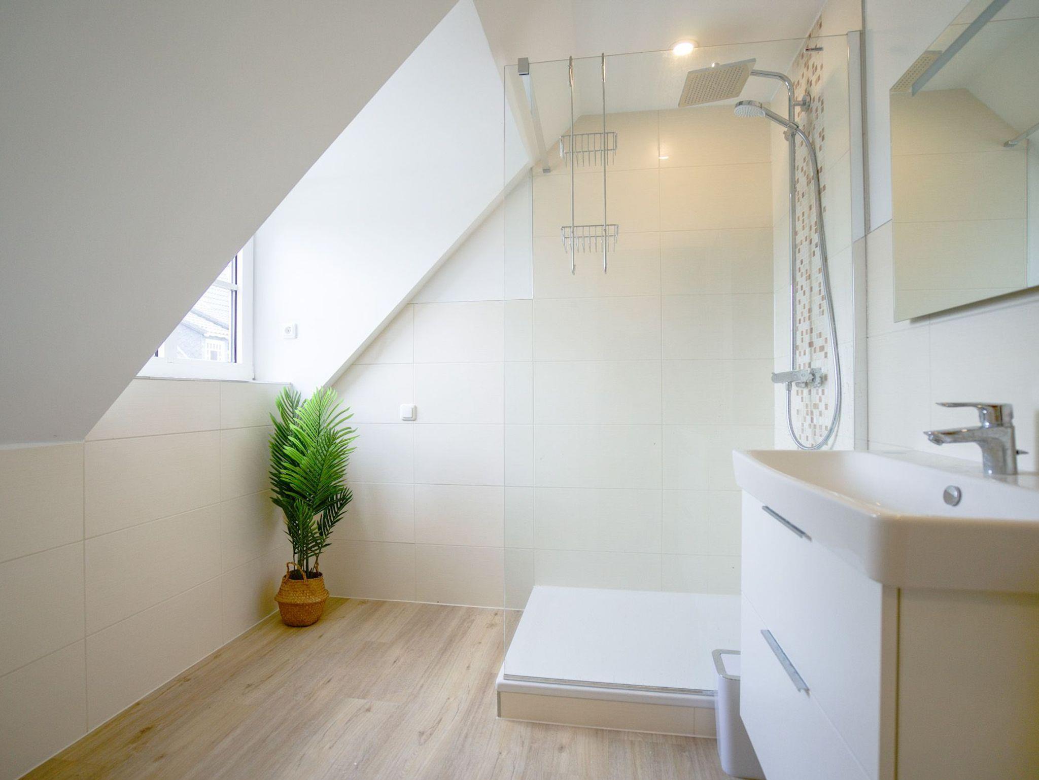 Das Bad bietet eine einladende ebenerdige Regendusche. In einem kleinen Hauswirtschaftsraum steht Ihnen eine Waschmaschine zur Verfügung. Die Wohnung wird über eine Fußbodenheizung und indirekte Infrarotelemente erwärmt.