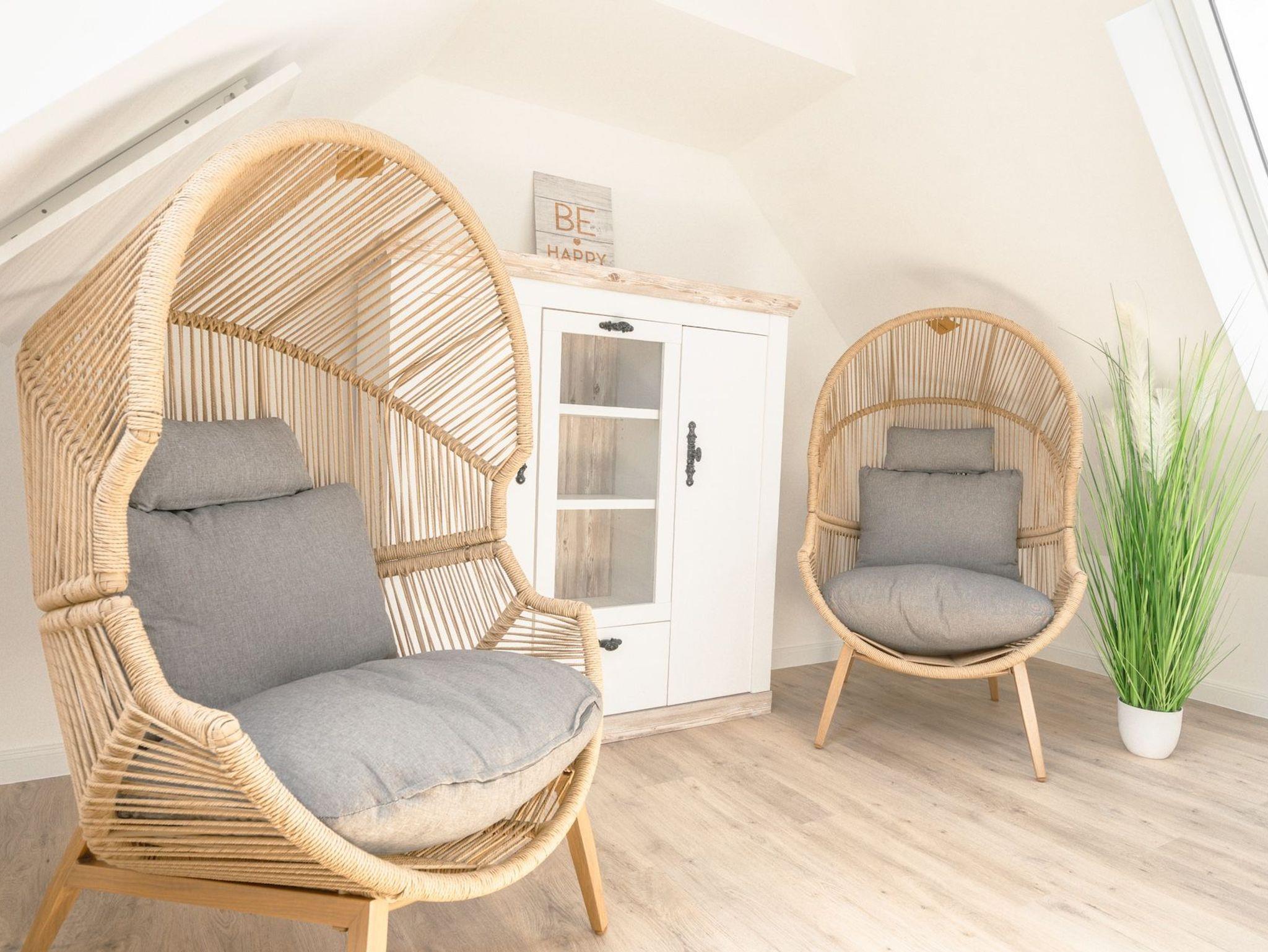 Die offene Küche ist hochwertig ausgestattet und schließt direkt an den Essbereich mit großem Esstisch für bis zu sechs Personen an. Von hier aus gelangt ihr direkt auf die sonnige Südterrasse mit Gartenmöbeln und Strandkorb ? der perfekte Ort für entspannte Stunden im Grünen. Das moderne Badezimmer bietet eine ebenerdige Dusche, Tageslicht und Handtuchtrockner. Zudem stehen euch schnelles WLAN, eine Waschmaschine und ausreichend Stauraum zur Verfügung. Ein Ferienhaus zum Wohlfühlen ? durchdacht, modern und wunderbar ruhig gelegen.