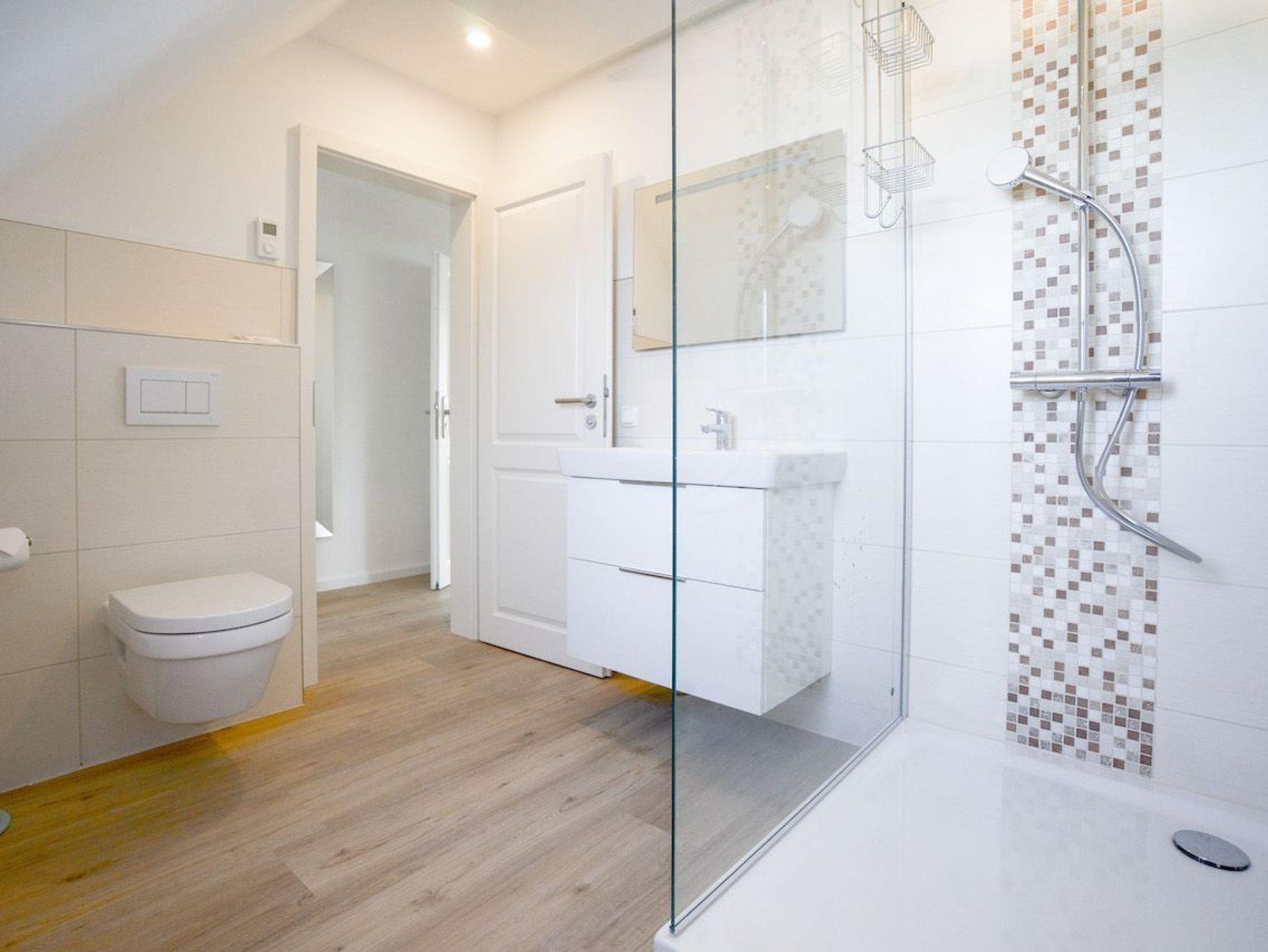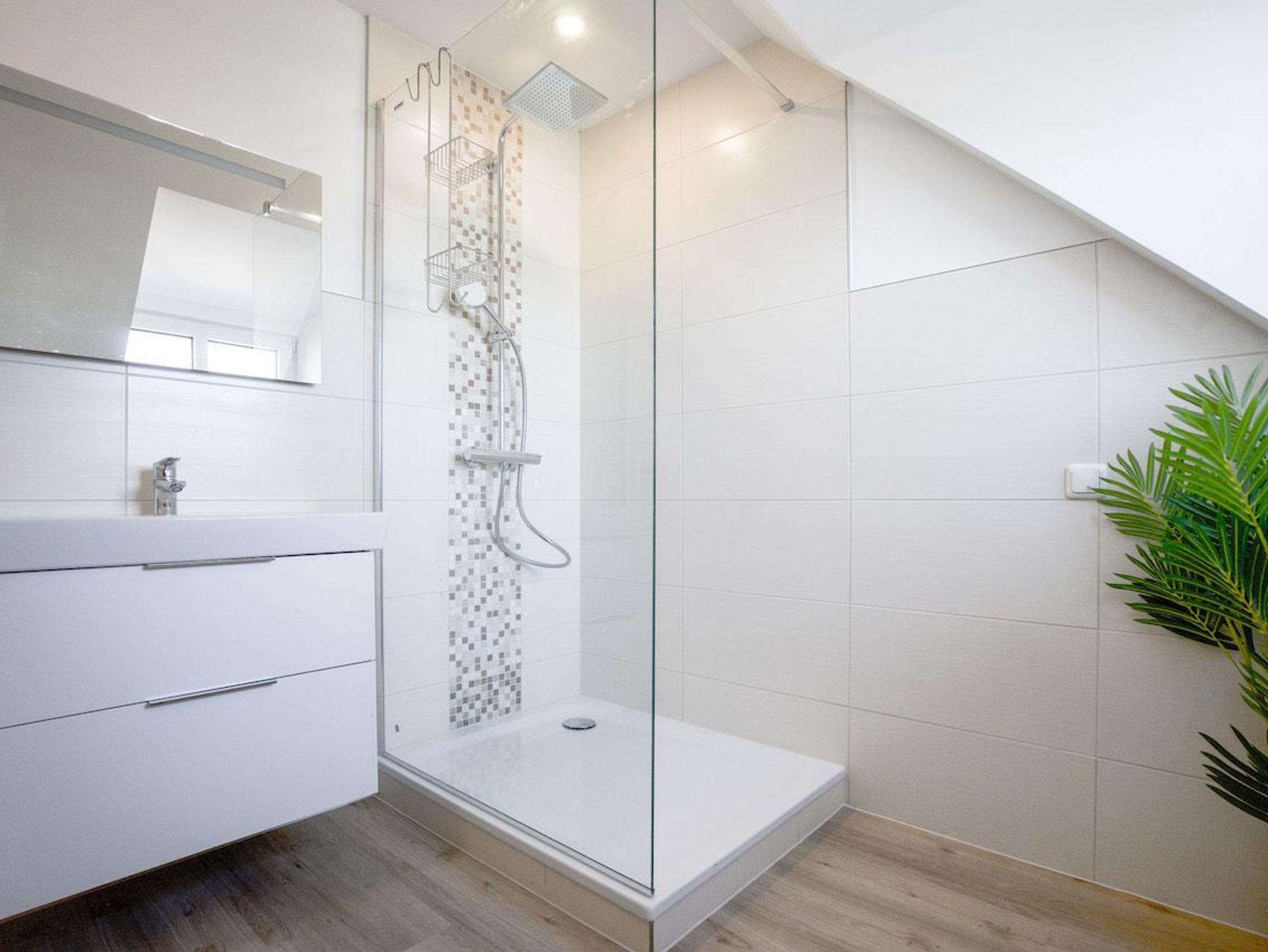 Das Bad bietet eine einladende ebenerdige Regendusche. In einem kleinen Hauswirtschaftsraum steht Ihnen eine Waschmaschine zur Verfügung. Die Wohnung wird über eine Fußbodenheizung und indirekte Infrarotelemente erwärmt.