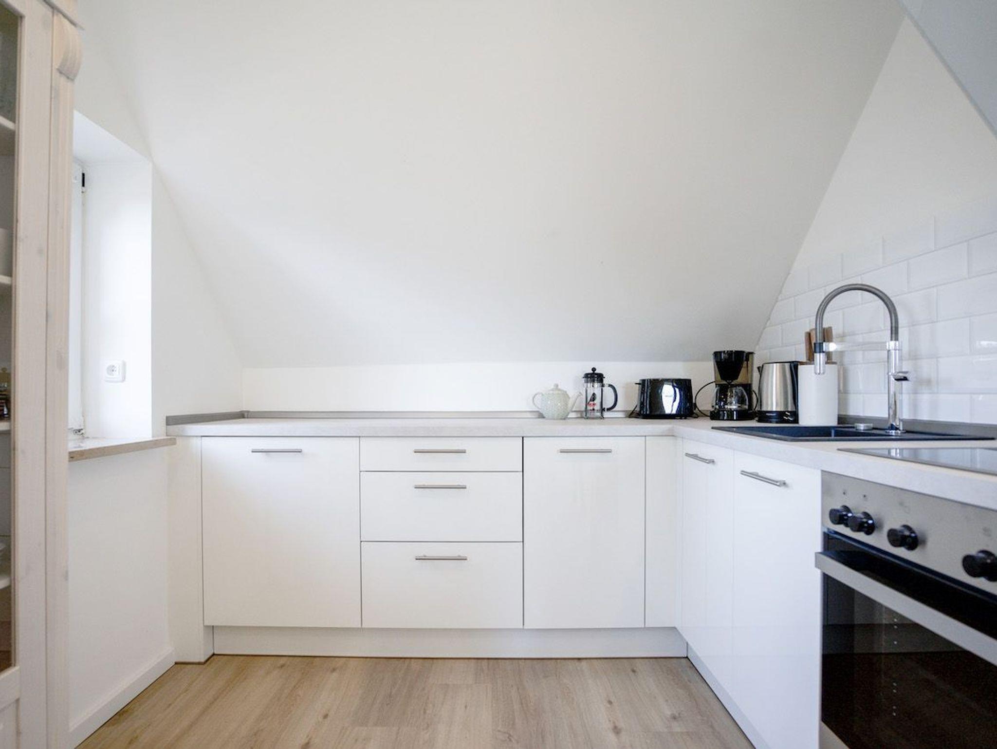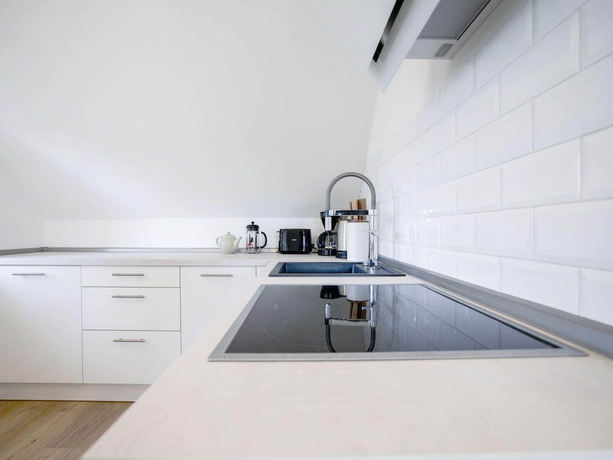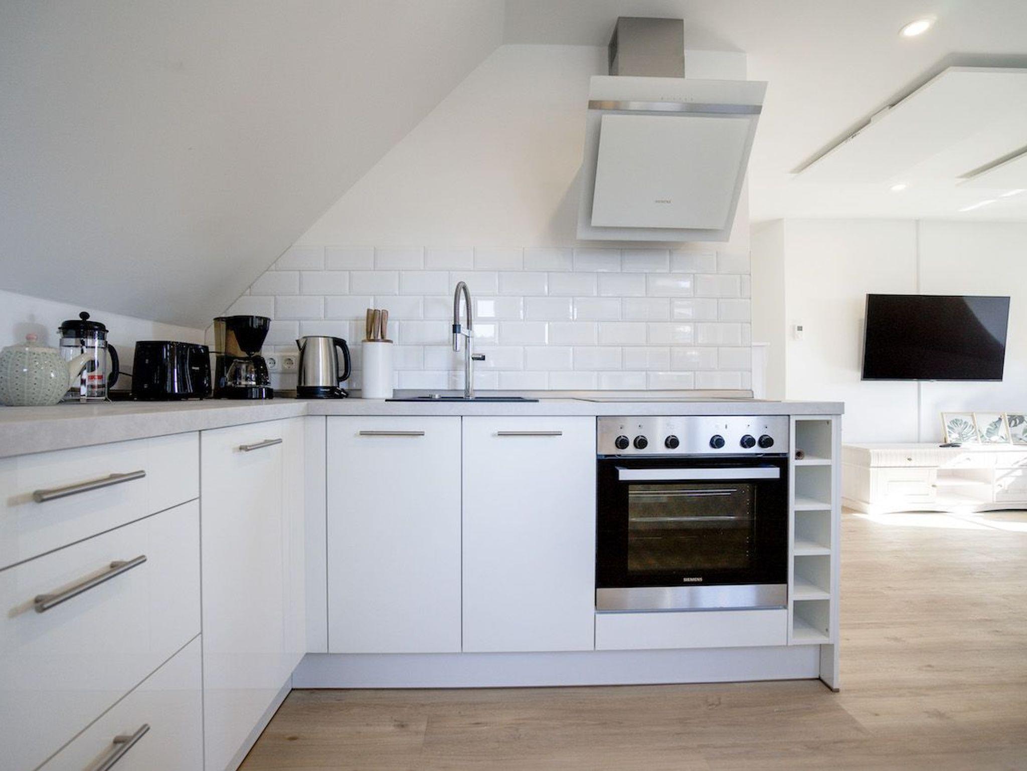 Die offene Küchenzeile ist hervorragend ausgestattet: Cerankochfeld, Backofen, Geschirrspülmaschine und Kaffeemaschine (Filtergröße 4).