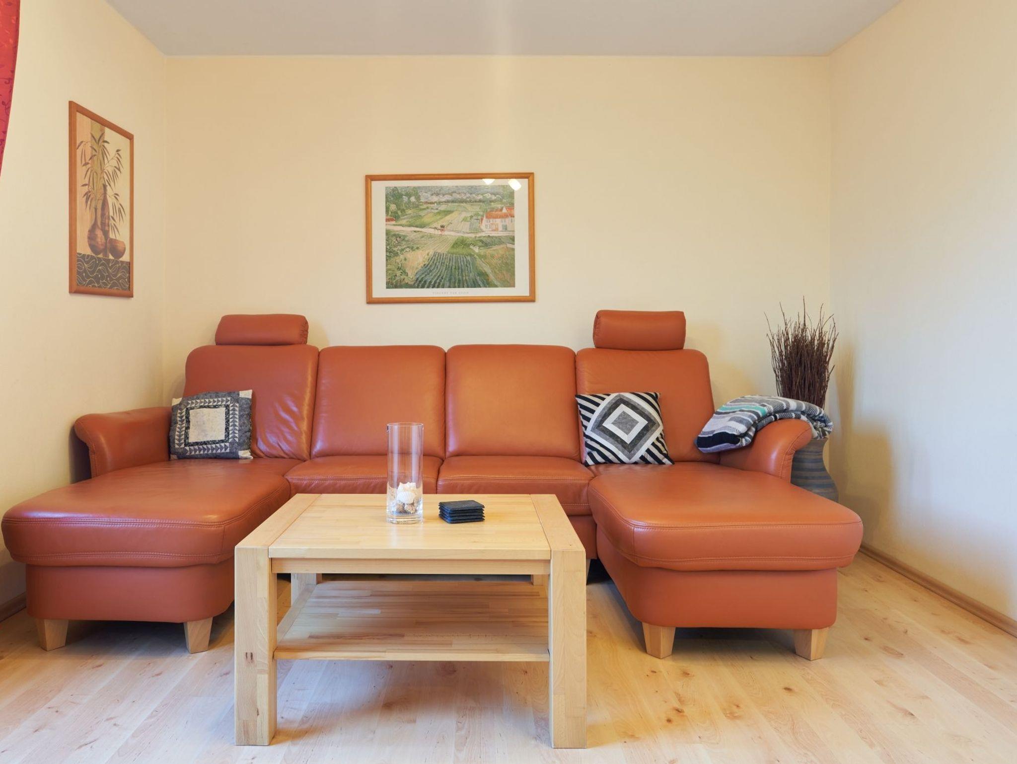 Das geräumige Wohnzimmer verfügt über SAT-TV, WLAN und einen CD-Player für Ihre Unterhaltung. Von hier aus haben Sie Zugang zur geschützten Terrasse (45 qm) mit Gartenmöbeln, wo Sie den Tag ausklingen lassen können.