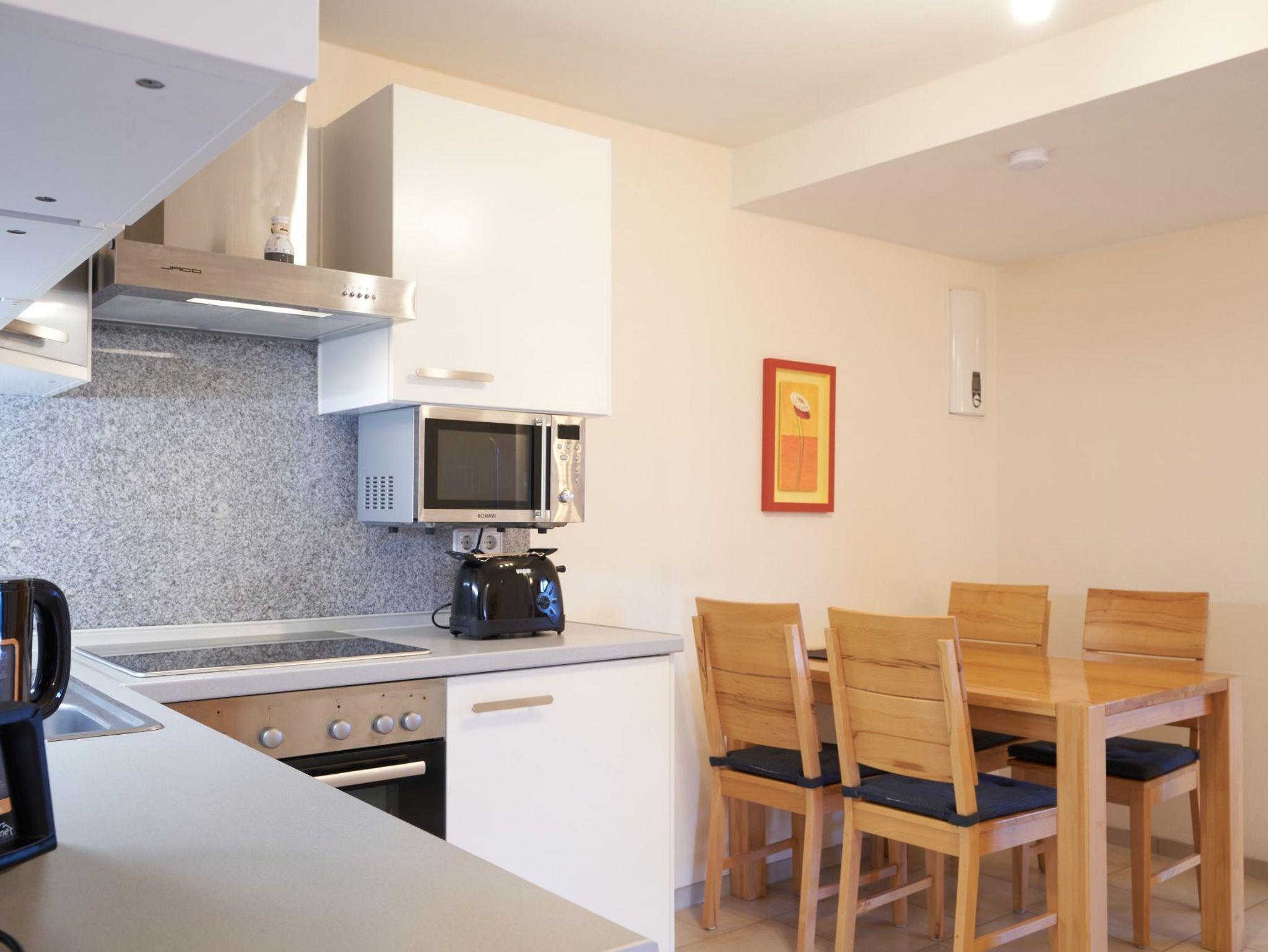 Die Küchenzeile ist perfekt ausgestattet mit Cerankochfeld, Backofen, Geschirrspüler, Mikrowelle und Kaffeemaschine (Filtergröße 4). Der Essbereich und das Duschbad runden das Bild ab.