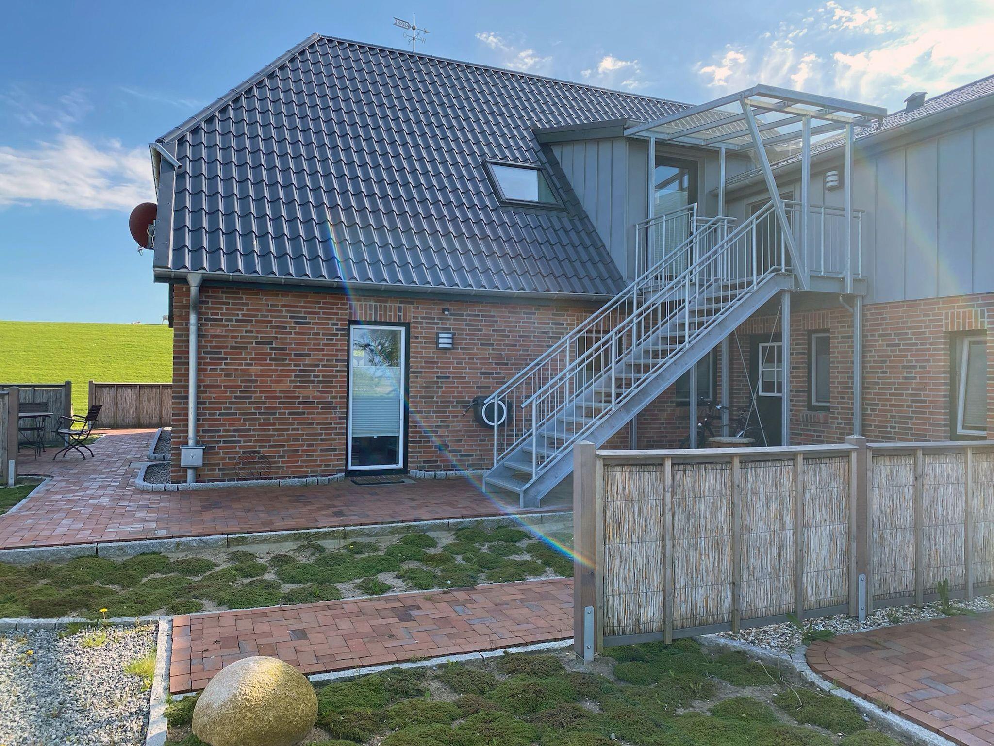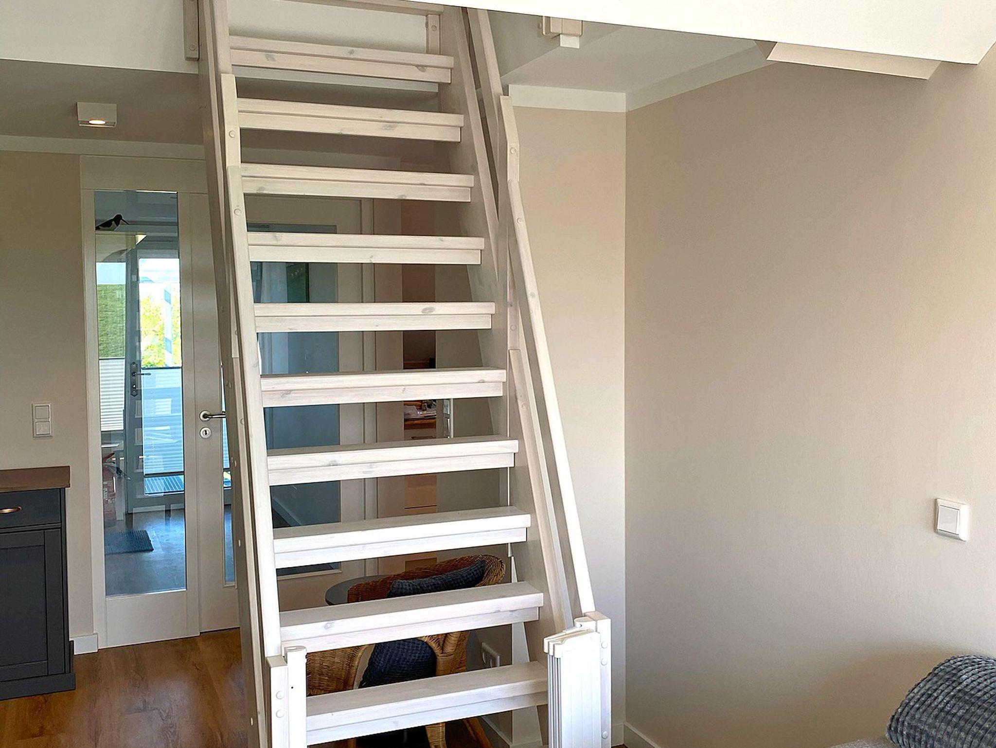 Über eine Außentreppe betreten Sie die Wohnung Austernfischer. Sie bietet Platz für bis zu 4 Erwachsene und 3 Kinder.
