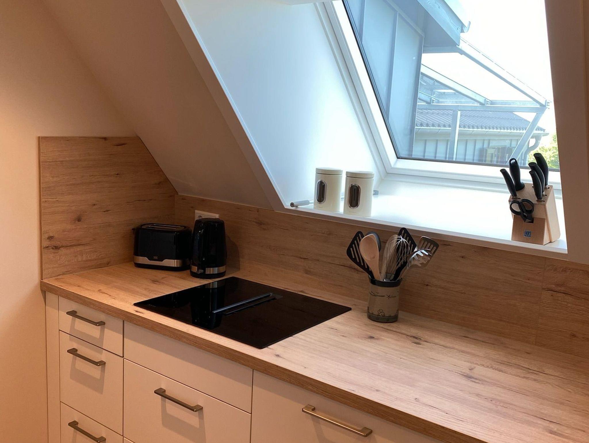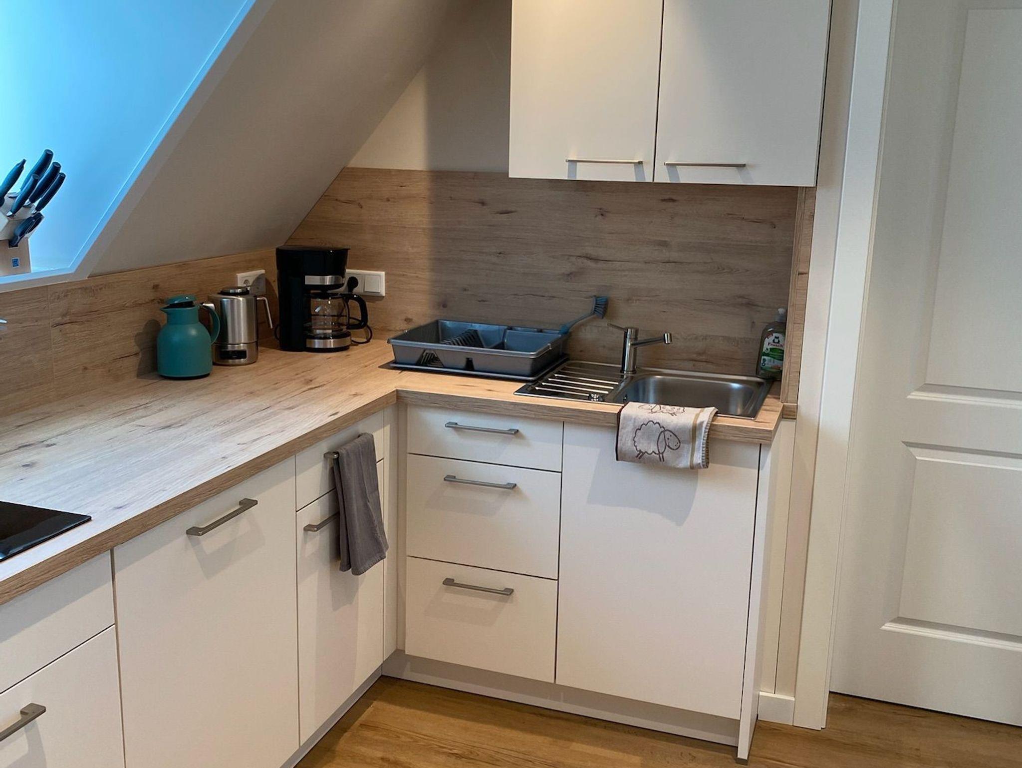 Der große Wohnraum, mit offener voll ausgestatteter Küche, wartet mit gemütlicher Couch, Smart-TV und Esstisch auf. Von dort aus geht es auch auf den Balkon mit Deichblick.