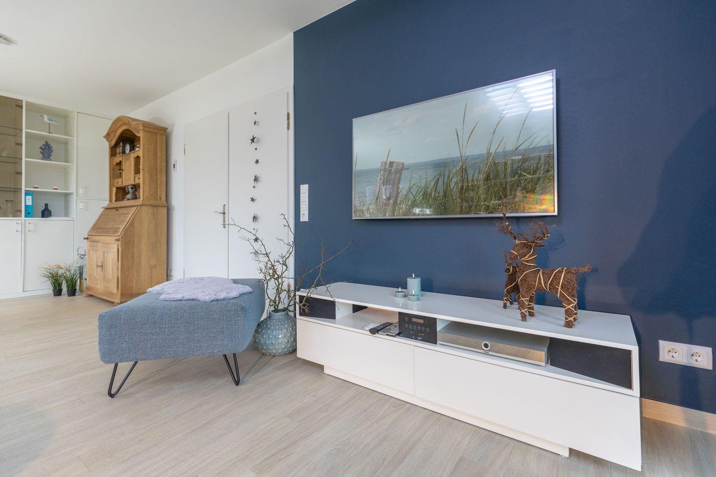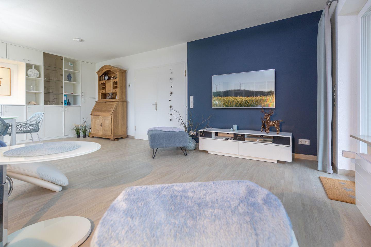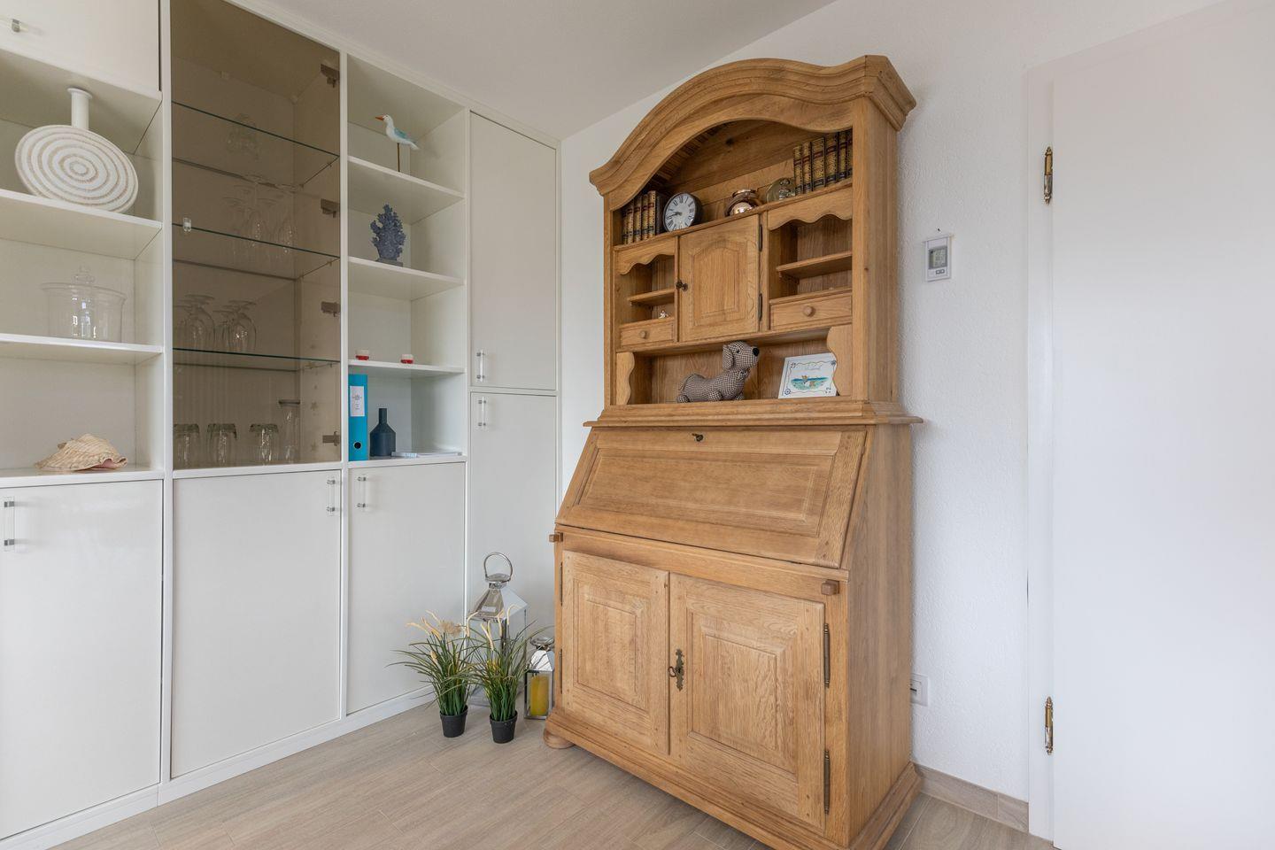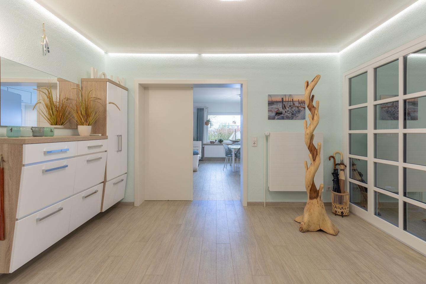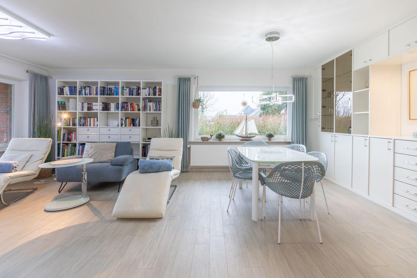 Das Ferienhaus empfängt Sie mit einem großen Flur mit Garderobe. Von hier aus gelangen Sie in den Wohn-Essbereich mit Zugang zur geschützten Terrasse. Das Wohnzimmer ist mit einem kleinen Sofa (nicht ausklappbar) und zwei bequemen Liegestühlen ausgestattet, von denen Sie entspannt das Programm auf dem großen internetfähigen Flachbildschirm-TV verfolgen können. Auch ein Blu-ray-Player mit einer Filmauswahl ist vorhanden. Bücherfreunden steht eine große Bibliothek zur Verfügung.