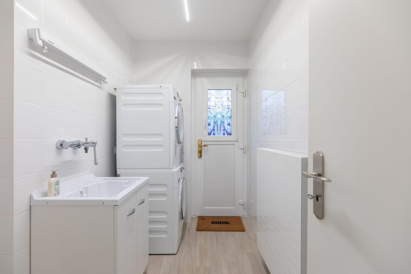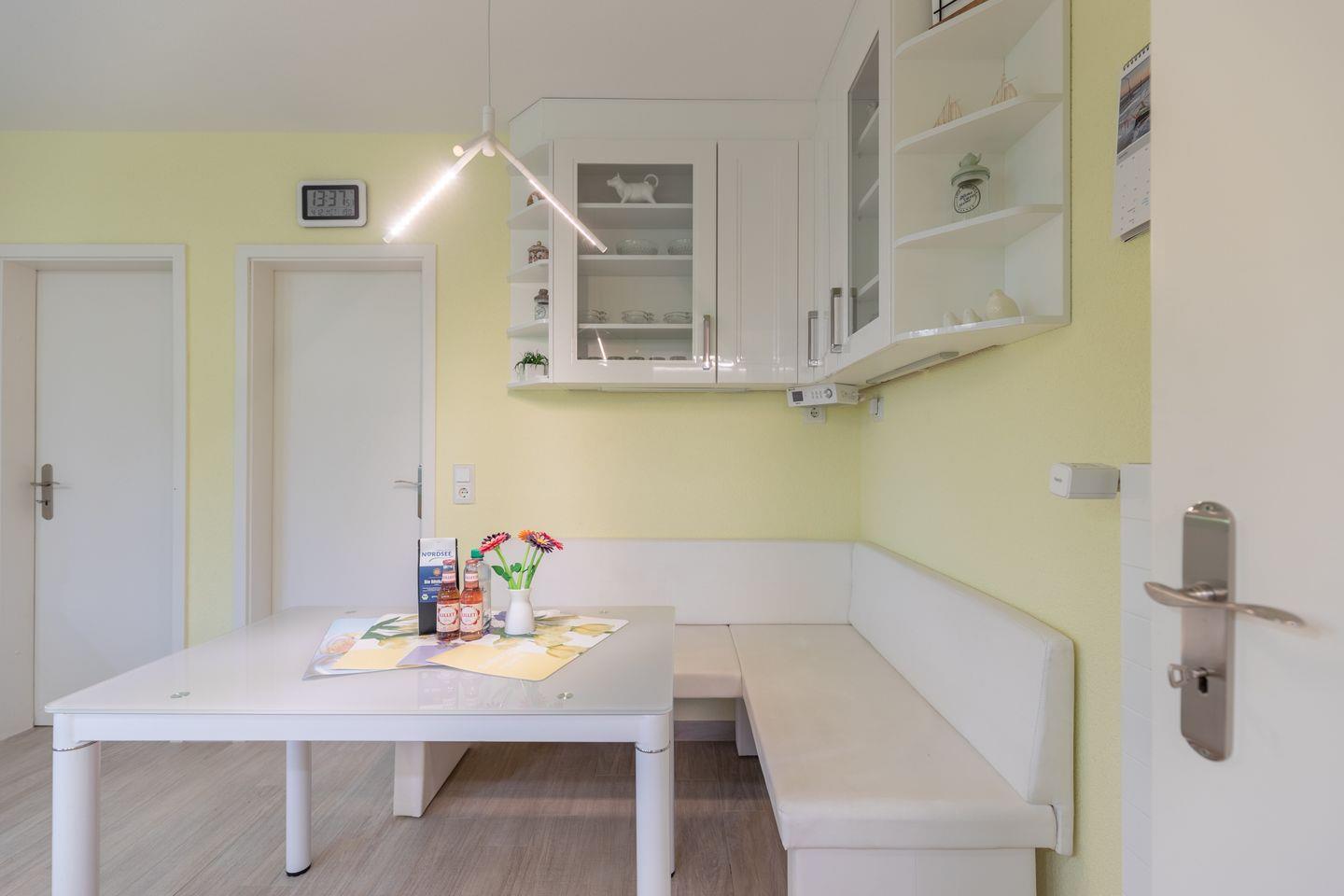 Die geschlossene Küche ist sehr komfortabel eingerichtet: Sitzecke, Ceranfeld, Backofen, Geschirrspülmaschine, Mikrowelle, Kühl- und Gefrierschrank, Senseo und Kaffeemaschine (Filtergröße 4). In einem Hauswirtschaftsraum stehen eine Waschmaschine und ein Trockner für Sie bereit.