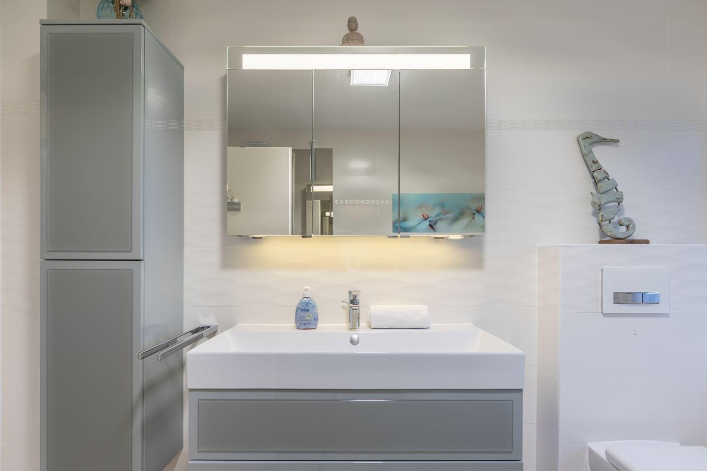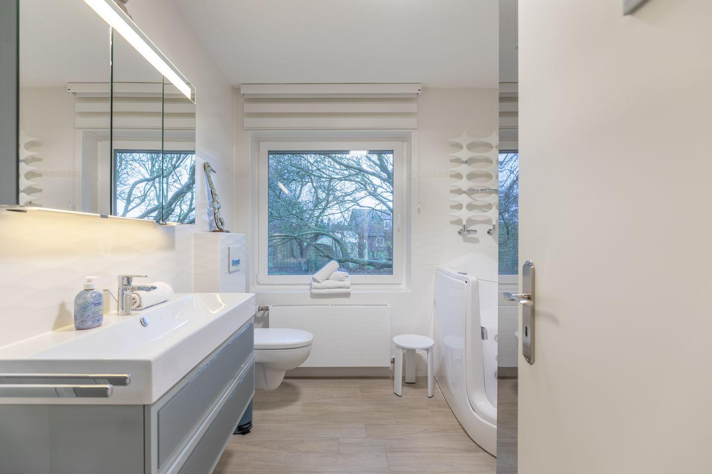 Das moderne Badezimmer ist mit einer ebenerdigen Dusche, einer Sitzbadewanne, WC und Waschbecken eingerichtet.