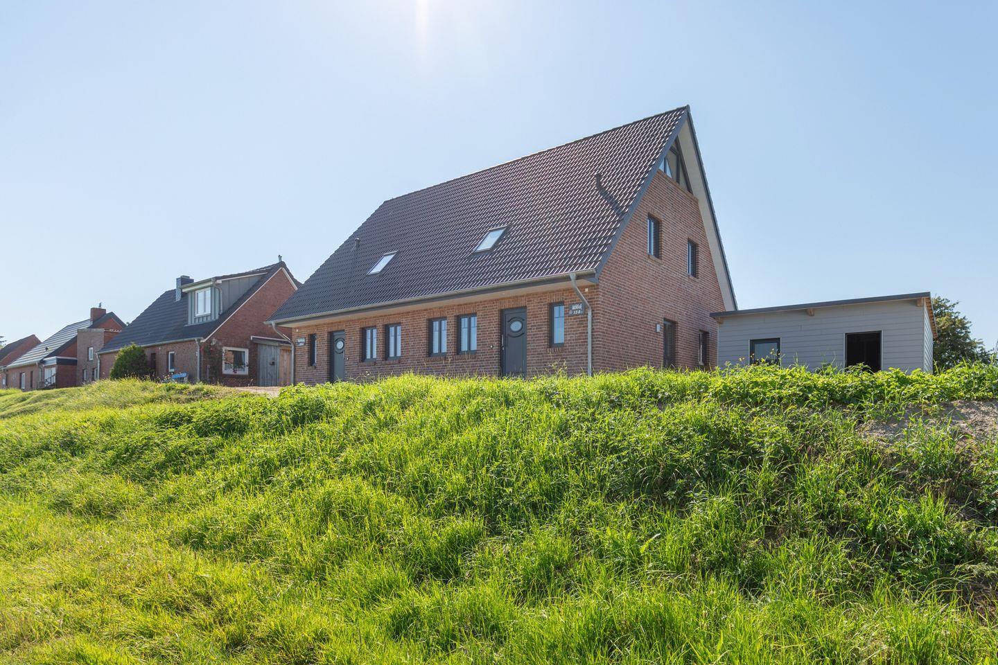 Nordseeurlaub direkt auf dem Deich – Genießen Sie die salzige Nordseeluft in unserer Doppelhaushälfte „Utblick" auf der Halbinsel Nordstrand. Bis zu vier Personen mit Hund finden in dieser modernen Unterkunft mit Sauna Platz.