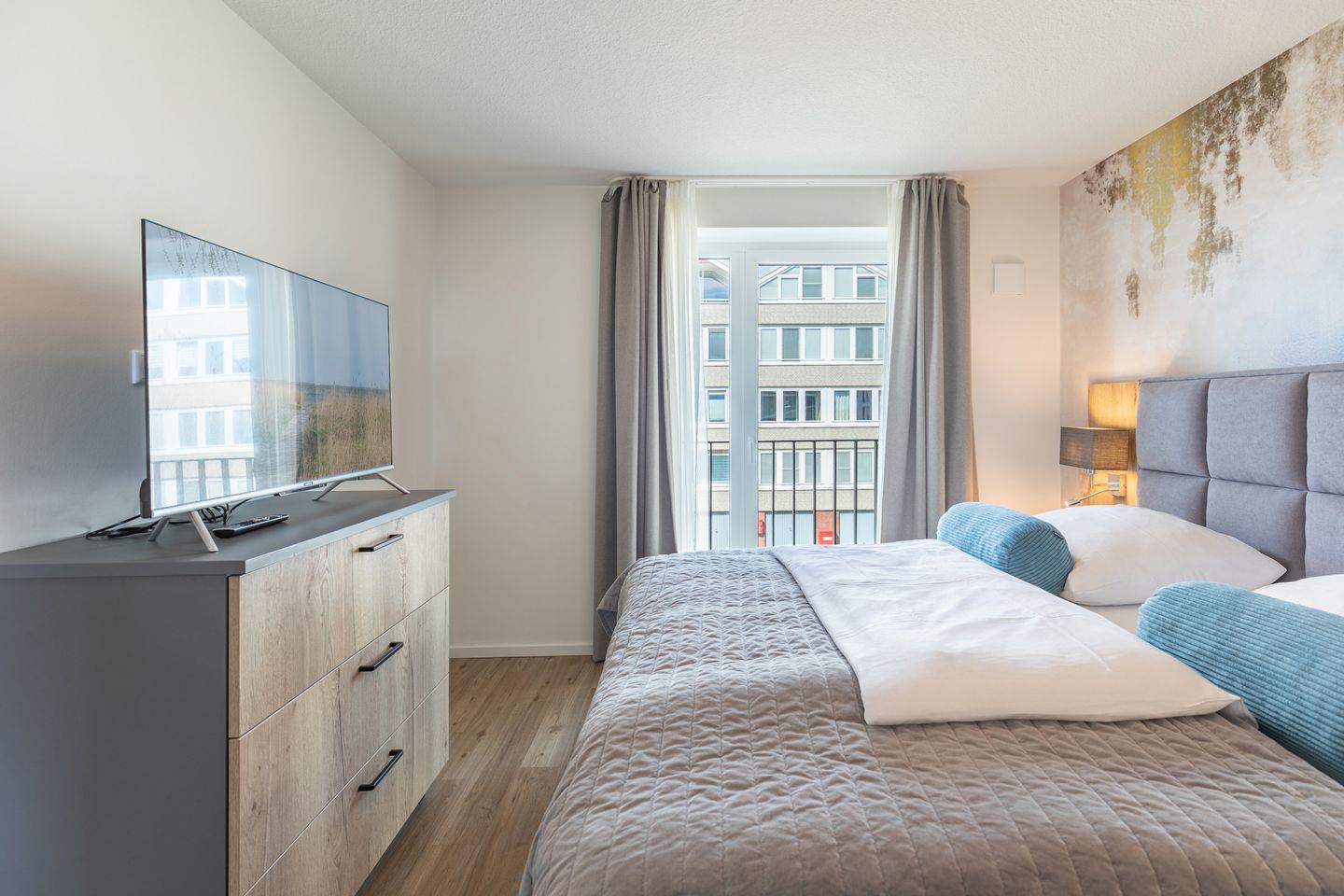 Die Wohnung verfügt über zwei separate Schlafzimmer mit komfortablen Schlafmöglichkeiten und hochwertigem Fliesenboden. Sie eignen sich ideal für Familien, Paare oder kleine Reisegruppen. Zwei moderne Badezimmer, ausgestattet mit bodengleichen Duschen, stilvollen Waschtischen, Fenstern und Haartrocknern, sorgen für zusätzlichen Komfort und Wohlbefinden.
