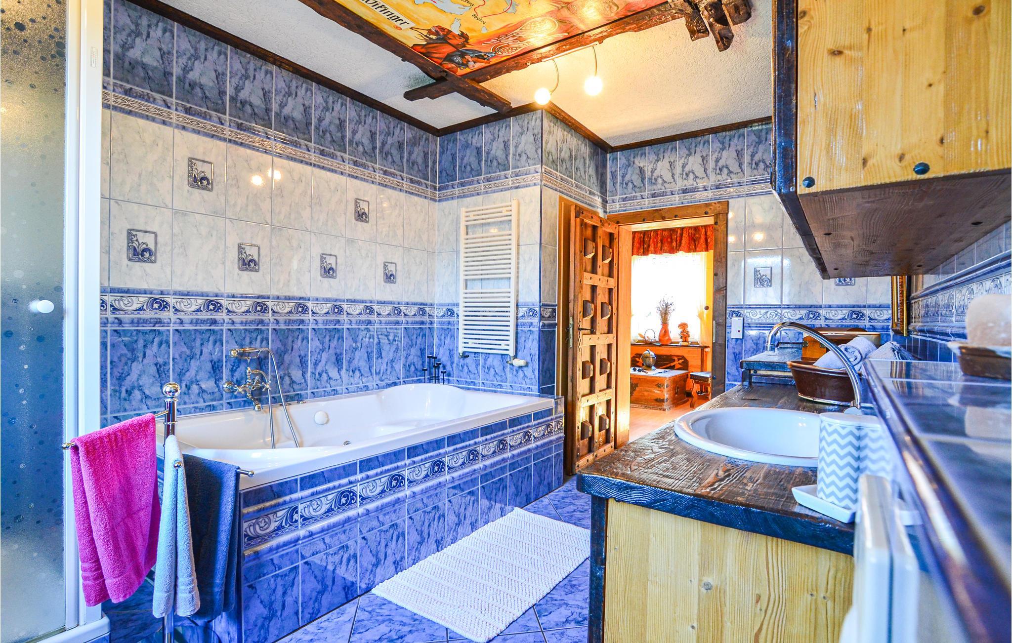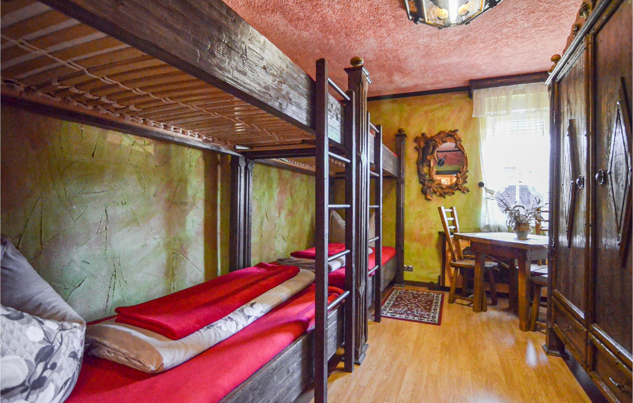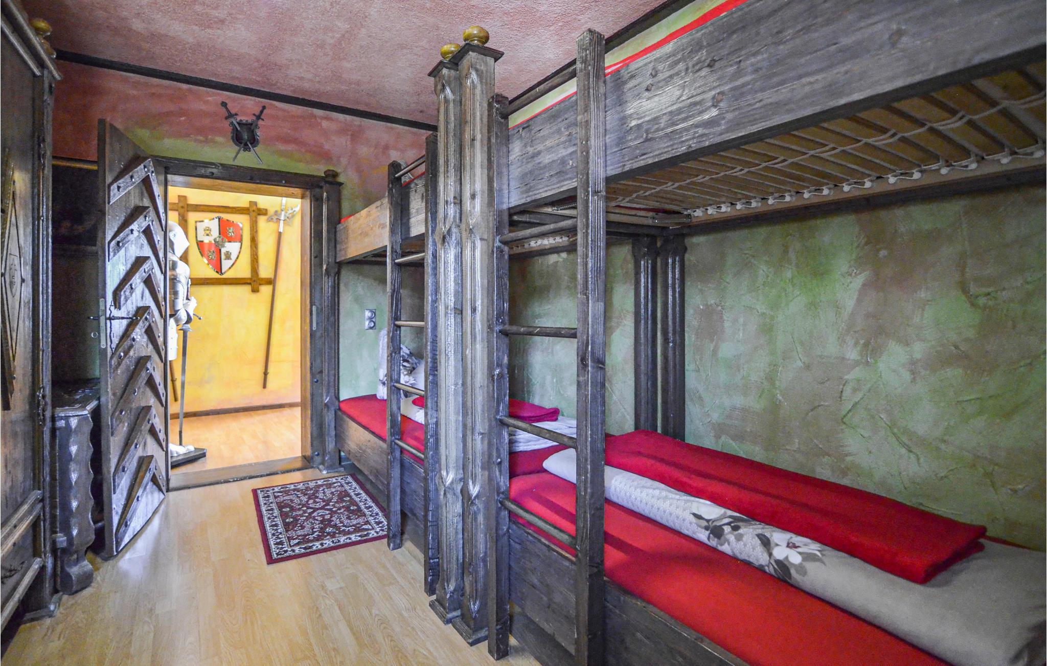 Die modern ausgestattete Küche im Wohnzimmer lässt keine Wünsche offen. Beim Betreten des Ferienhauses gelangen Sie zuerst über einen großzügigen Flur in das sehr schön gestaltete Bad mit Whirlpool, danach in ein Schlafzimmer mit einem Himmelbett für 2 Personen und schließlich in das Knappenzimmer mit 4 Etagenbetten.
