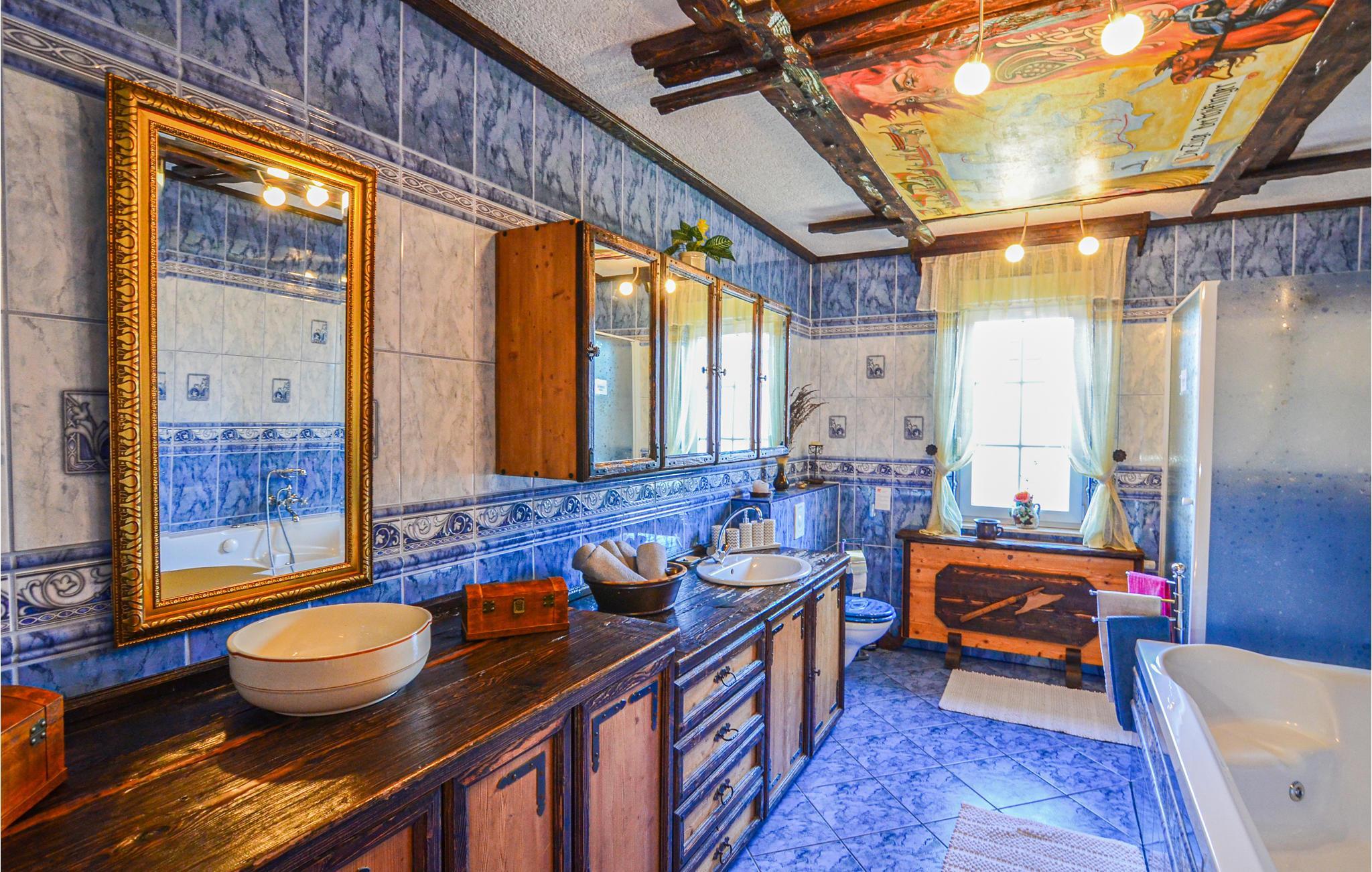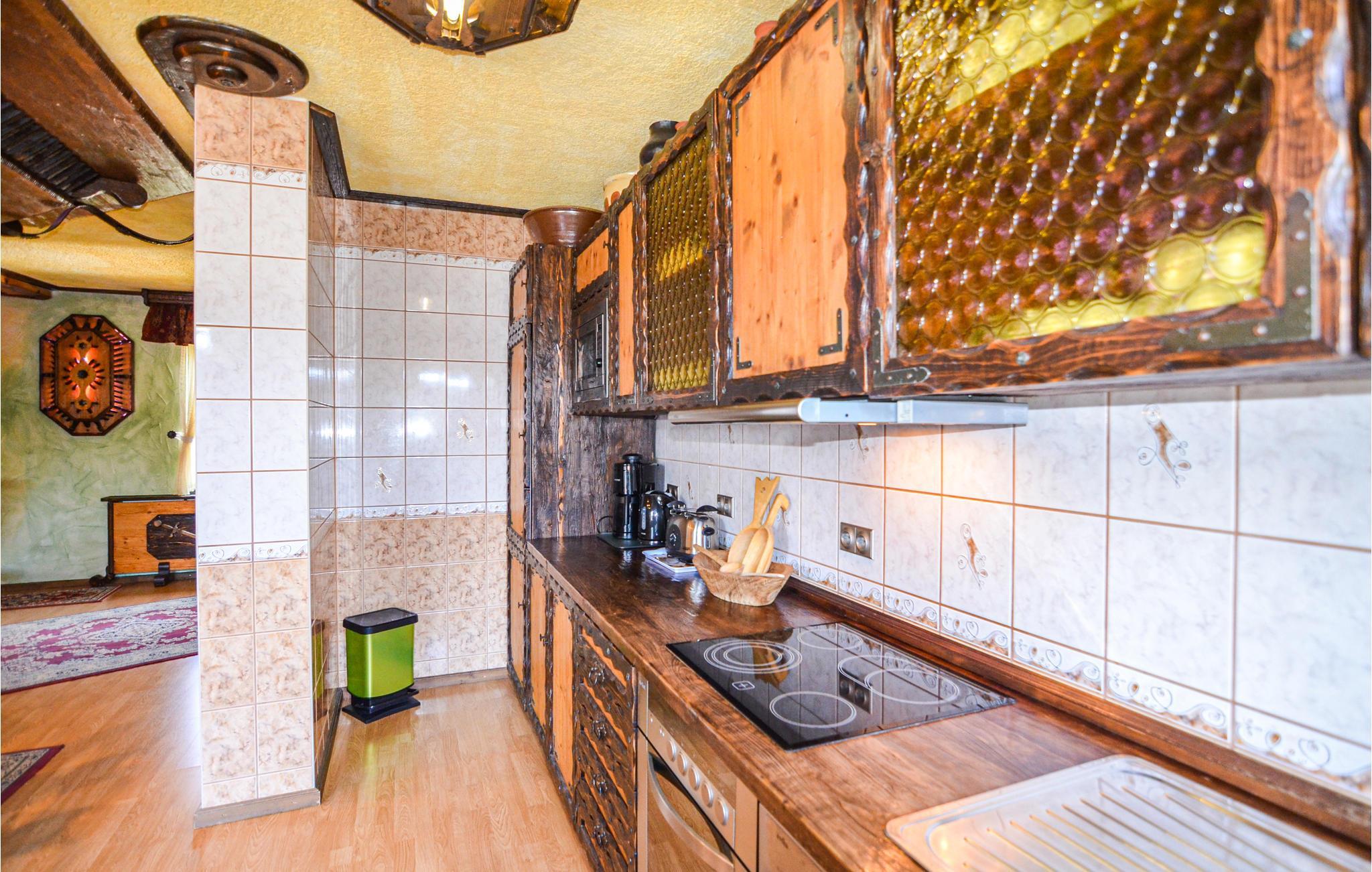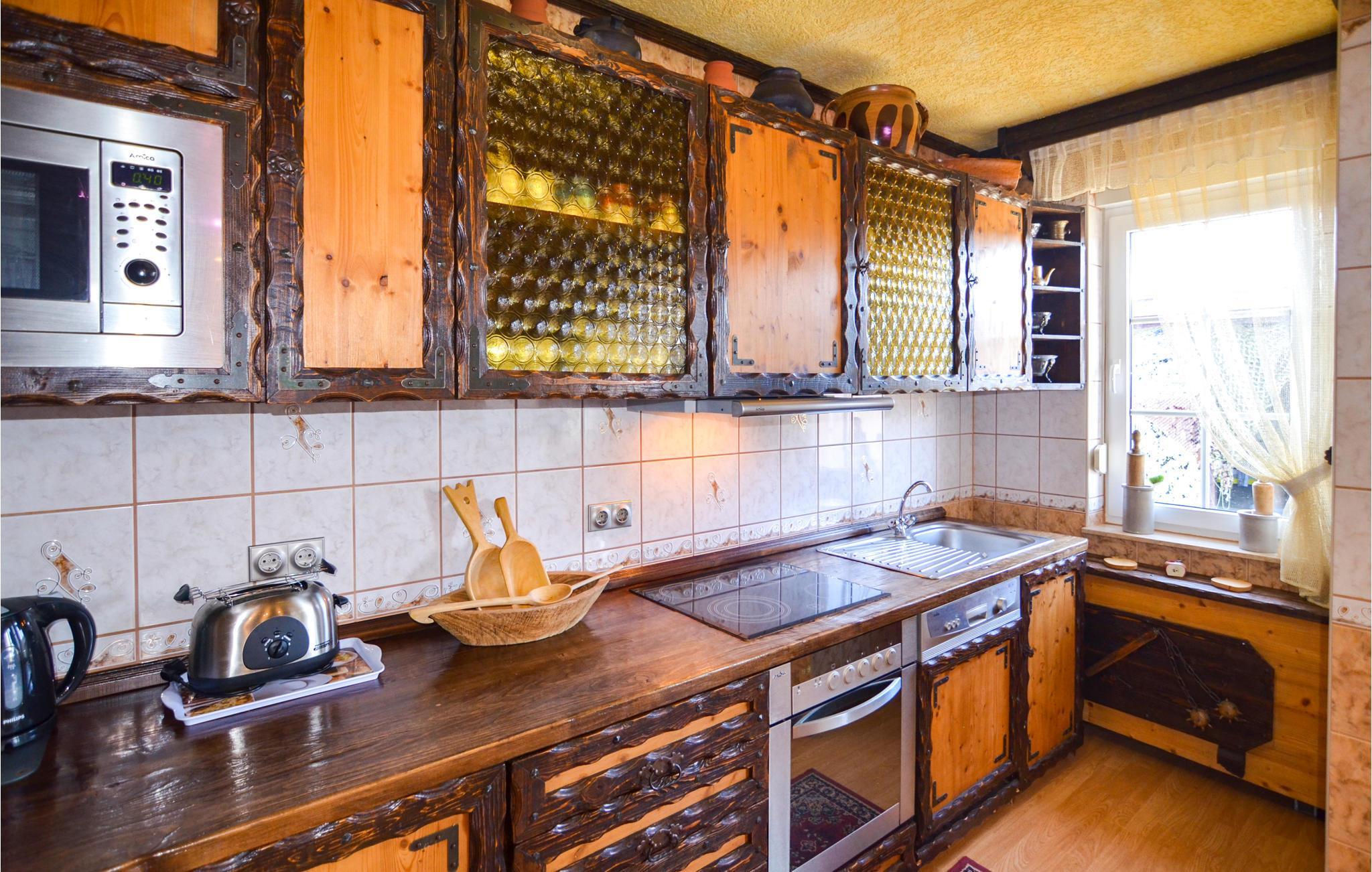 Die modern ausgestattete Küche im Wohnzimmer lässt keine Wünsche offen. Beim Betreten des Ferienhauses gelangen Sie zuerst über einen großzügigen Flur in das sehr schön gestaltete Bad mit Whirlpool, danach in ein Schlafzimmer mit einem Himmelbett für 2 Personen und schließlich in das Knappenzimmer mit 4 Etagenbetten.
