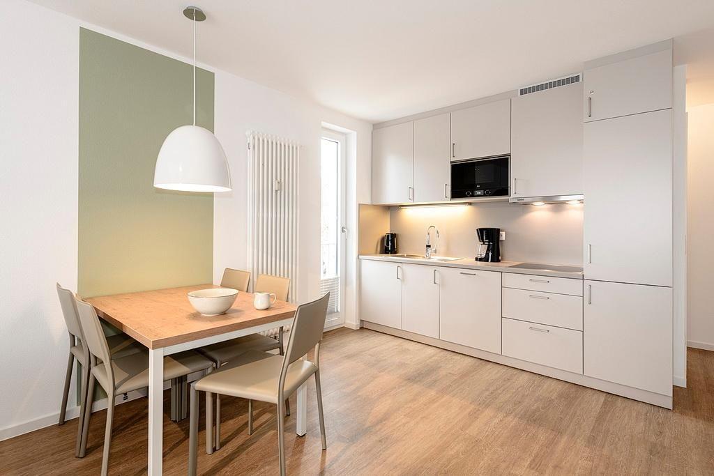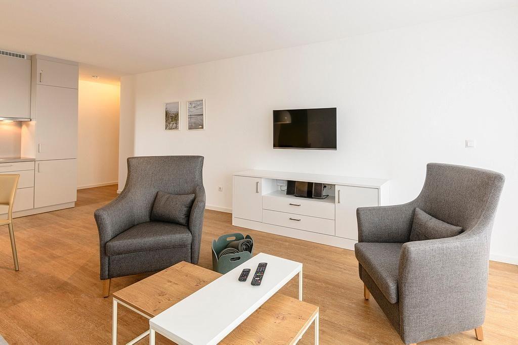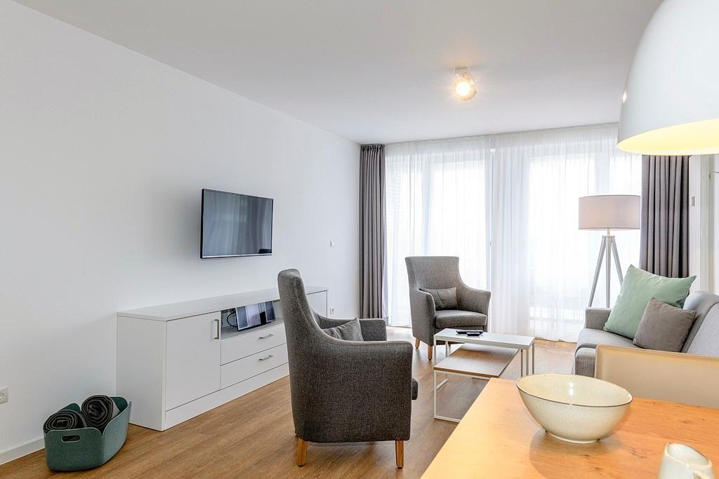 Das geschmackvoll eingerichtete Nichtraucher-Apartment verfügt über kostenfreies WLAN. Der Wohnbereich mit einer Schlafcouch bietet eine voll ausgestattete offene Küchenzeile mit Geschirrspüler, Gefrierfach, Kaffeemaschine, Toaster, Wasserkocher und Mikrowelle mit Backfunktion sowie einen großen Flatscreen-TV und ein Radio. Das Apartment verfügt über einen Esstisch für 5 Personen und einen behaglichen Sitzbereich. Zwei separate Schlafzimmer stehen Ihnen zur Verfügung. Eines davon verfügt über ein Doppelbett und einen eigenen Flatscreen-TV, ein weiteres über ein Etagenbett. Ein Kinderbett kann gegen Entgelt aufgestellt werden. Im stilvollen Badezimmer befinden sich eine große begehbare Dusche sowie ein Waschtisch mit Föhn und Kosmetikspiegel. Nach einem erlebnisreichen Urlaubstag lässt es sich auf dem überdachten und mit Gartenmöbeln ausgestatteten Balkon wunderbar entspannen.