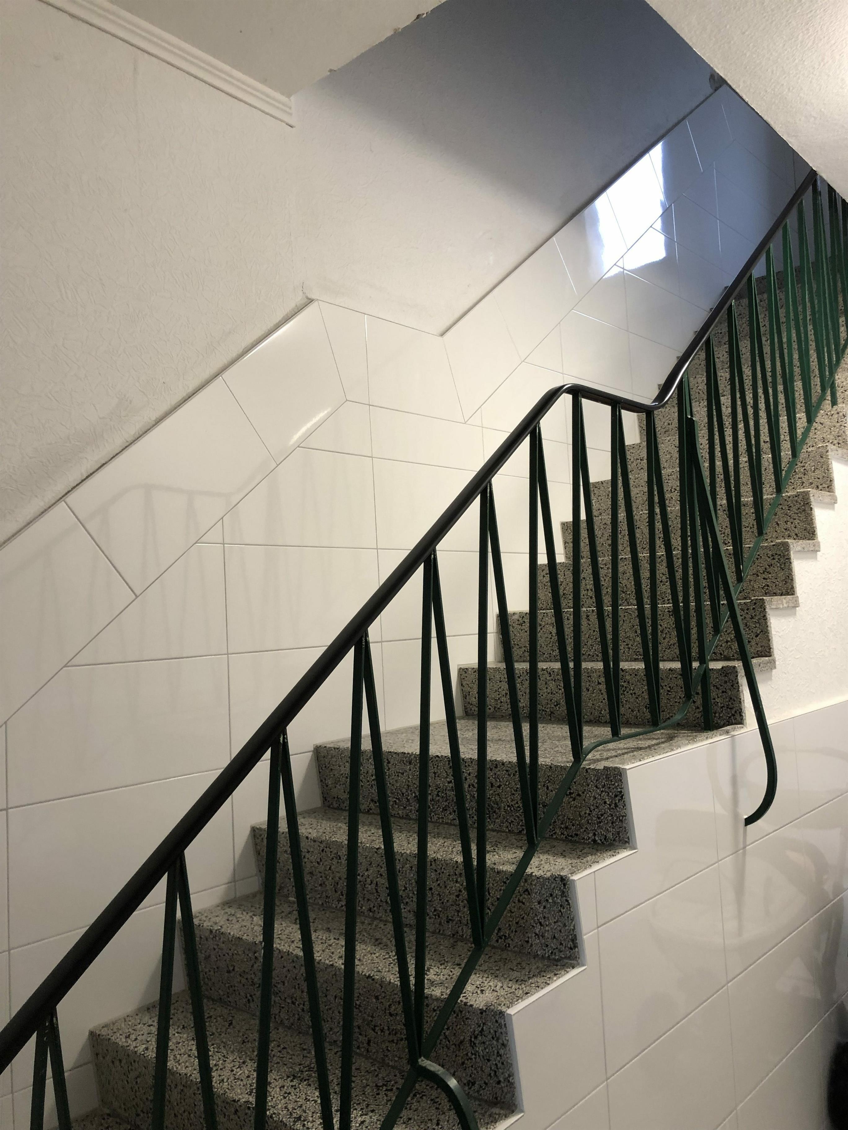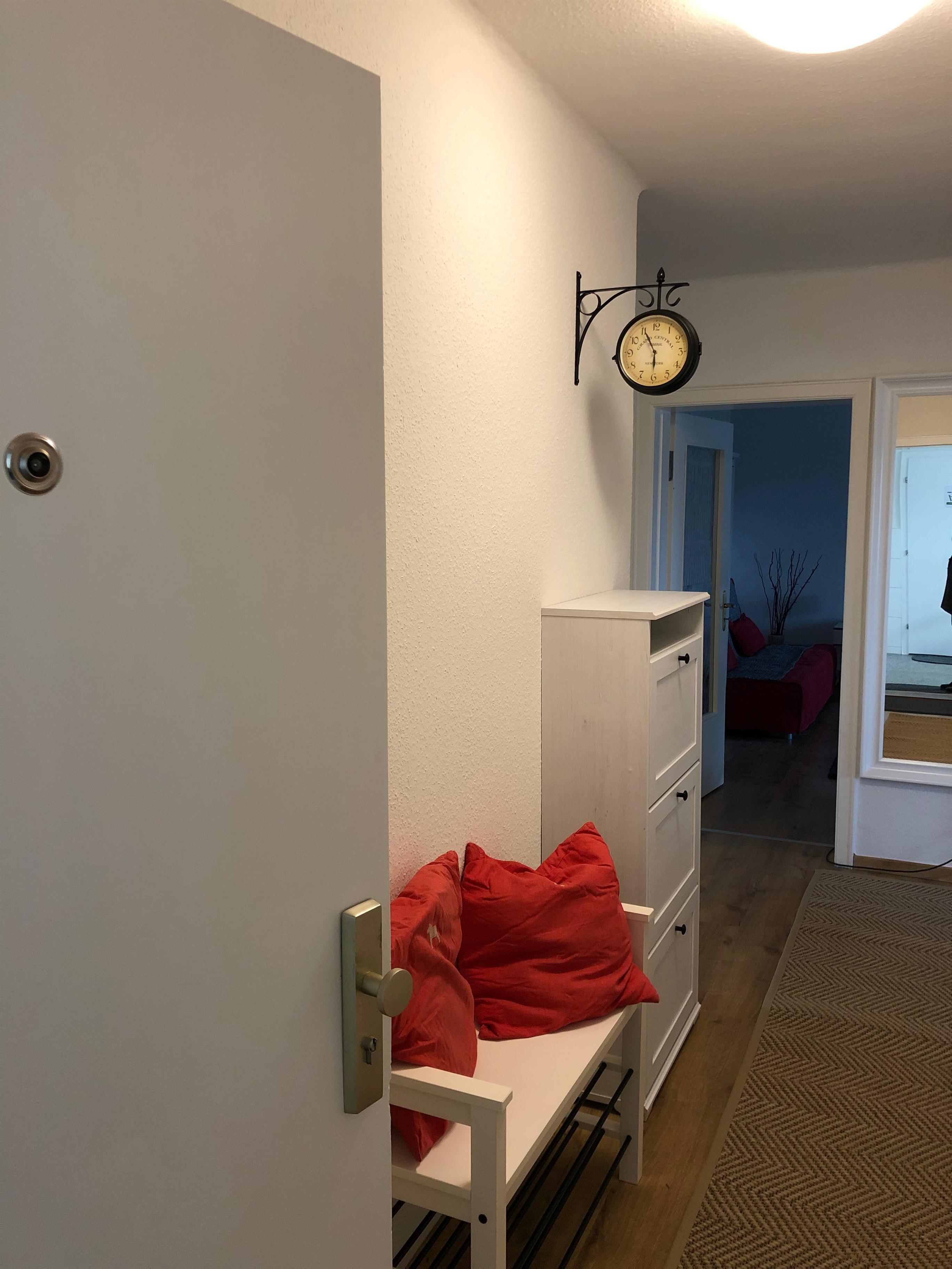 Sie befindet sich in der ersten Etage und ist nur über eine Treppe erreichbar. Über den gemeinsam genutzten Treppenflur, der mit einer weiteren Ferienwohnung geteilt wird, gelangt man in den langen Flur der Wohnung, von dem aus die drei Zimmer abgehen. Die moderne Küche verfügt über ein Ceran-Kochfeld, einen Backofen, einen Kühlschrank, einen Geschirrspüler, eine Mikrowelle, eine Kaffeemaschine, einen Toaster, einen Wasserkocher und bietet Platz für sechs Personen an der gemütlichen Sitzecke. Das Badezimmer ist direkt angeschlossen. Es bietet eine geräumige Duschkabine, ein WC und ein Waschbecken.