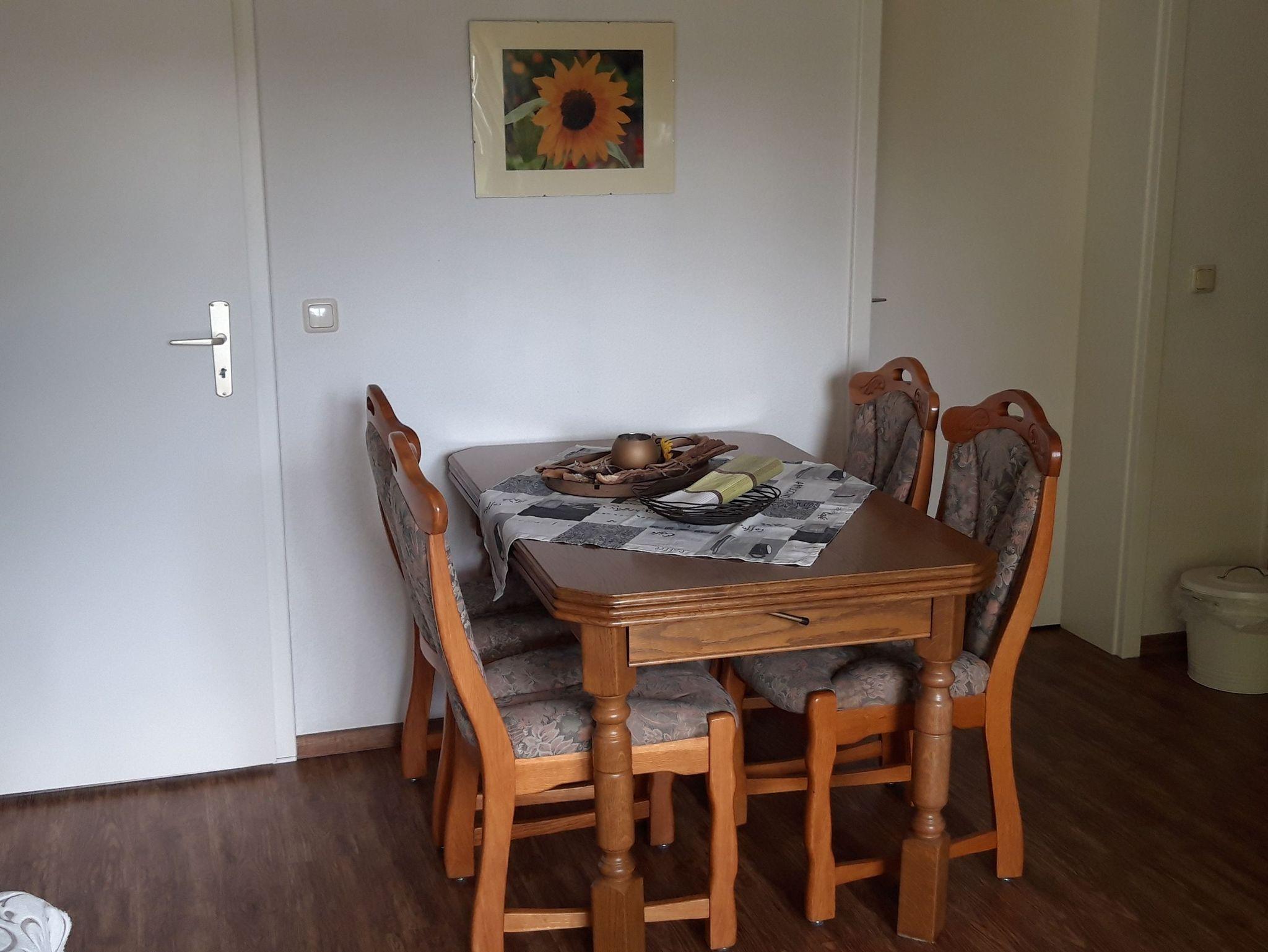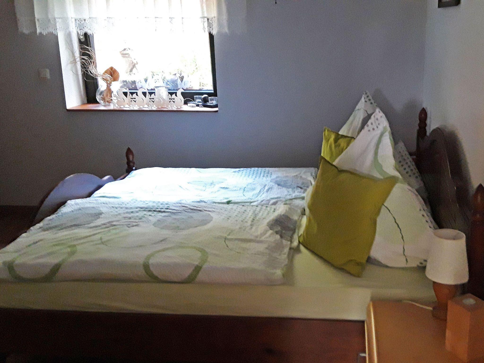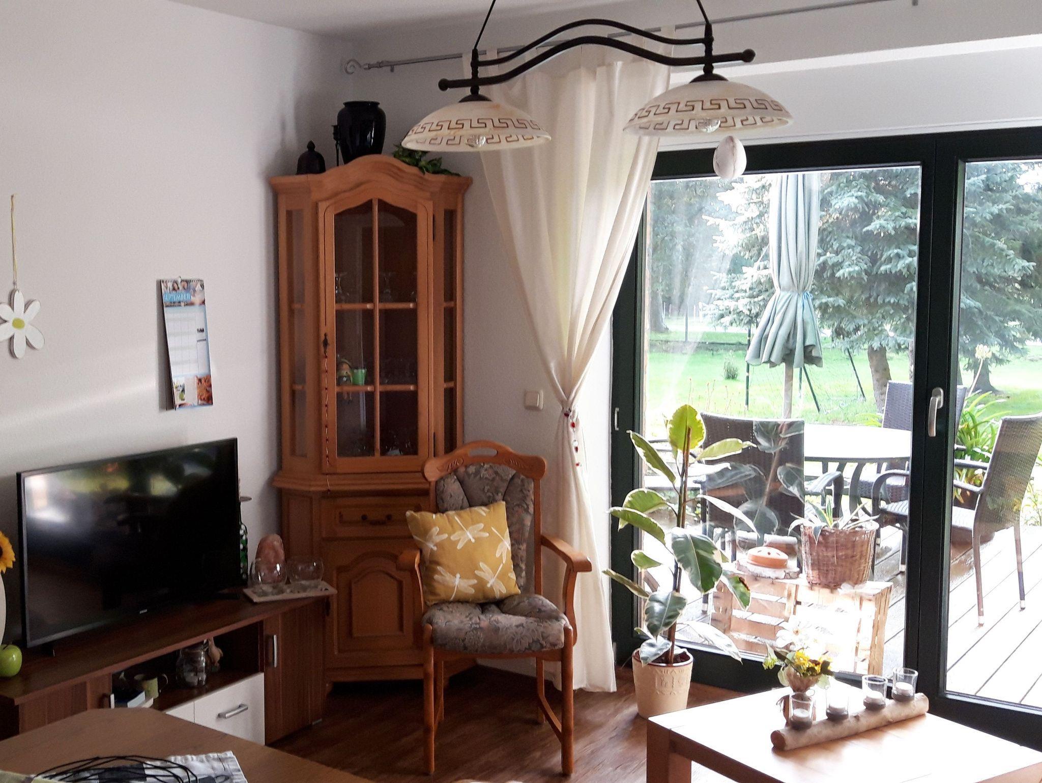 Die Ferienwohnung befindet sich in einem Einfamilienhaus direkt am Wald. Über einen eigenen Eingang betreten Sie die Erdgeschoss-Wohnung durch einen kleinen Flur. Im Wohnzimmer steht eine Couch gegenüber dem Fernseher sowie ein Esstisch nahe der offenen Küche. Vom Wohn- und Esszimmer kommen Sie direkt auf die große Terrasse mit dem schönen Naturblick. Im Schlafzimmer befindet sich neben dem Doppelbett ein 3-türiger Kleiderschrank mit Spiegel. Der dritte Gast kann auf dem klappbaren Gästebett (0,80m x 1,90m) schlafen, ein Kleinkind bis 2 Jahre im Kinderreisebett/Babybett kann kostenlos übernachten. Die Nichtraucherwohnung wird durch ein Duschbad mit WC komplettiert. WLan ist vorhanden, leider empfangen Sie nur das D1-Mobil-Netz. Alle Fenster der Ferienwohnung sind mit Außenrollläden ausgestattet. Ihre Räder haben Platz in einem Fahrrad-Abstellraum. Ihr Pkw parkt auf dem Grundstück am Haus.