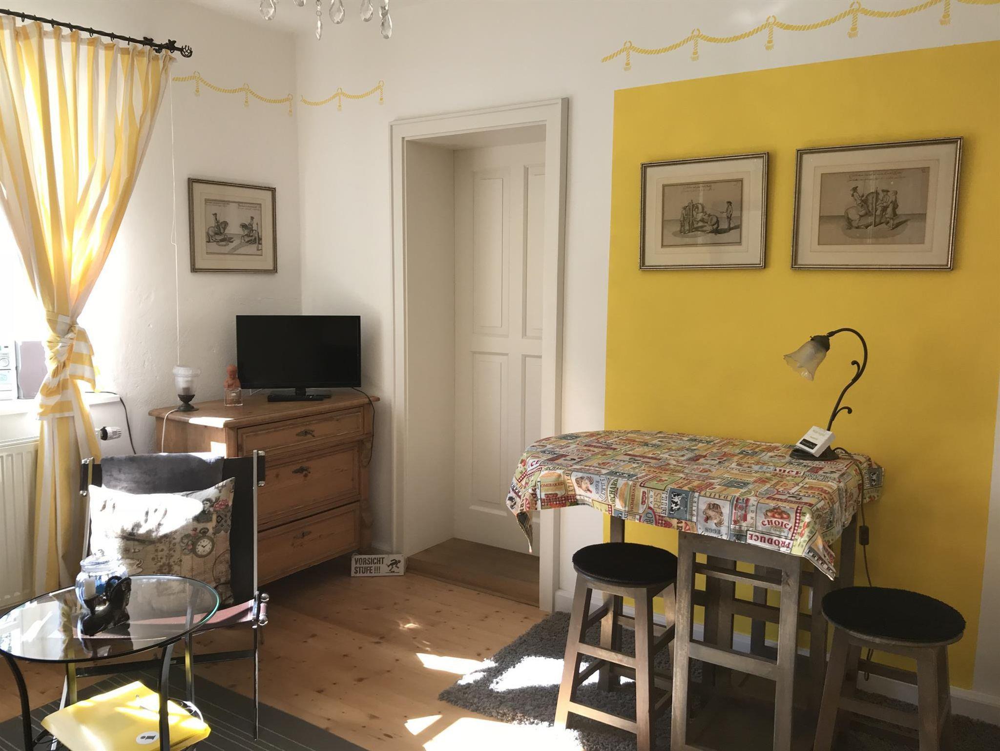 Die Ferienwohnung Sonnengelb liegt im Erdgeschoß, verfügt über ein originelles Wohnzimmer mit Sat-TV mit integrierter, moderner, voll ausgestatteter Küchenzeile, ein separates Schlafzimmer mit Doppelbett und ein Badezimmer mit Regendusche.