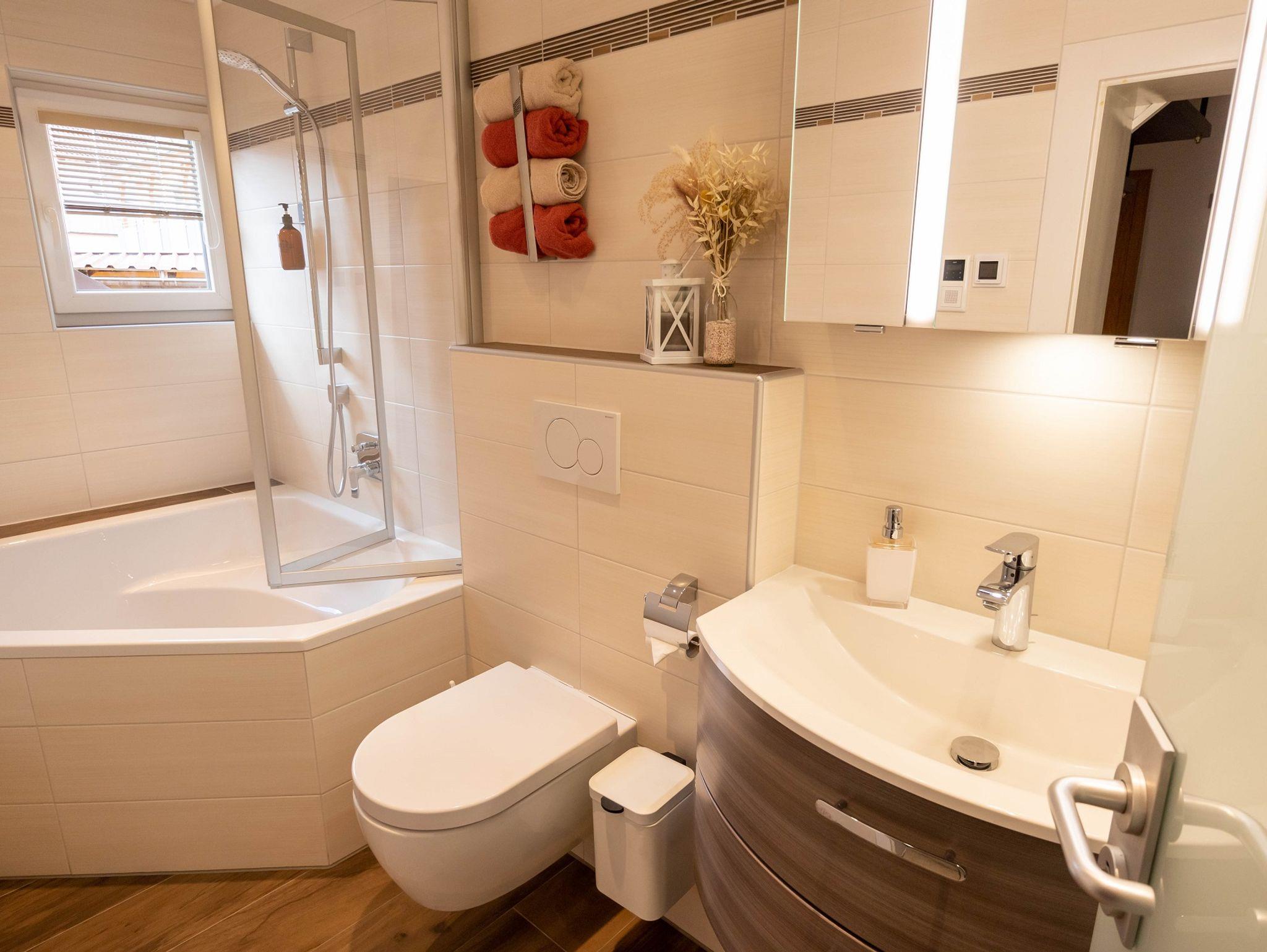 - Badezimmer mit Fußbodenheizung, einem eingebauten Wandradio und einer Duschbadewanne zum Relaxen inkl. Zahnputzbecher, Toilettenpapier, Seife, Duschgel/Shampoo, Föhn