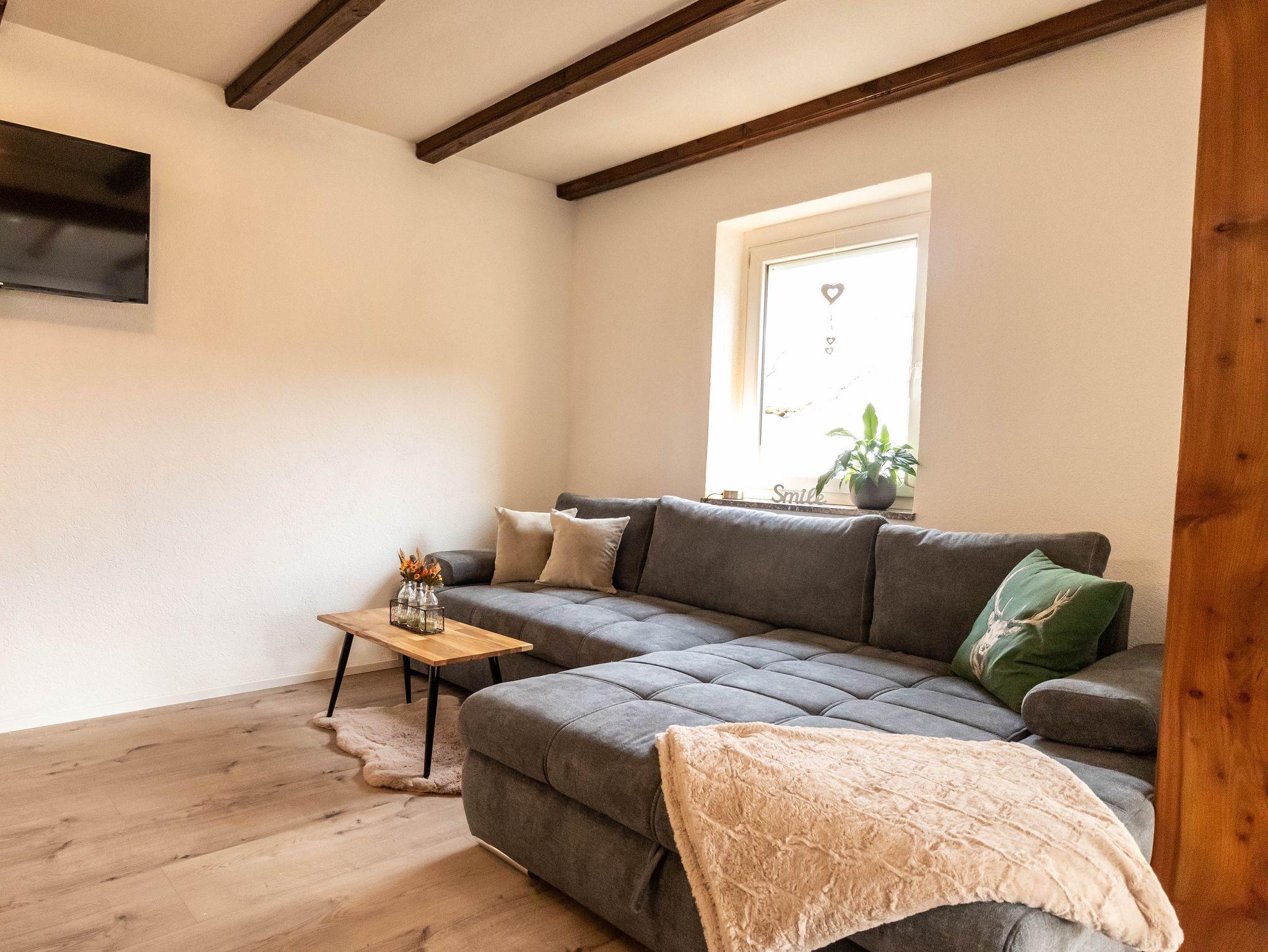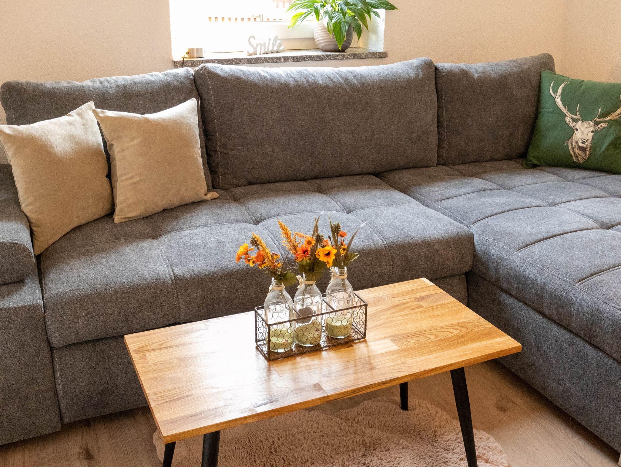 - großes, ausziehbares Sofa im Wohn- und Essbereich inkl. Smart-TV und Kuscheldecke,