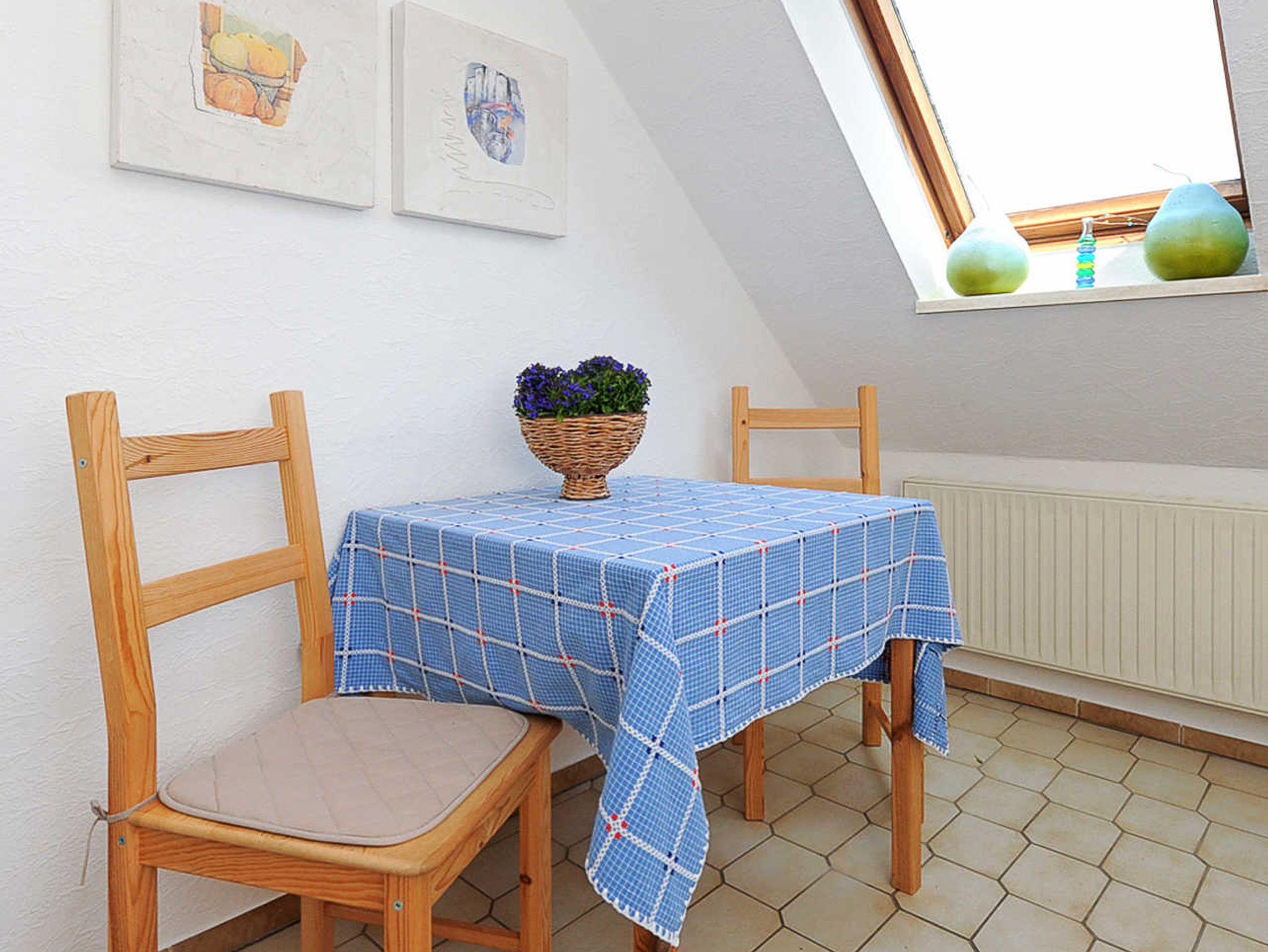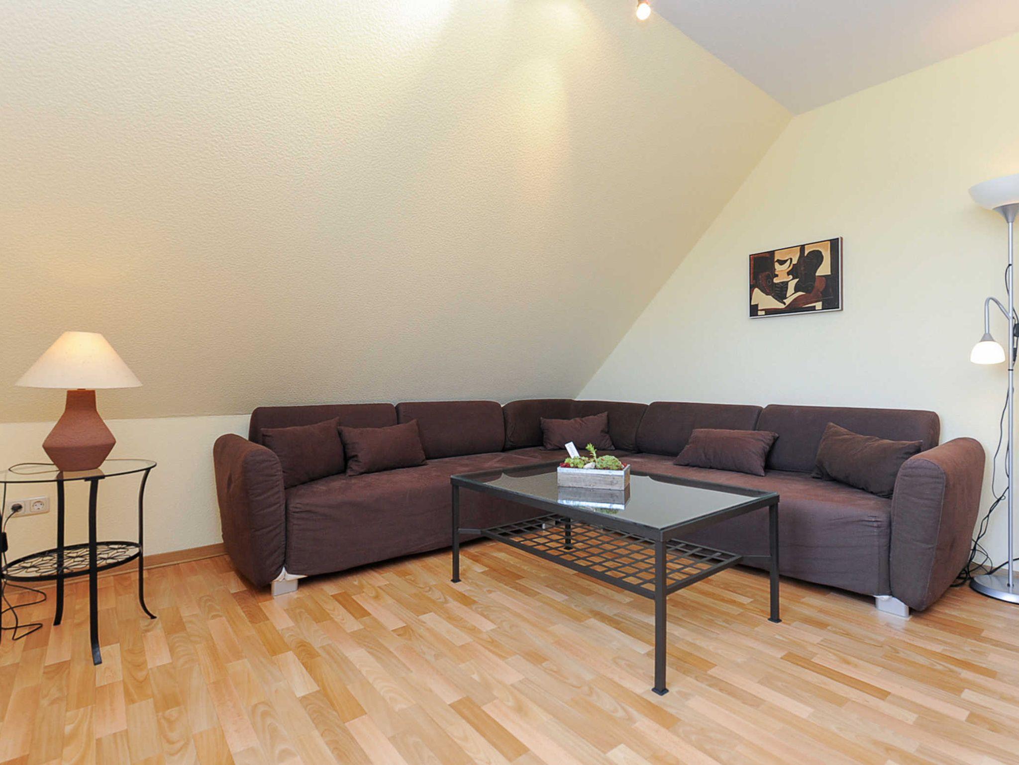 Größe ca. 50 Quadratmeter, Wohnzimmer, Küche, Schlafzimmer, Badezimmer mit Dusche, Waschtisch und WC, Obergeschoss, optimal für 2 Personen.