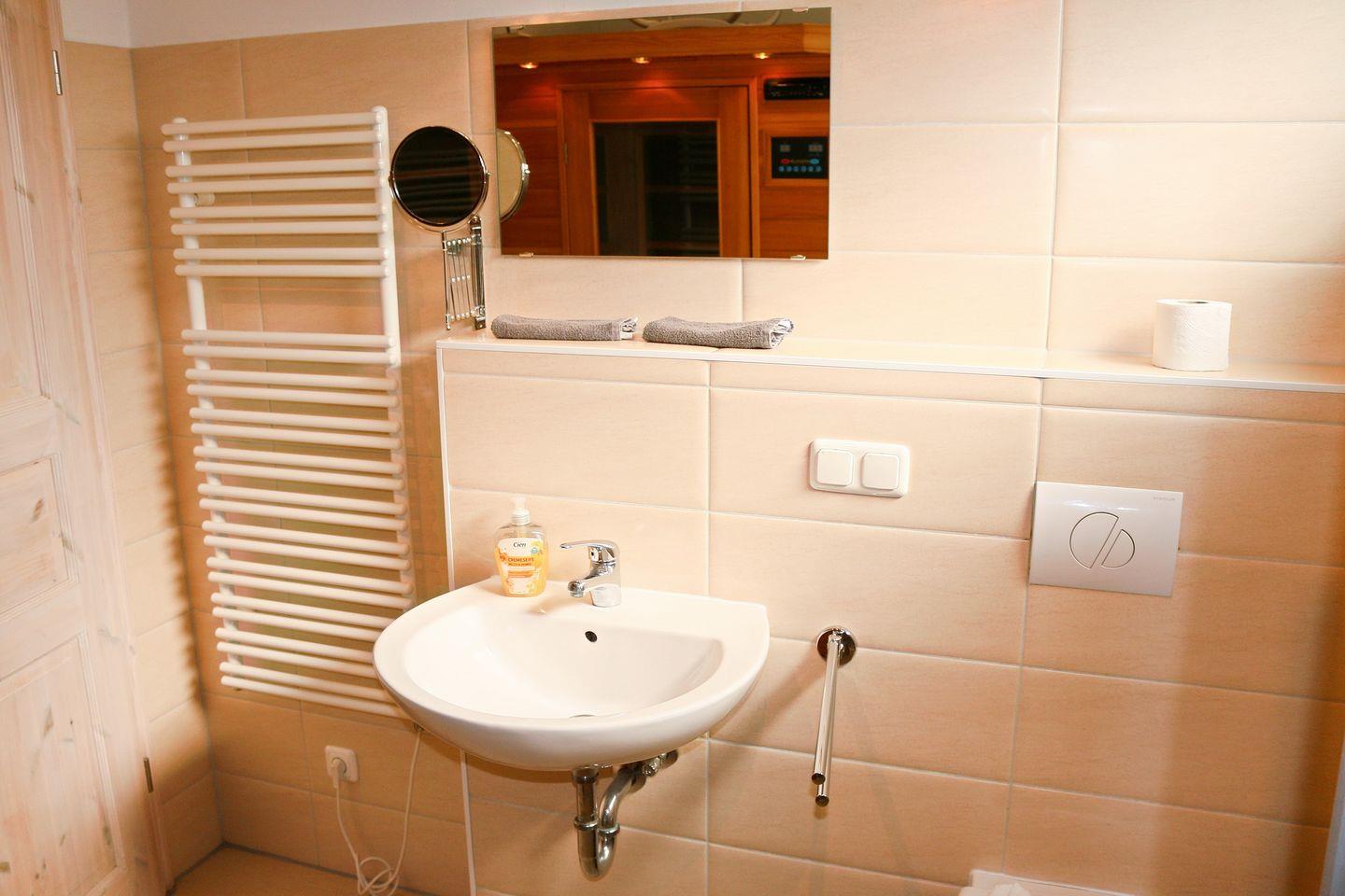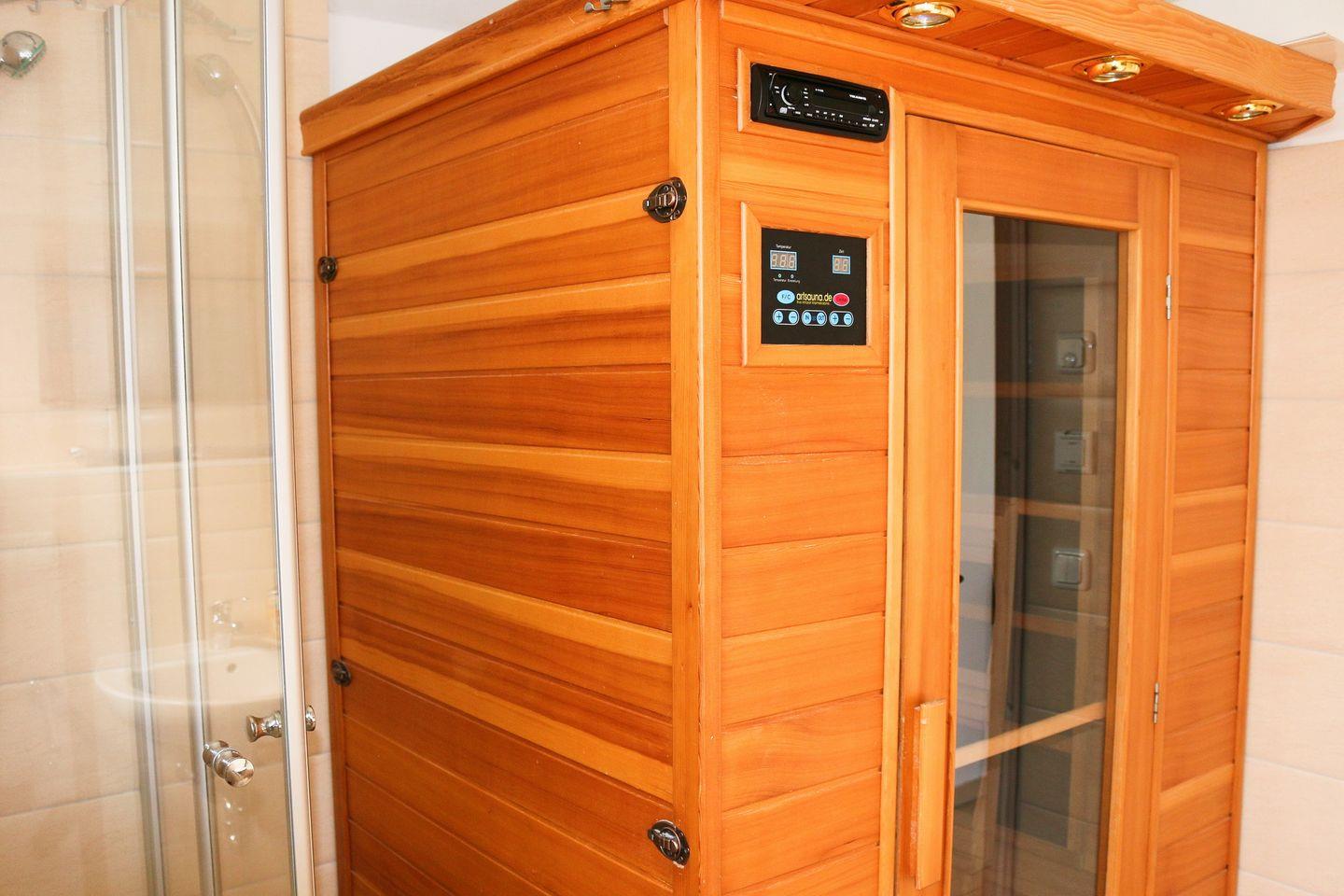 Ihr Feriendomizil verfügt über kostenfreies WLAN und besteht aus einem Schlafzimmer mit Doppelbett und TV, einem Wohnbereich mit großer Doppelschlafcouch (2,00 x 2,00 m), Flatscreen-TV und DVD-Player, HiFi-Anlage und Kaminofen (Kaminholz ist nicht inbegriffen), einem Bad mit Dusche und eigener Infrarotlichtsauna und aus einem Balkon mit idyllischem Blick in die Natur.